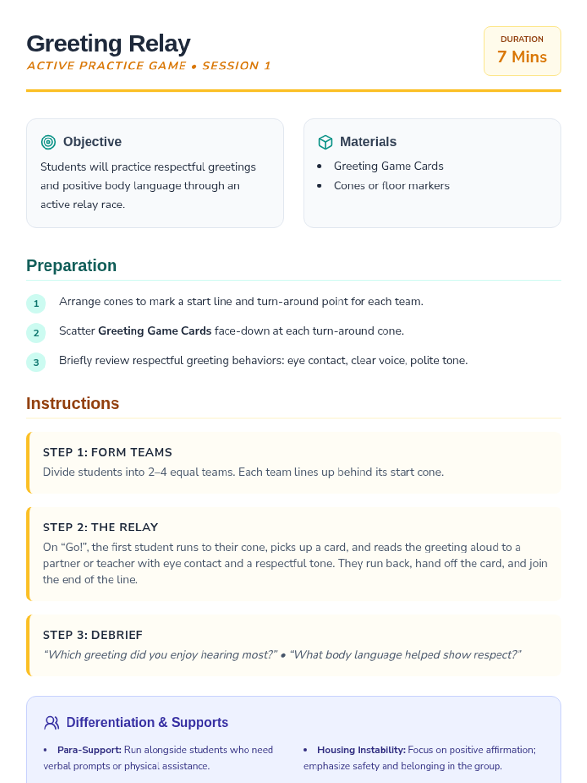 A high-energy Social Emotional Learning sequence focused on building collaboration, communication, and collective problem-solving skills through physical challenges and creative projects.