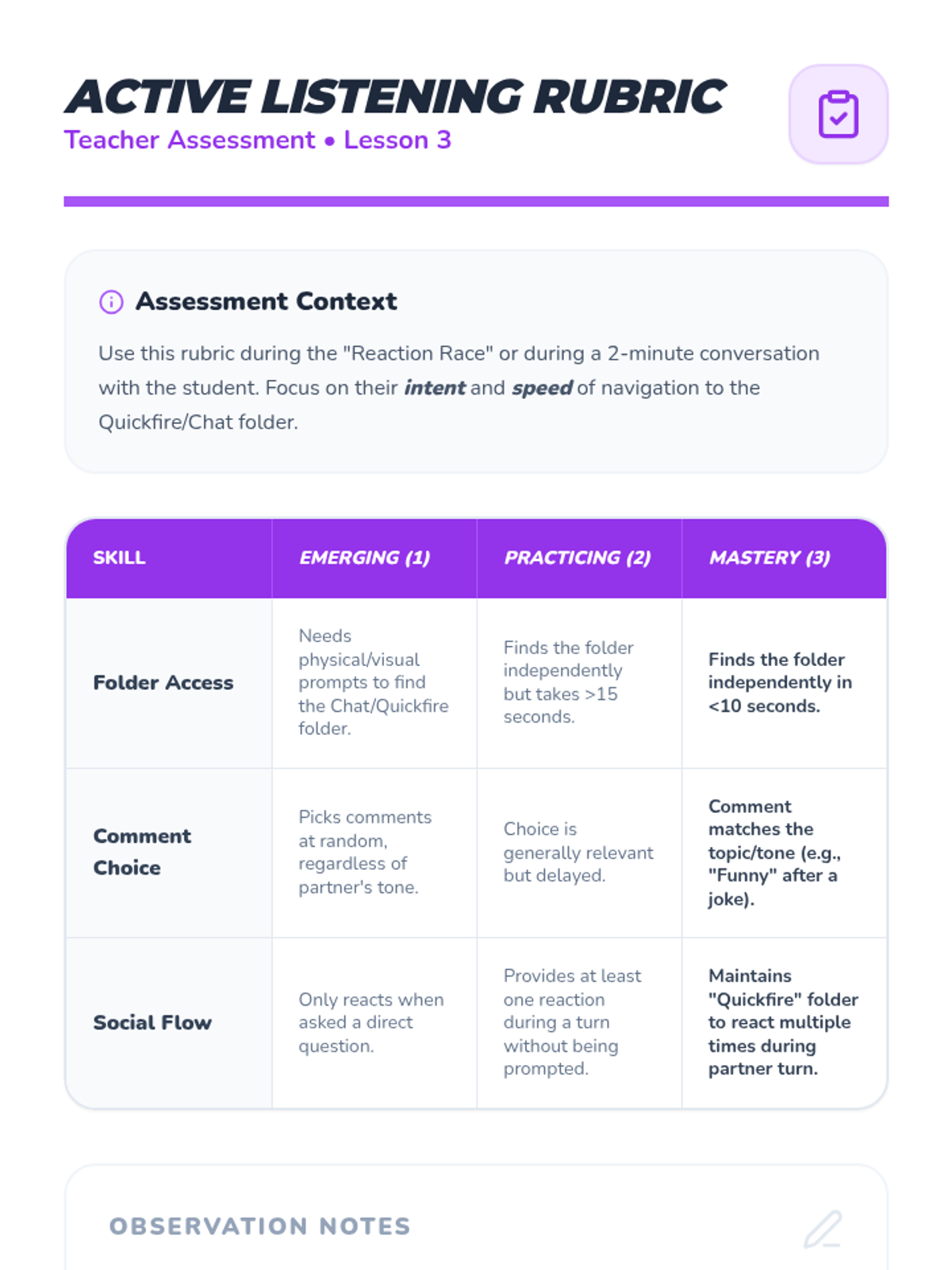 A series of three 10-minute 1-to-1 social skills sessions designed to help a student navigate classroom communication, specifically focusing on story-timing, being called on, and asking questions during work time.