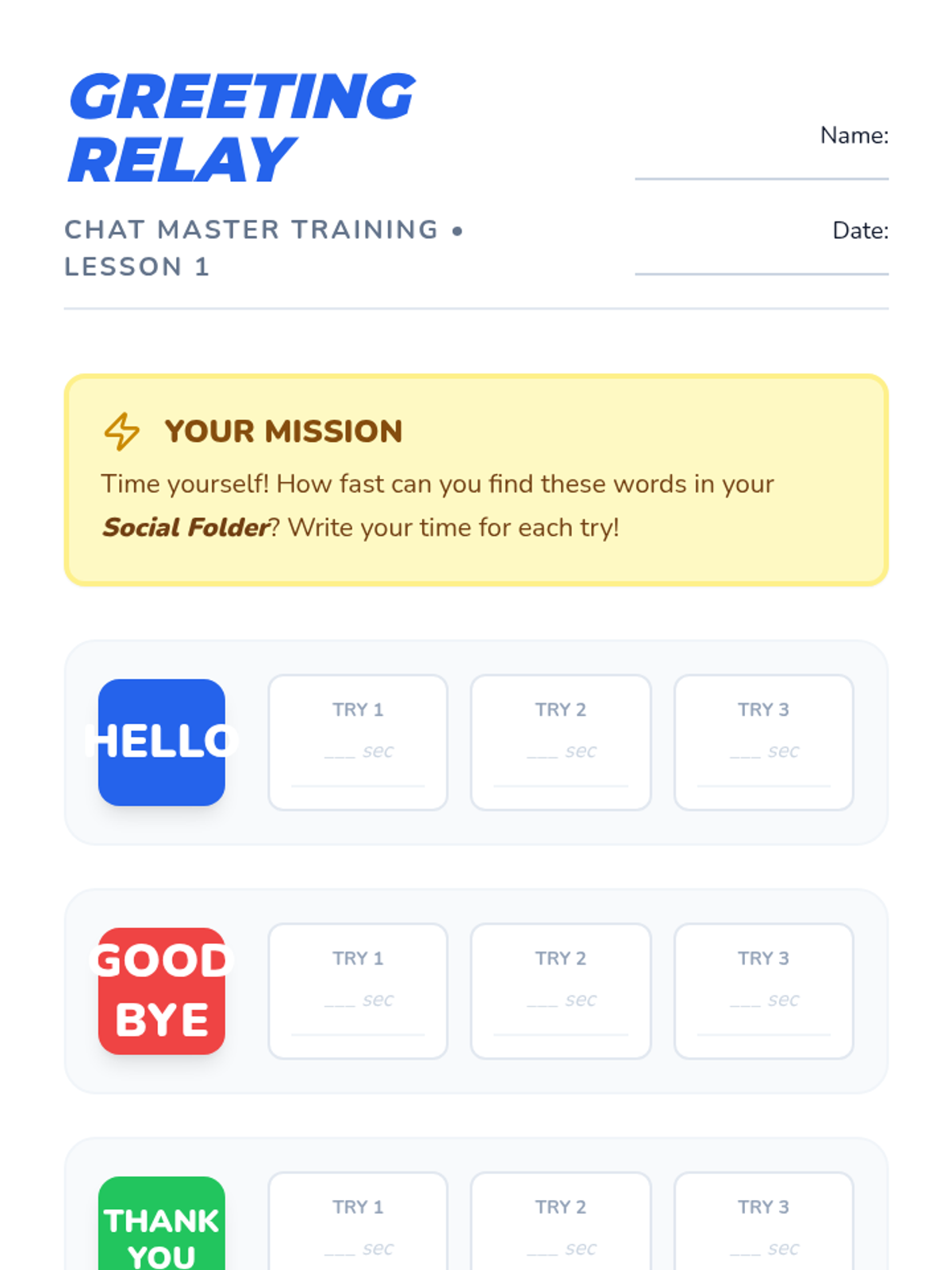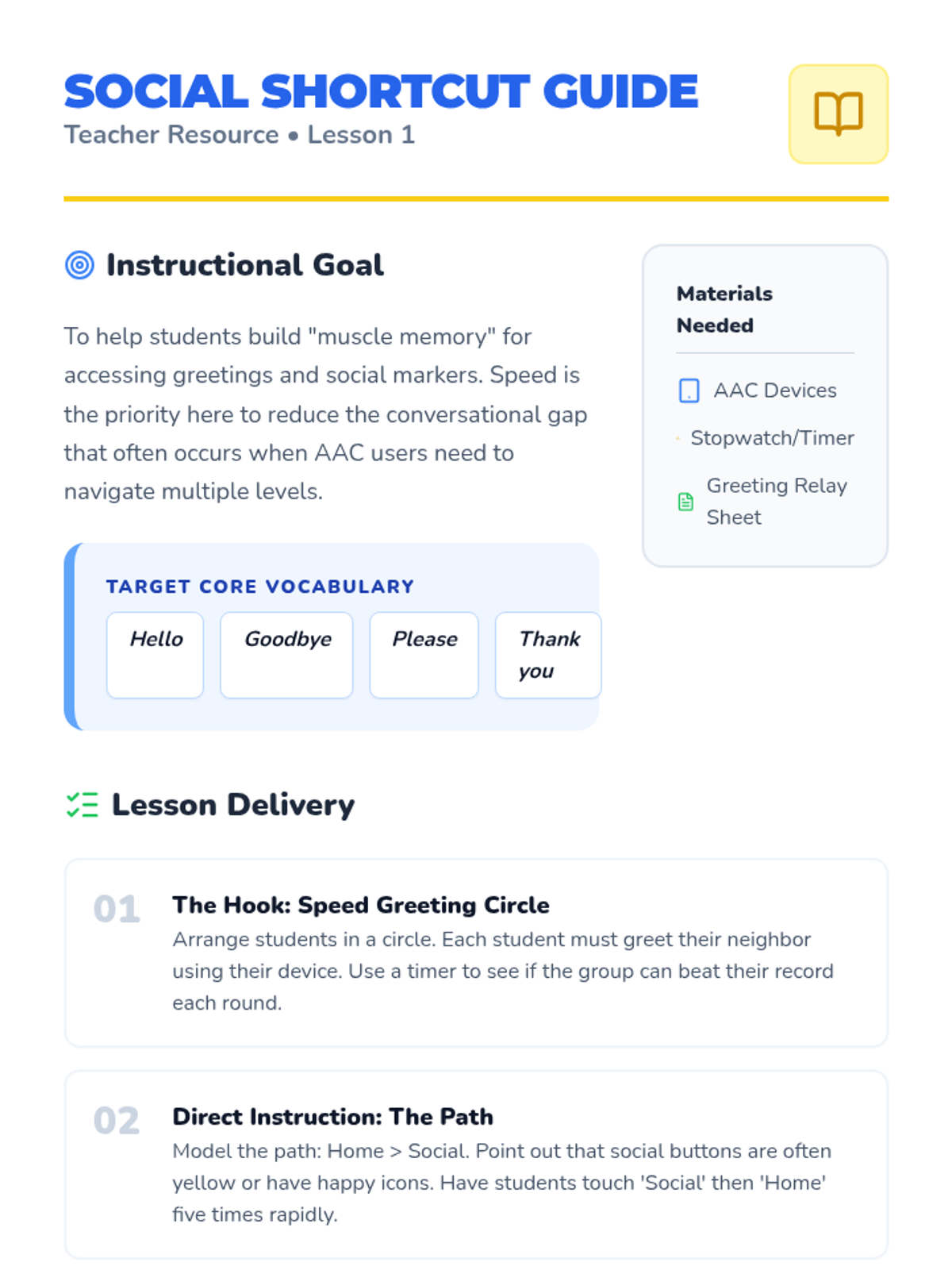 A comprehensive sequence for 2nd Grade students to master AAC device navigation for social interactions, focusing on speed, question-asking, social comments, and communication repair.