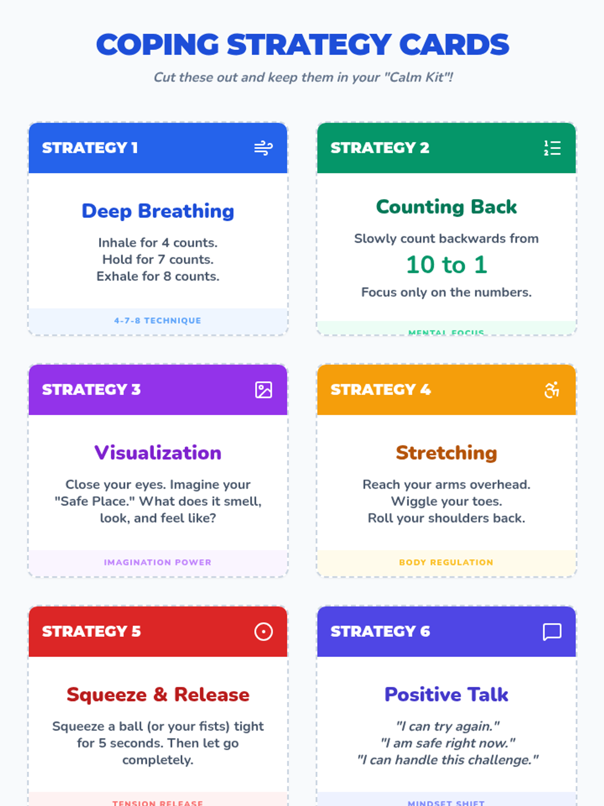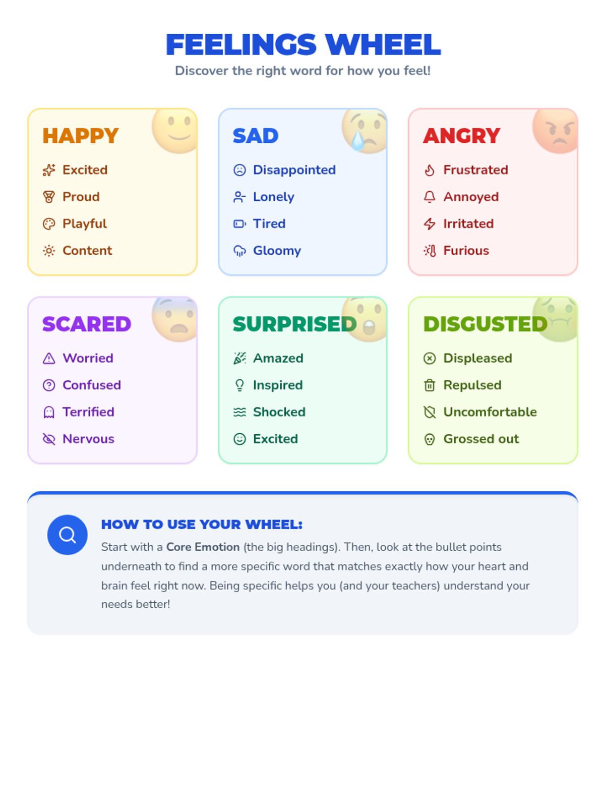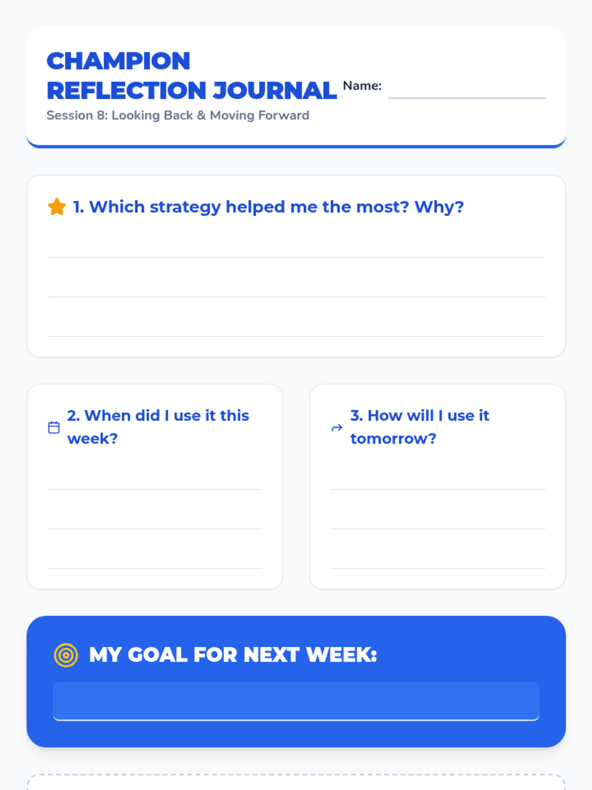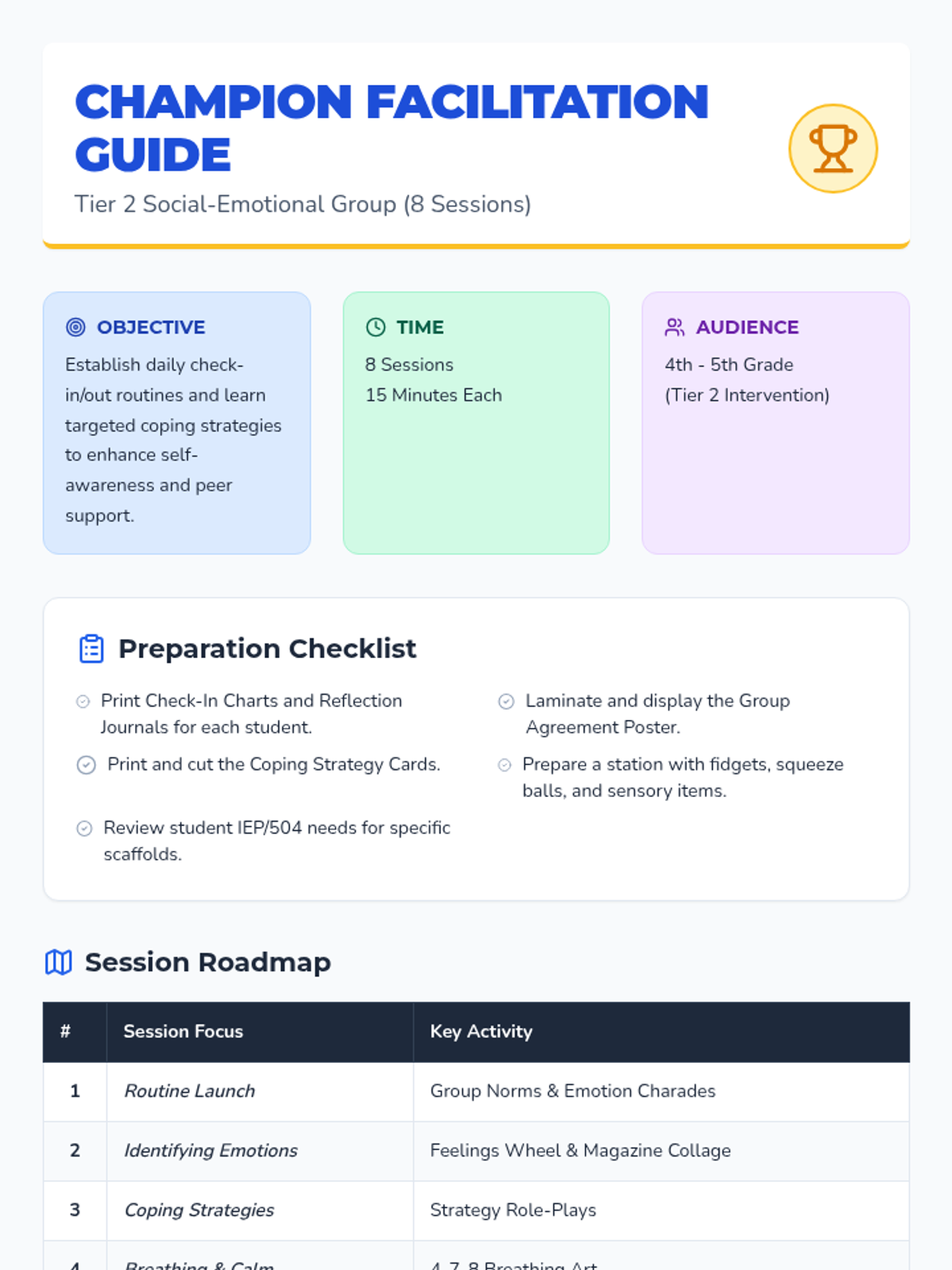 A series of 8 fifteen-minute group sessions designed for 4th and 5th graders to build emotional regulation routines, peer support, and coping strategies.