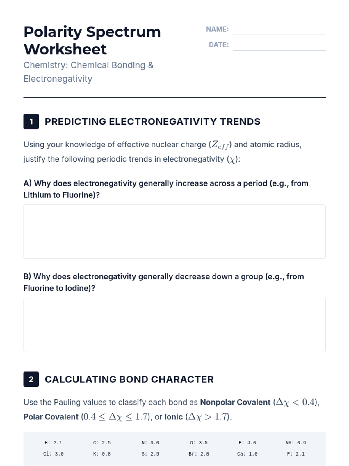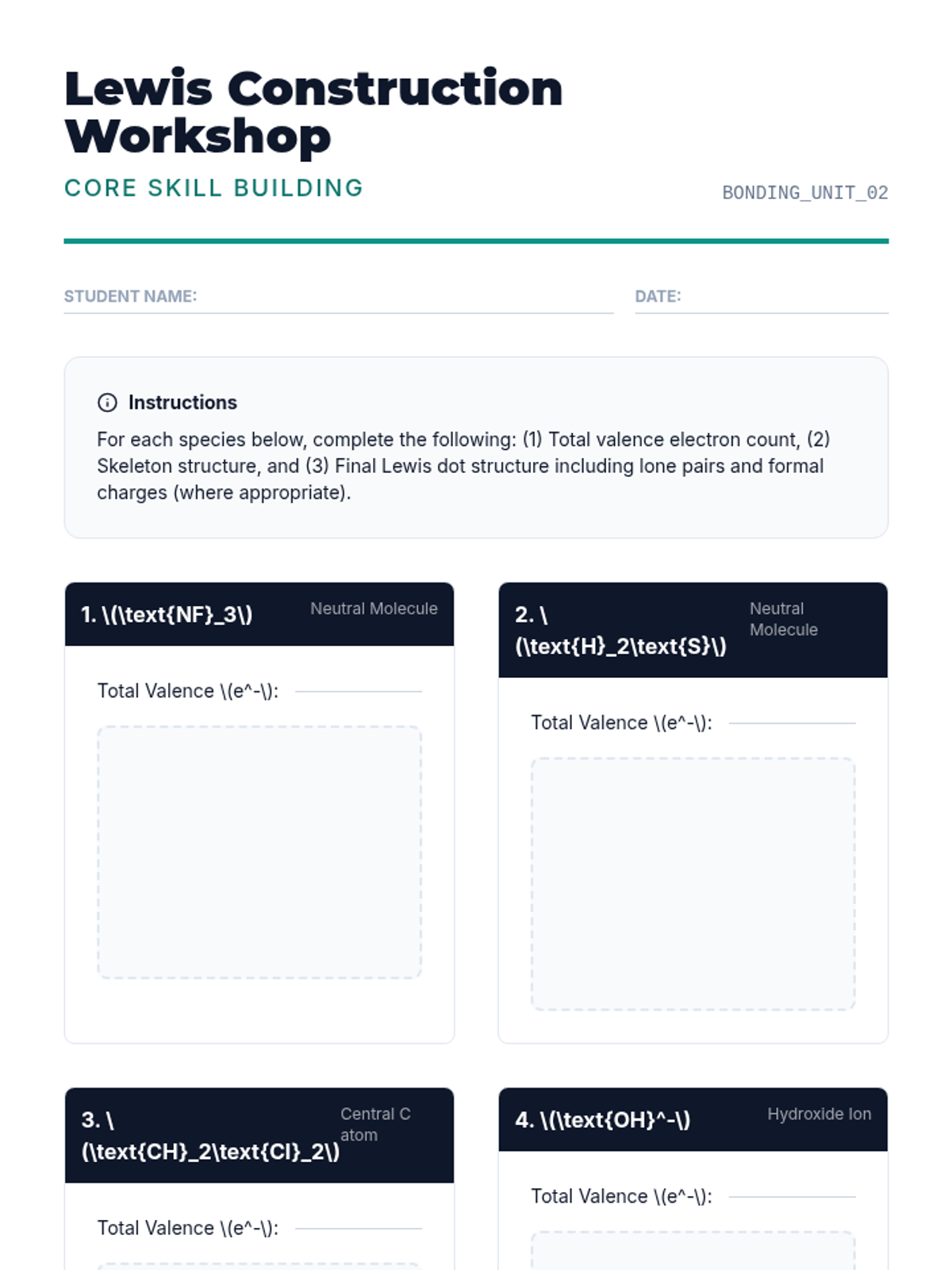 This undergraduate chemistry sequence covers the fundamental principles of chemical bonding, from electronegativity gradients and Lewis structure construction to formal charge analysis, resonance, and bond energetics. Students move from basic electron sharing to modeling complex hypervalent molecules and calculating reaction enthalpies.