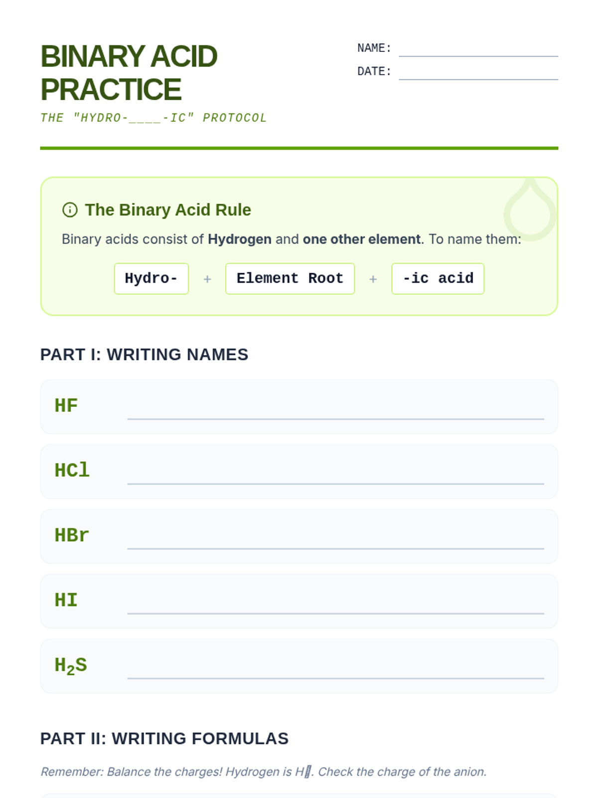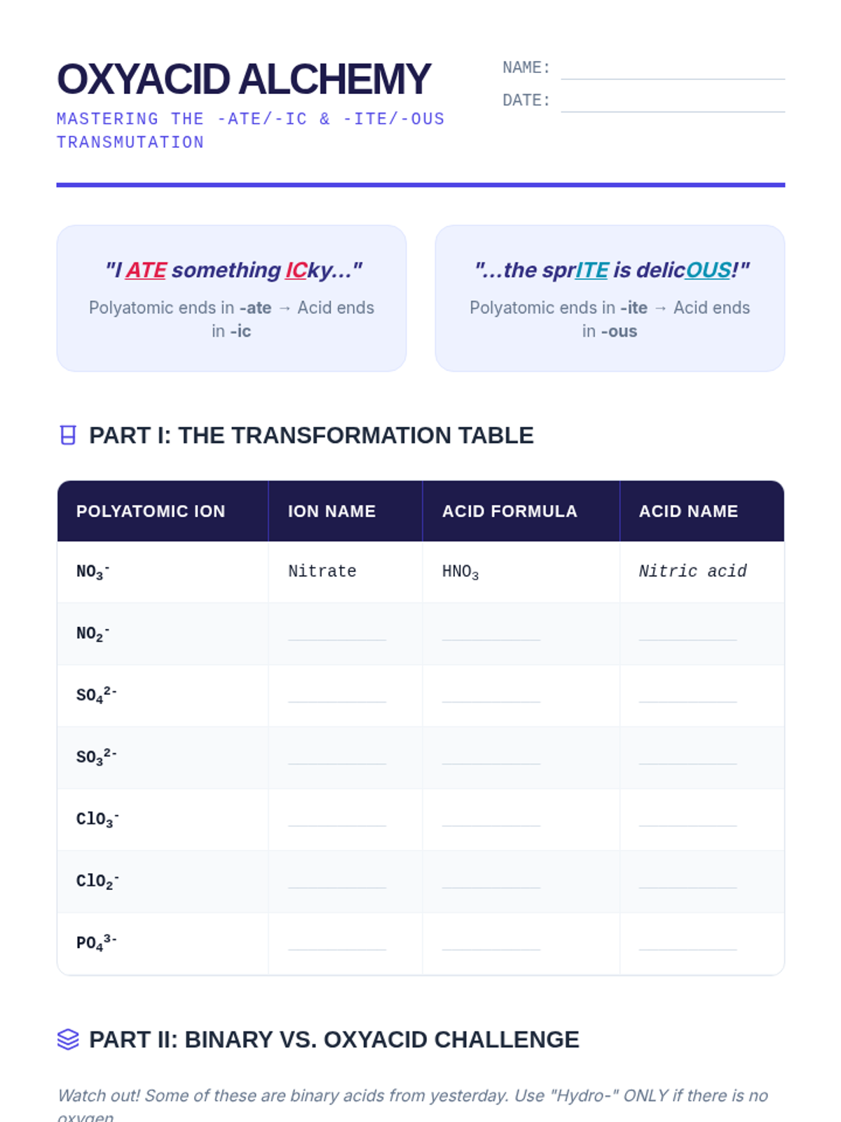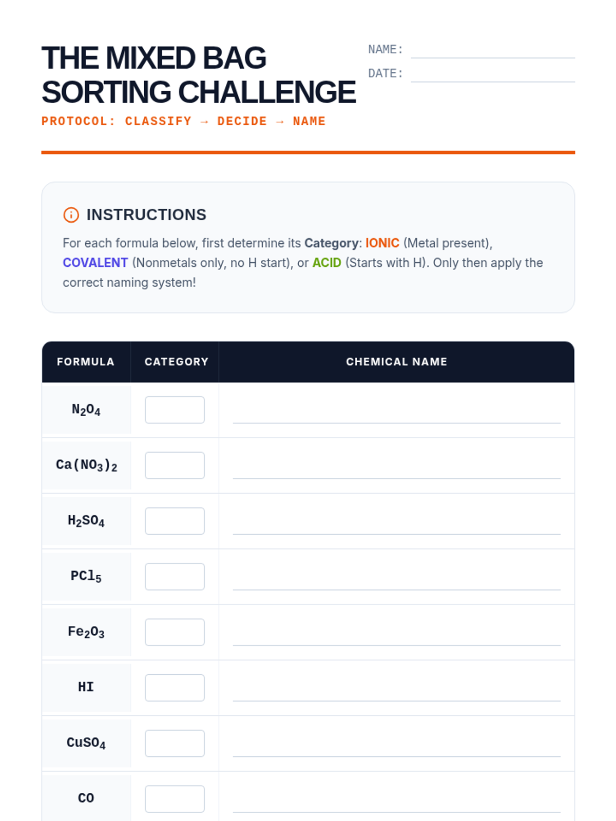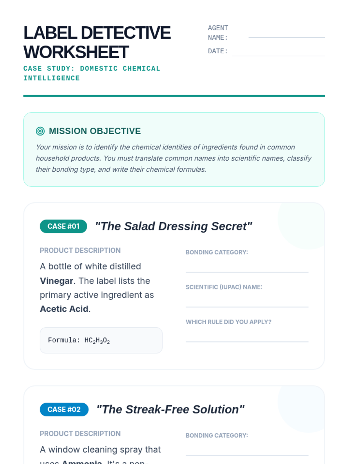 A comprehensive unit for 10th-grade chemistry focusing on the nomenclature of covalent compounds and acids. Students learn to distinguish between different bonding types and apply the specific naming conventions for molecular substances, binary acids, and oxyacids, concluding with a real-world application of household chemical analysis.