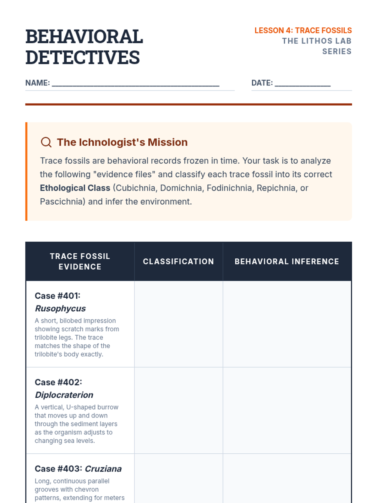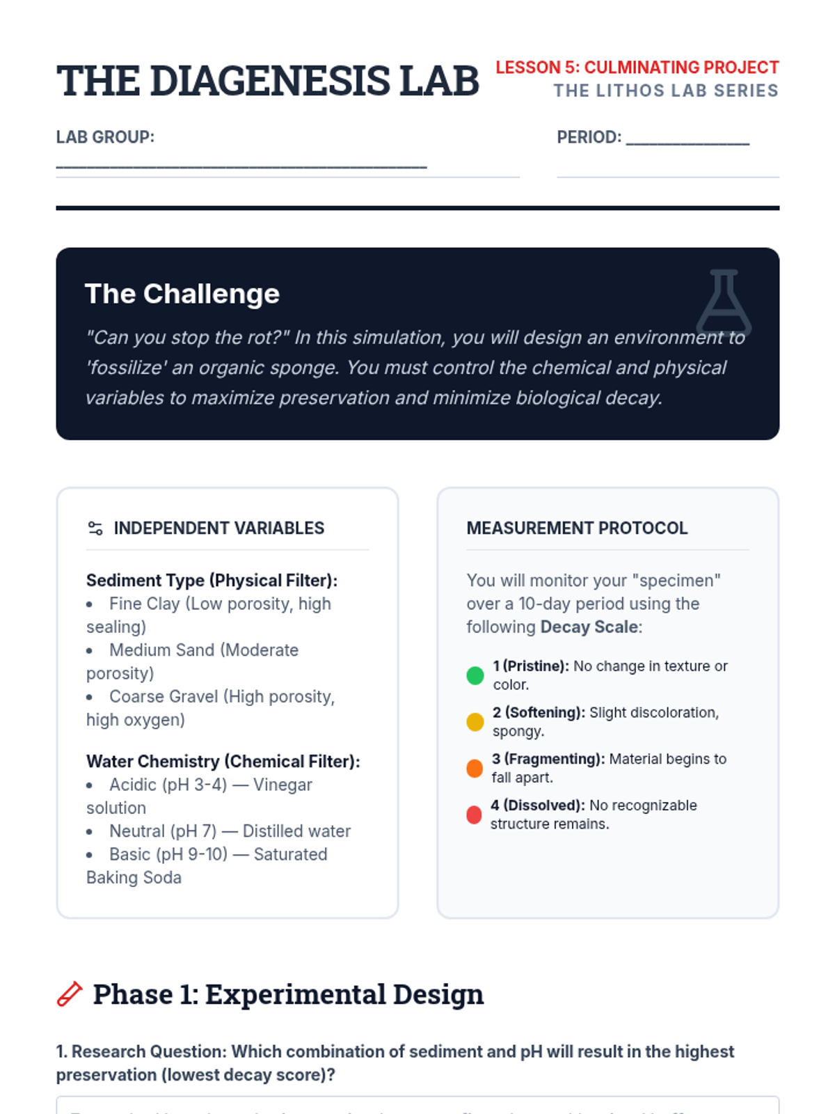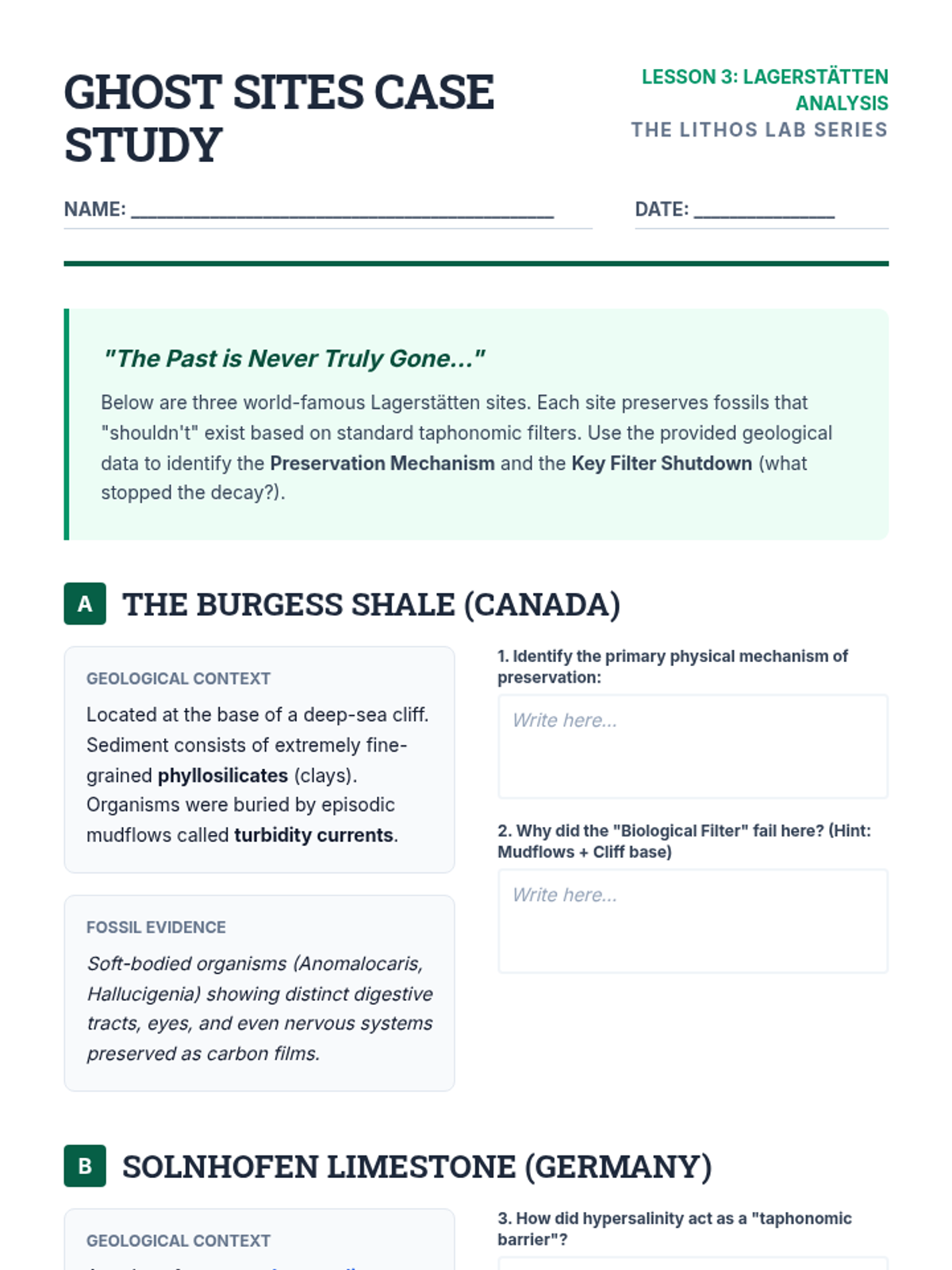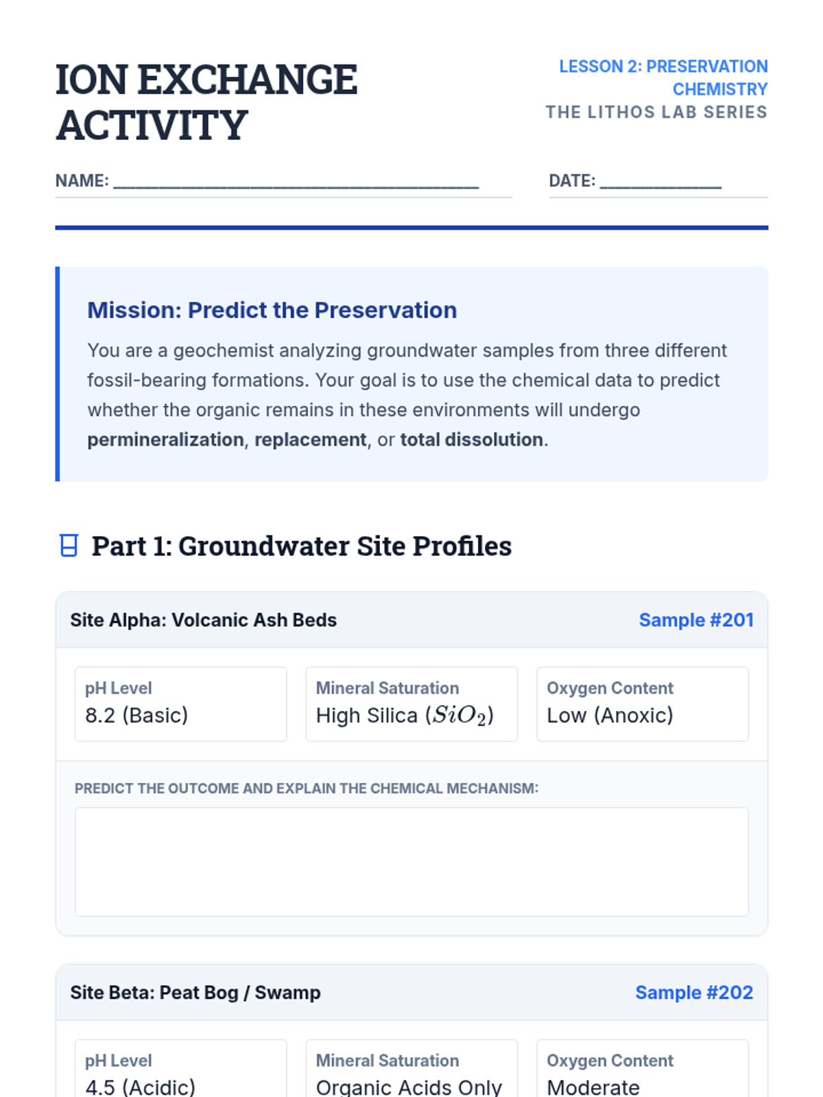 This sequence examines the complex geochemical and physical processes that transform organic remains into rock. Students explore preservation modes like permineralization and carbonization, analyze Lagerstätten sites, and simulate diagenetic environments to understand the fossil record's biases.
