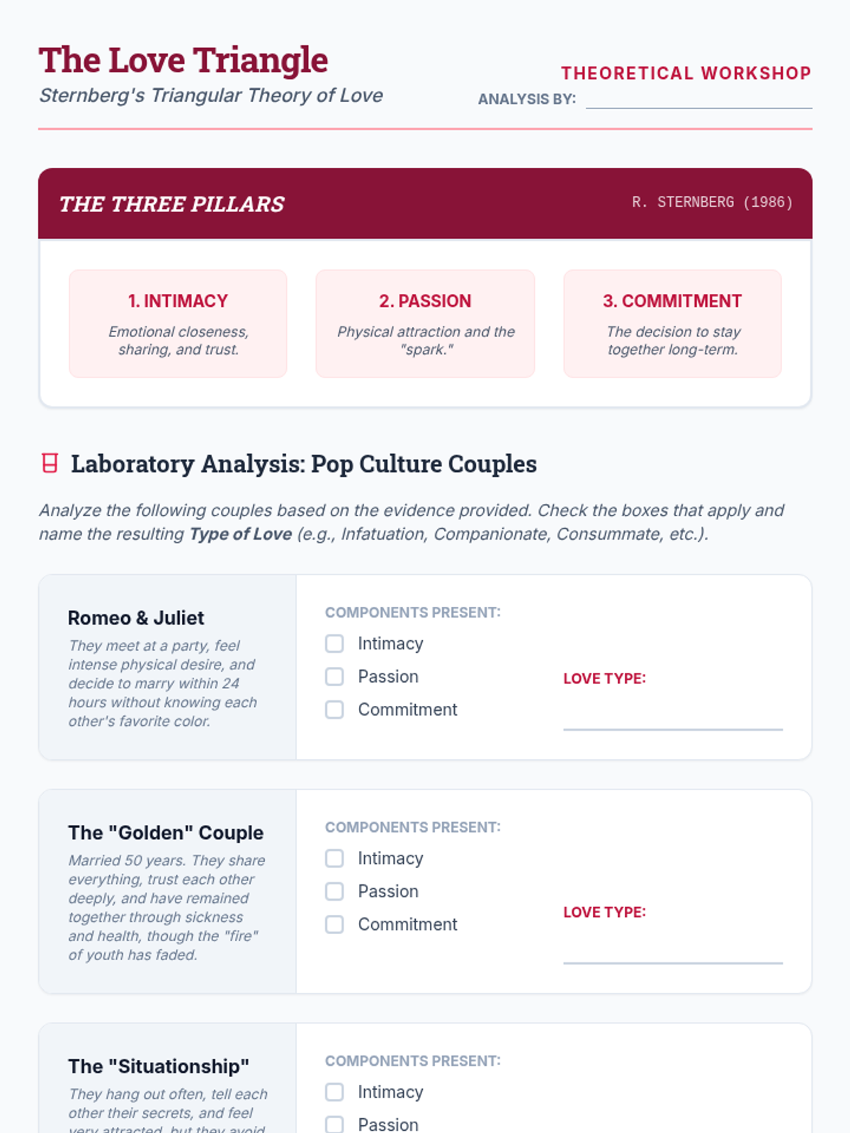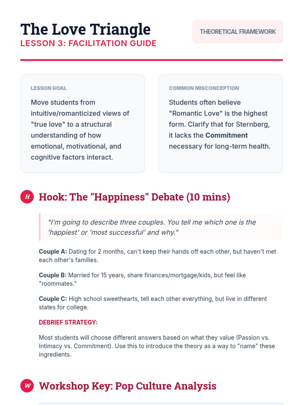 A 10th-grade Psychology sequence exploring the biological, social, and psychological drivers of human attraction, love, and relationship longevity. Students apply theories like evolutionary psychology, Sternberg's Triangular Theory, and Gottman's research to understand interpersonal dynamics.