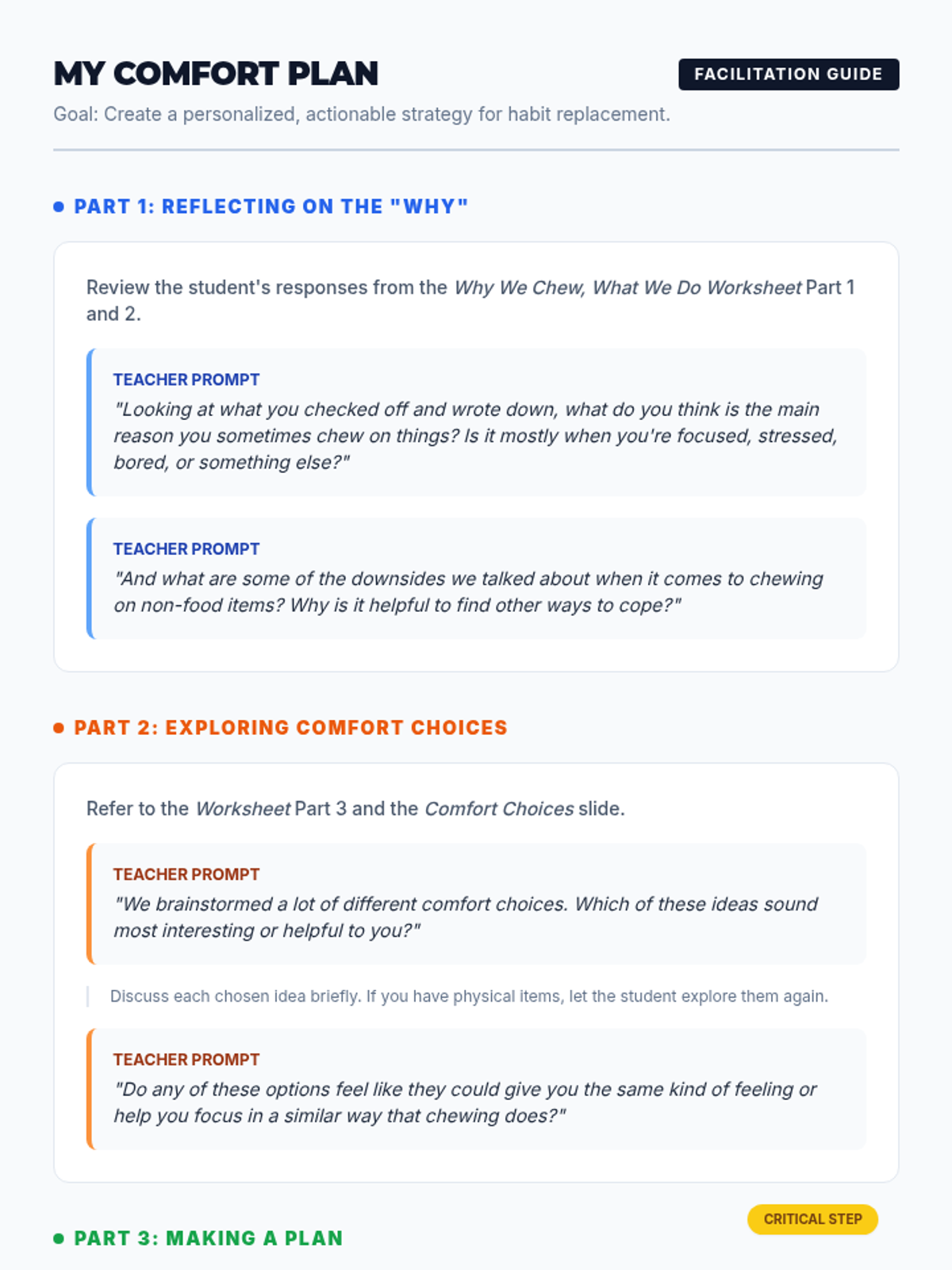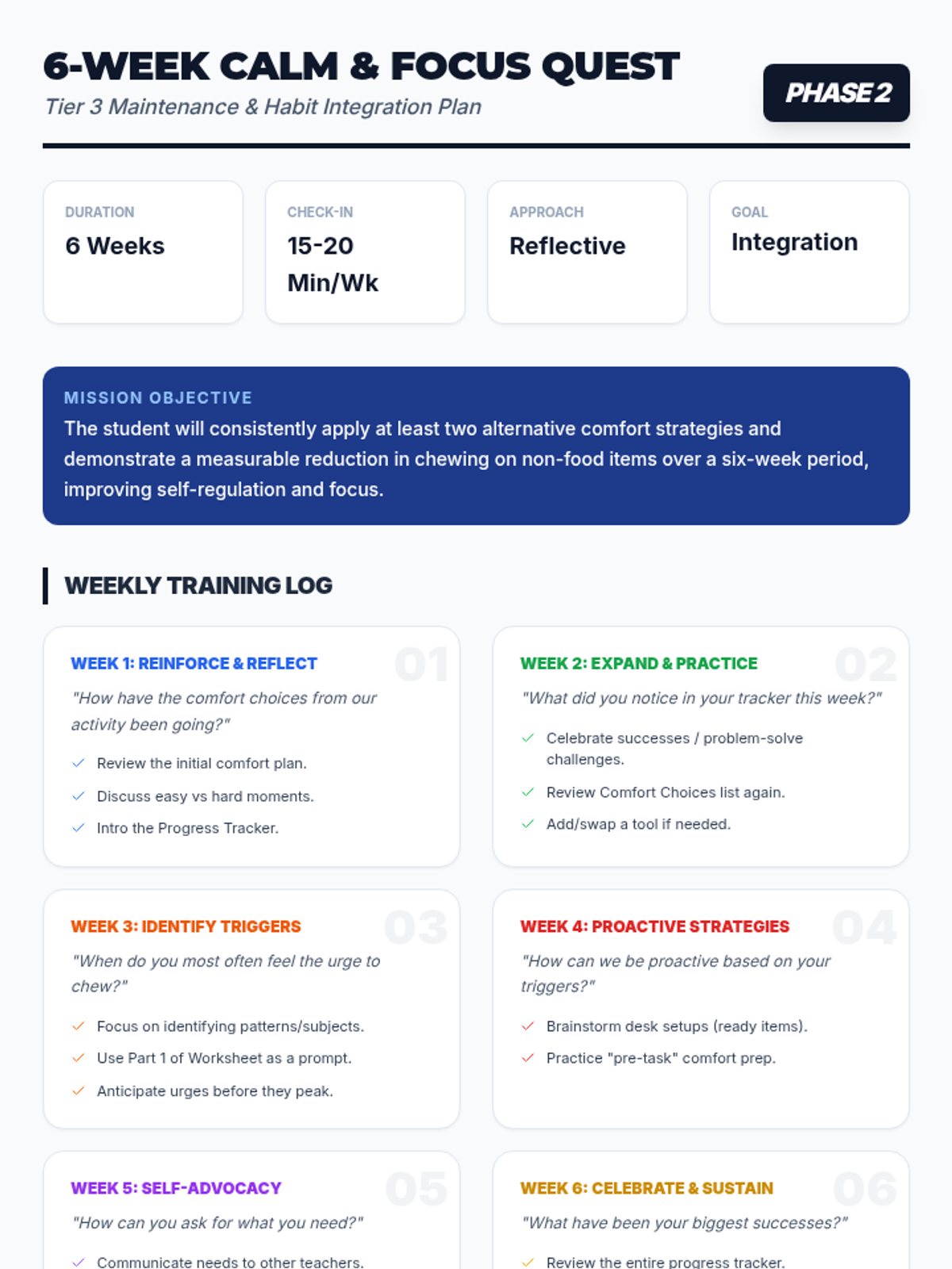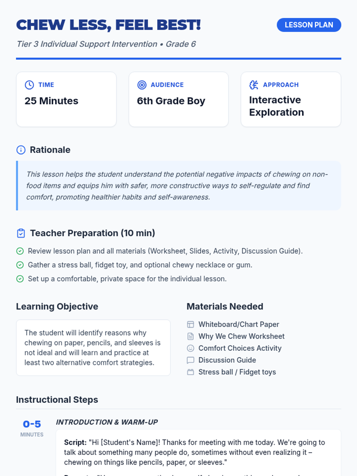 A Tier 3 intervention for 6th-grade students to manage non-food chewing habits through self-awareness and alternative comfort strategies. This sequence includes an initial discovery lesson followed by a structured 6-week follow-up plan.