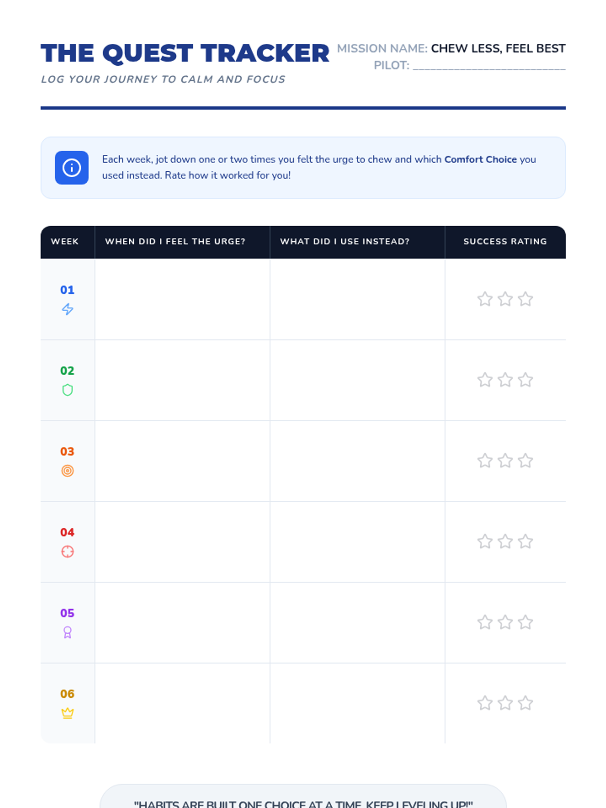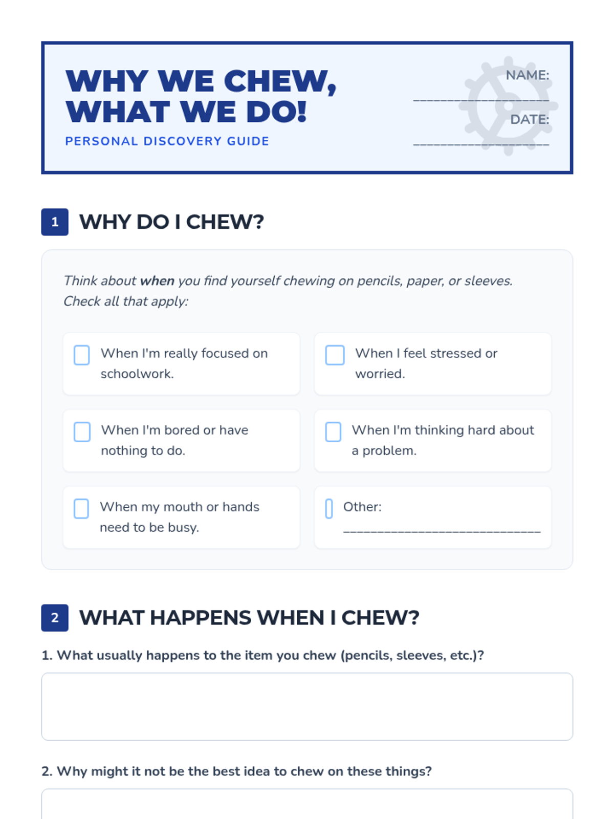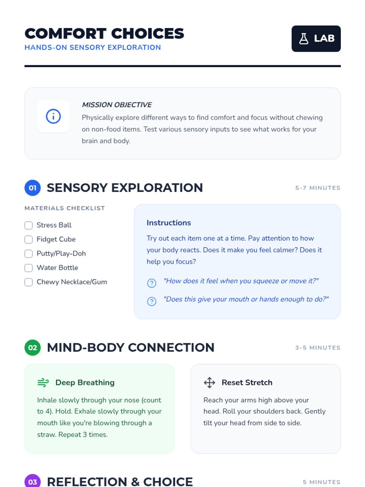 A Tier 3 intervention for 6th-grade students to manage non-food chewing habits through self-awareness and alternative comfort strategies. This sequence includes an initial discovery lesson followed by a structured 6-week follow-up plan.