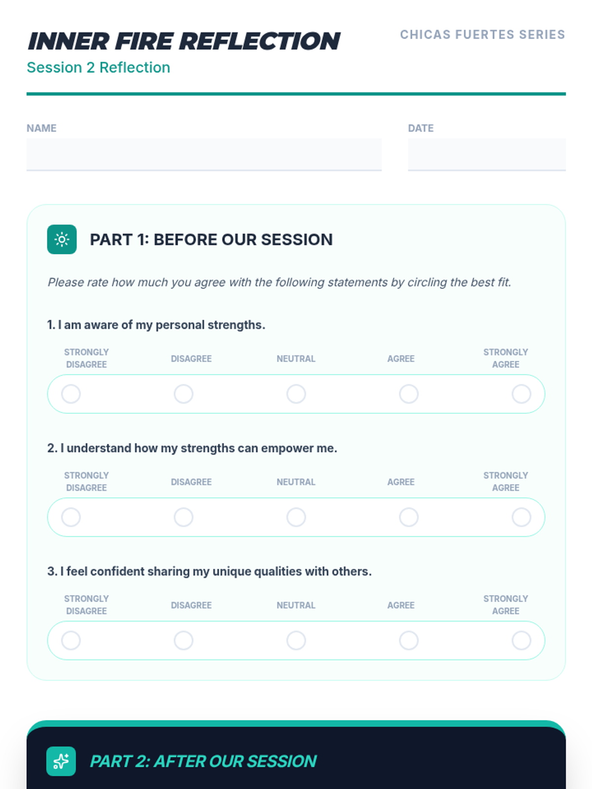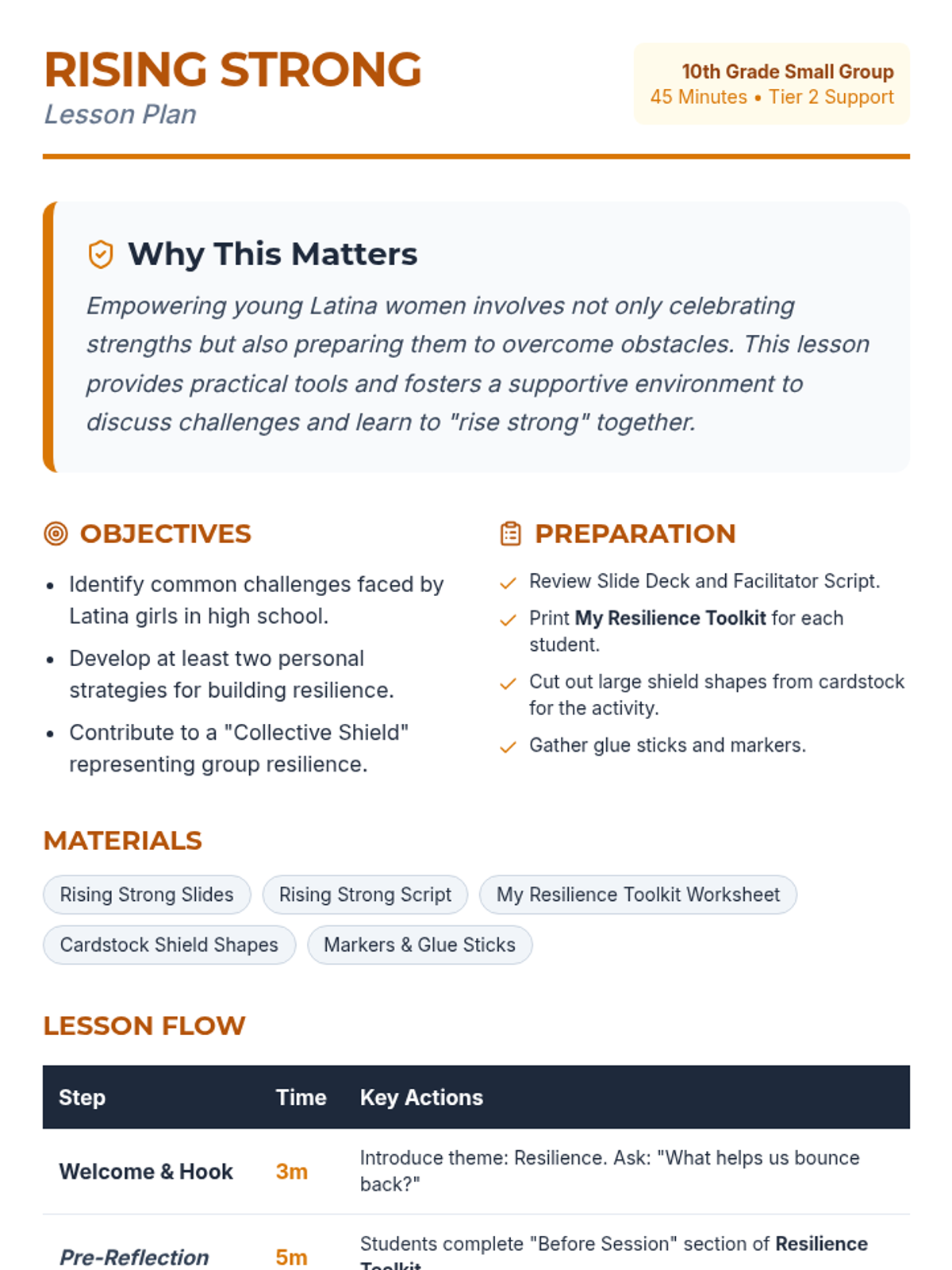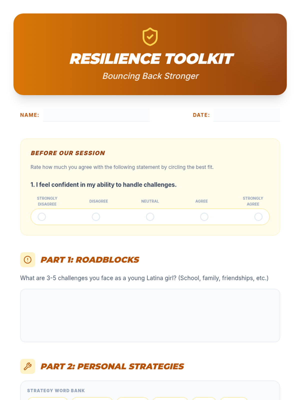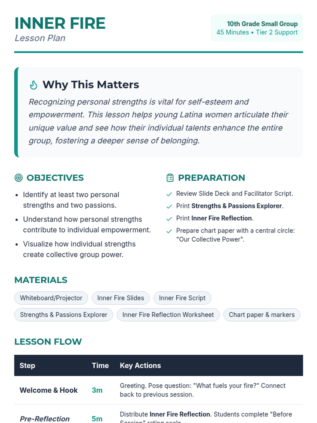 A three-part empowerment series for 10th-grade Latina girls focusing on community building, identifying personal strengths, and developing collective resilience. Participants share stories, explore their 'inner fire', and build a toolkit for bouncing back from challenges together.