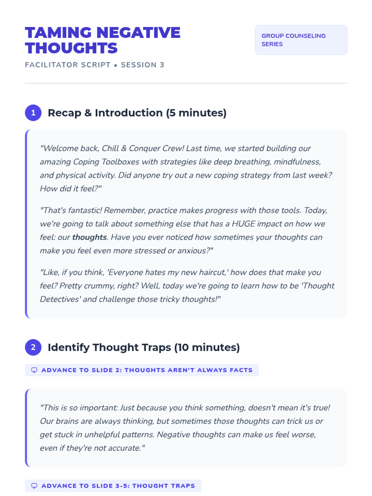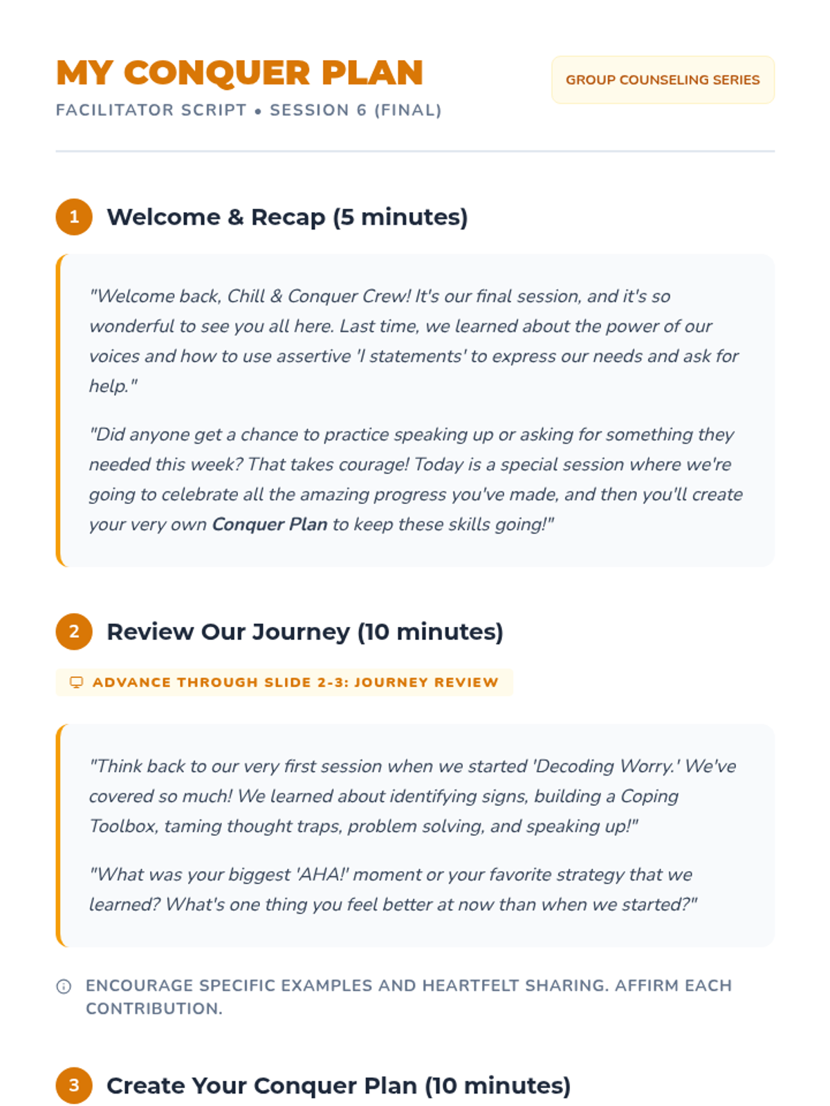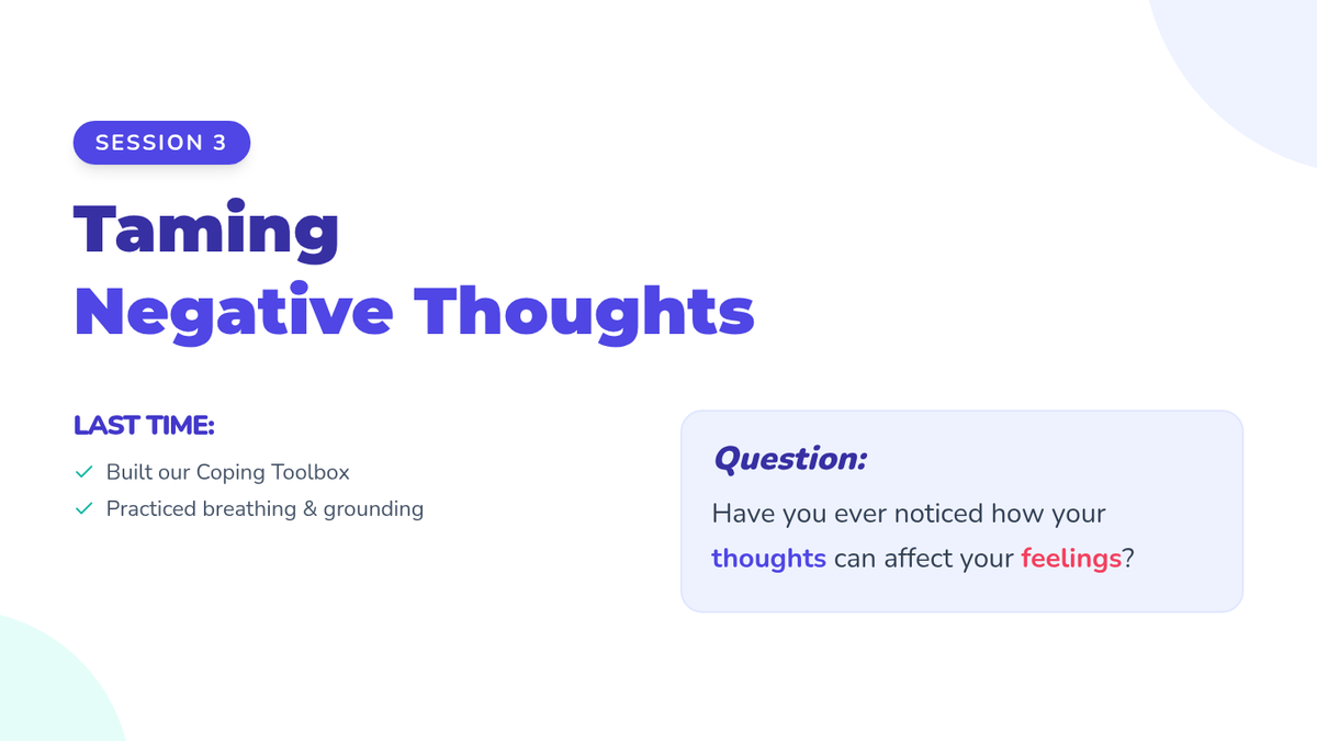 A 6-session counseling group designed to help students identify triggers, understand physical symptoms of anxiety, and build a personalized toolkit of coping strategies through a 'Calm Explorer' theme.
