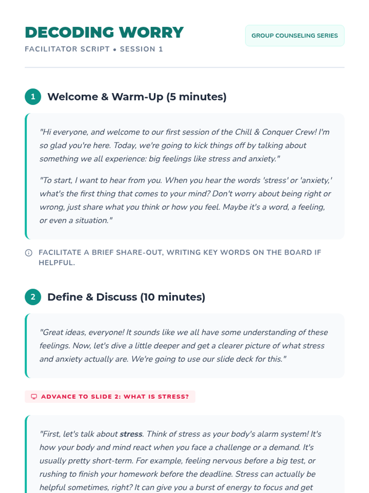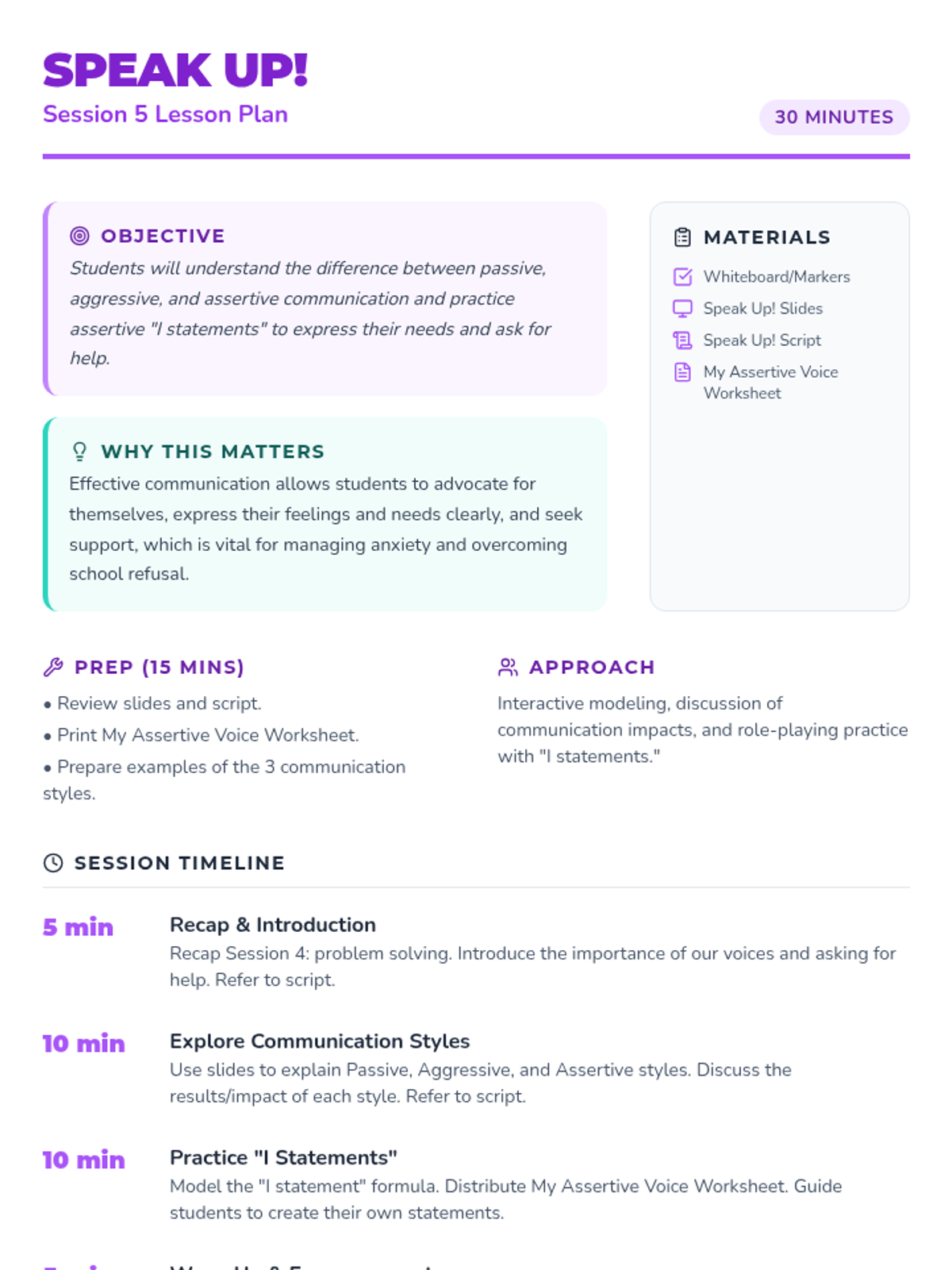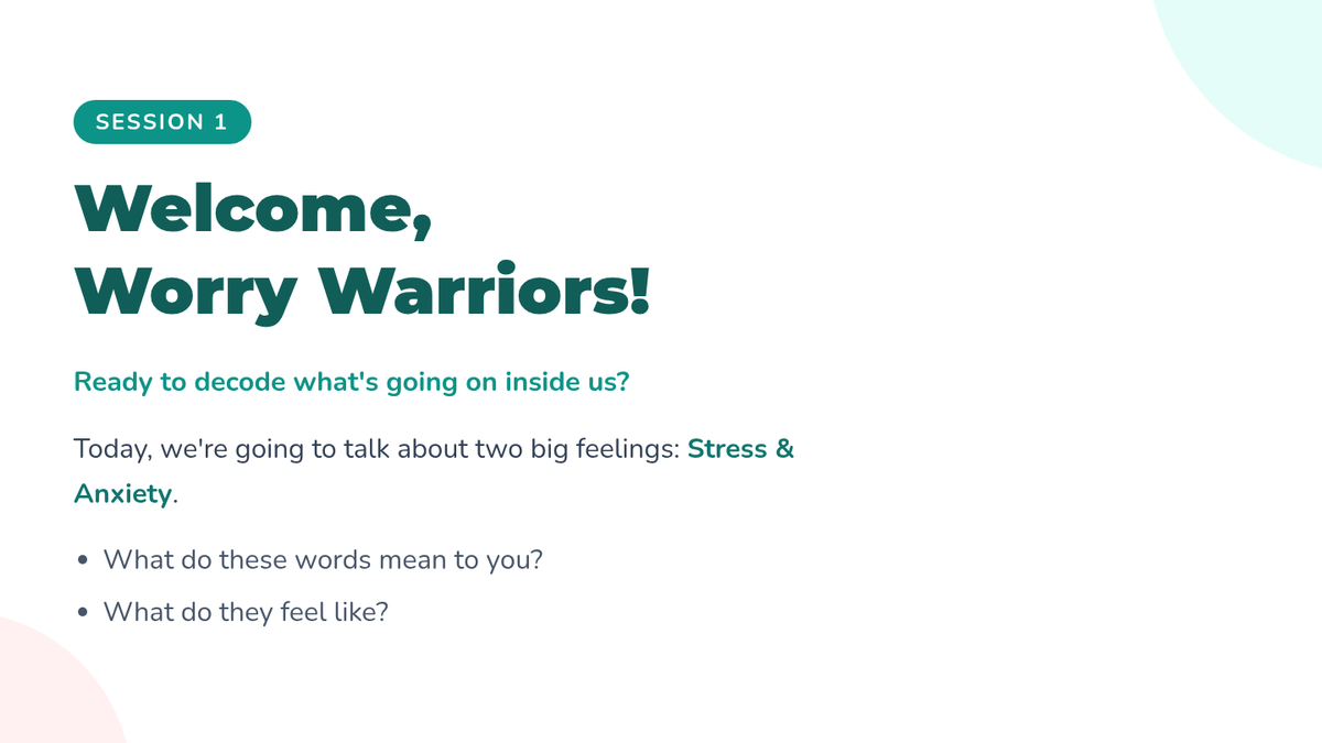 A six-session group counseling series for 6th-grade girls designed to help them understand and manage stress and anxiety, ultimately addressing school refusal. Each session builds practical coping strategies and a supportive environment.
