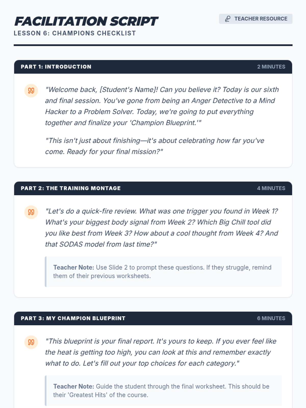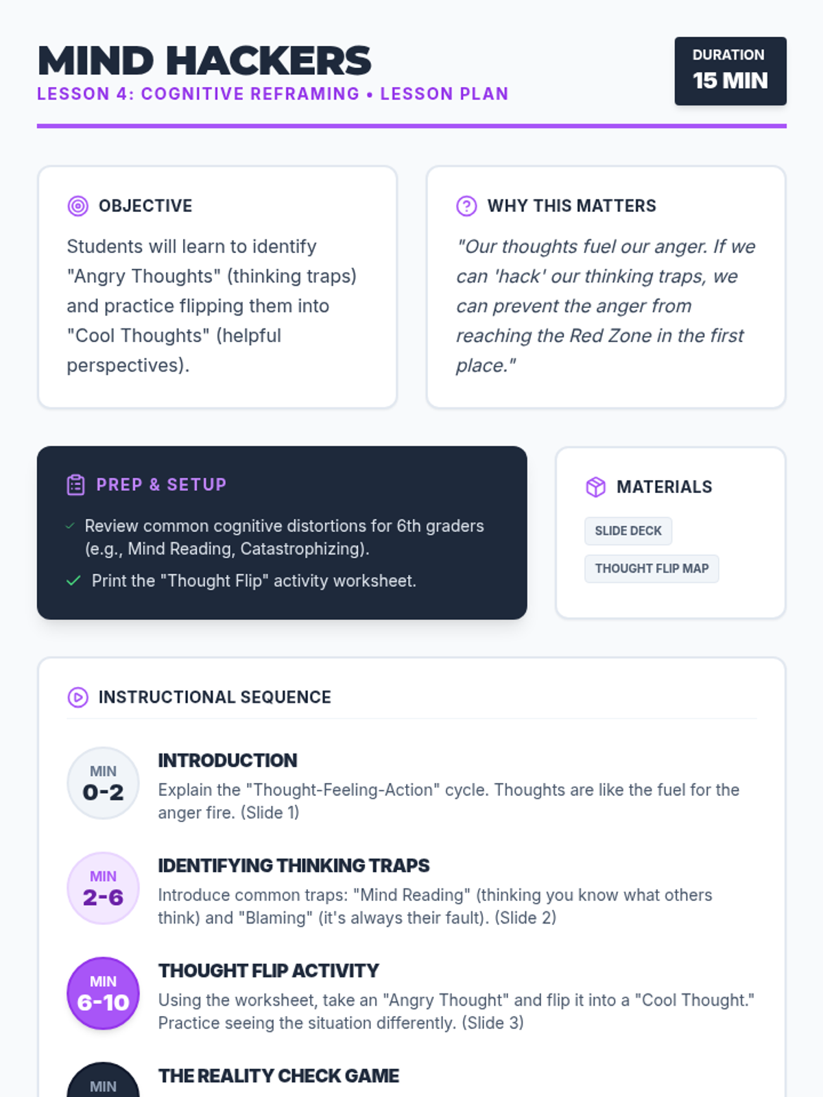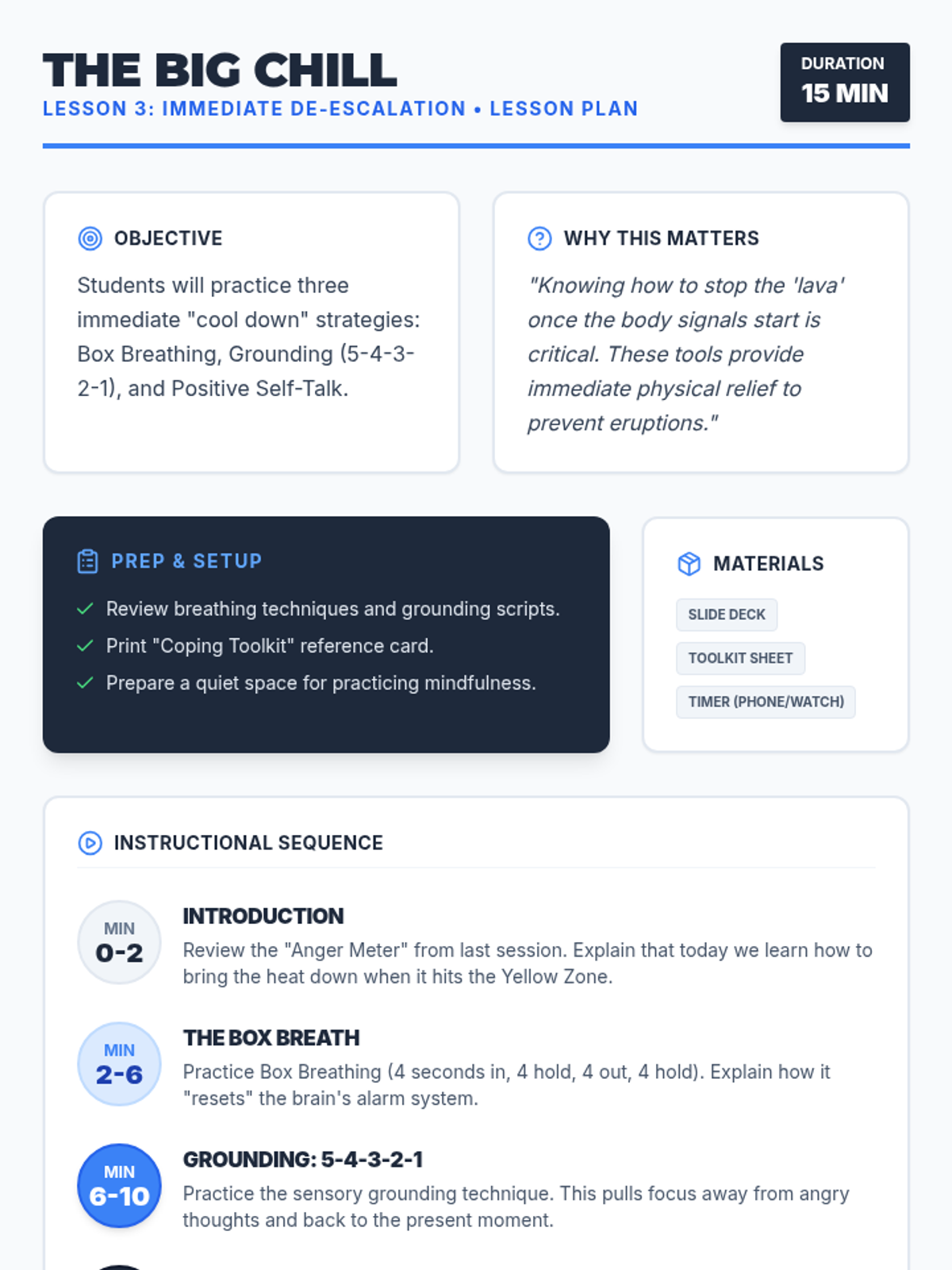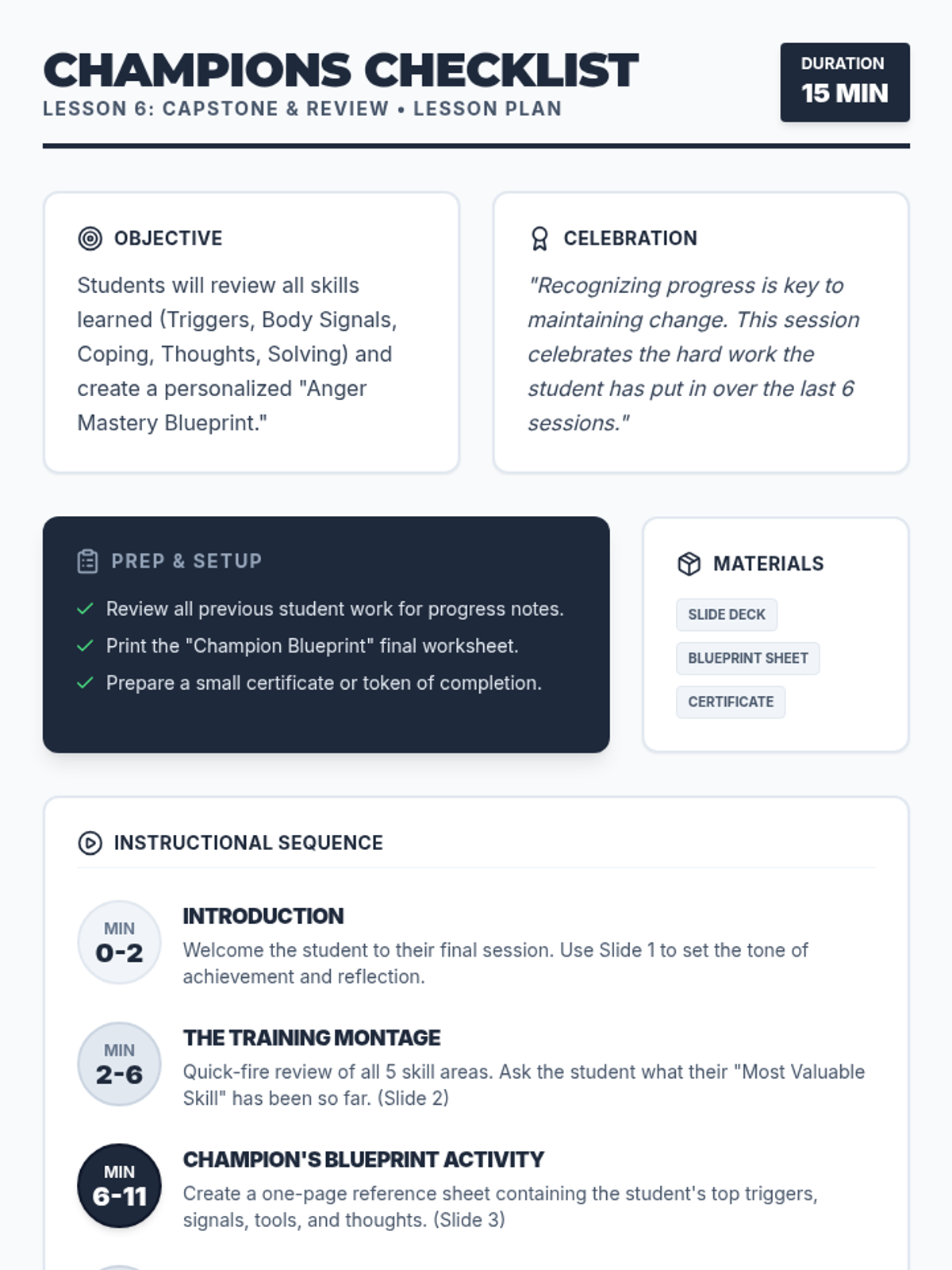 A comprehensive 6-session Tier 3 intervention for 6th-grade students to master anger management. The program covers trigger identification, physical awareness, communication skills, and practical coping strategies through engaging, individualized activities.
