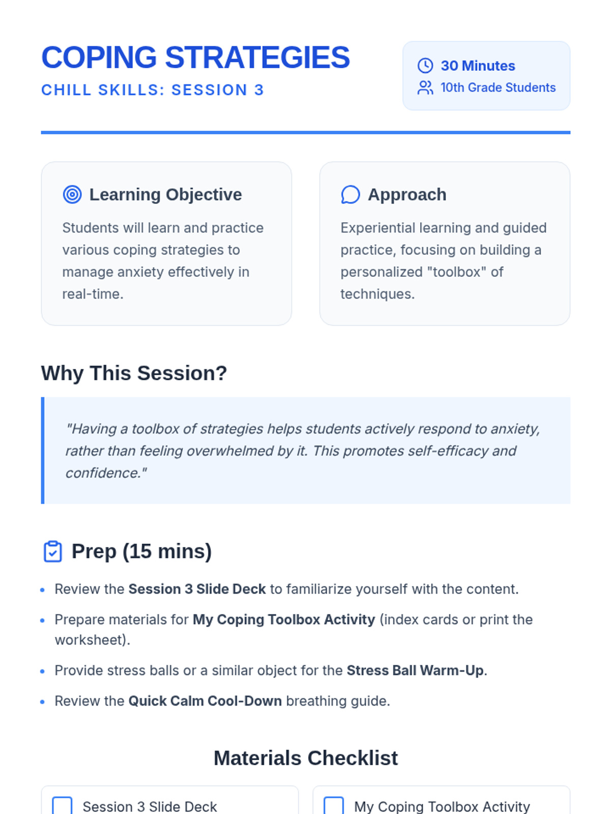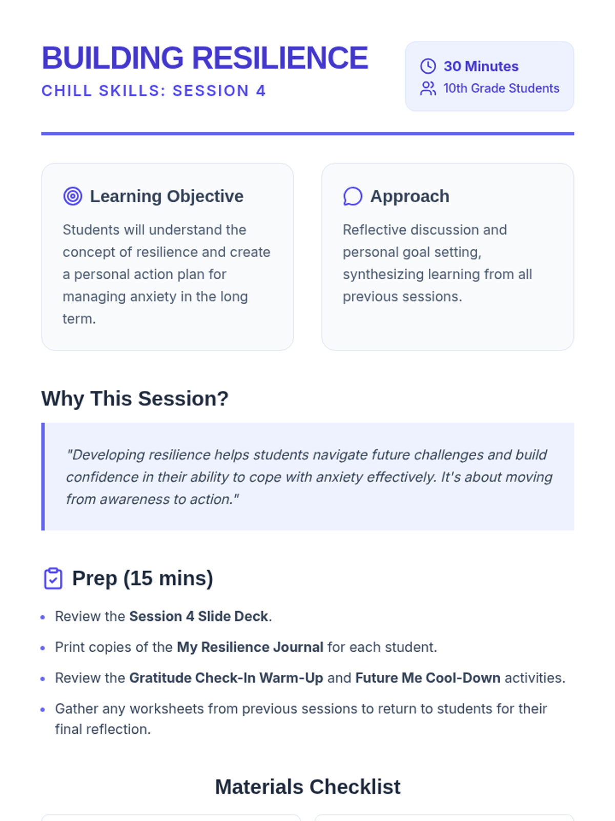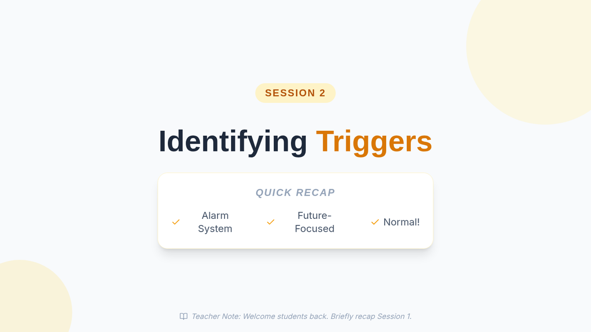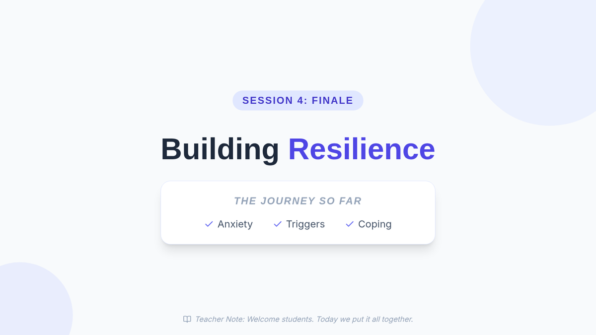 A four-session Tier 1 anxiety group for 10th-grade students, focusing on understanding anxiety, identifying triggers, developing coping strategies, and building resilience through interactive discussions and personal reflection.