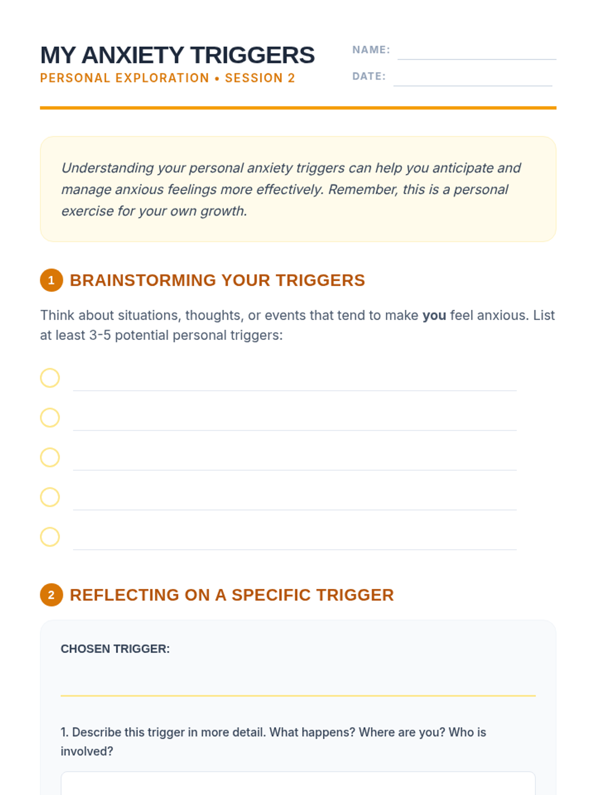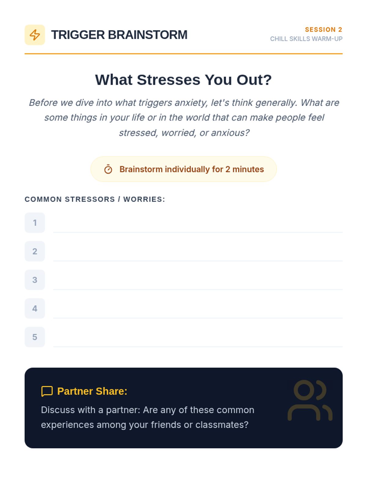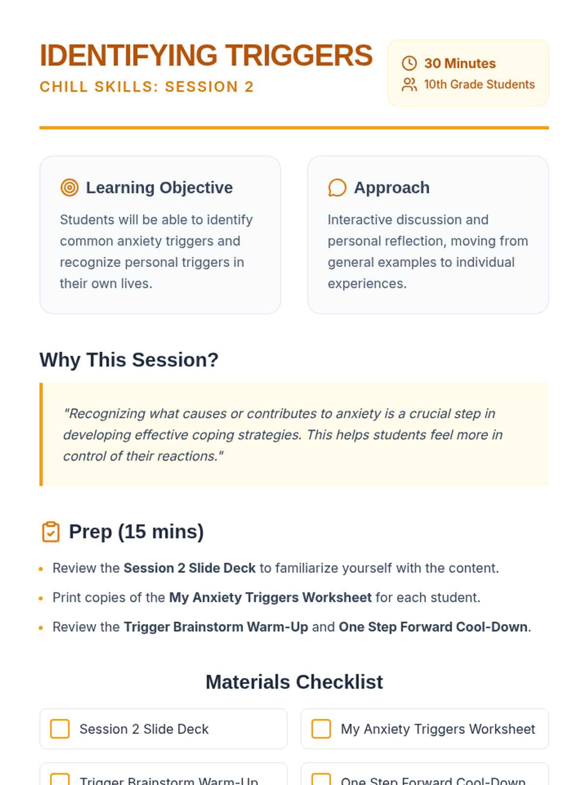 A four-session Tier 1 anxiety group for 10th-grade students, focusing on understanding anxiety, identifying triggers, developing coping strategies, and building resilience through interactive discussions and personal reflection.