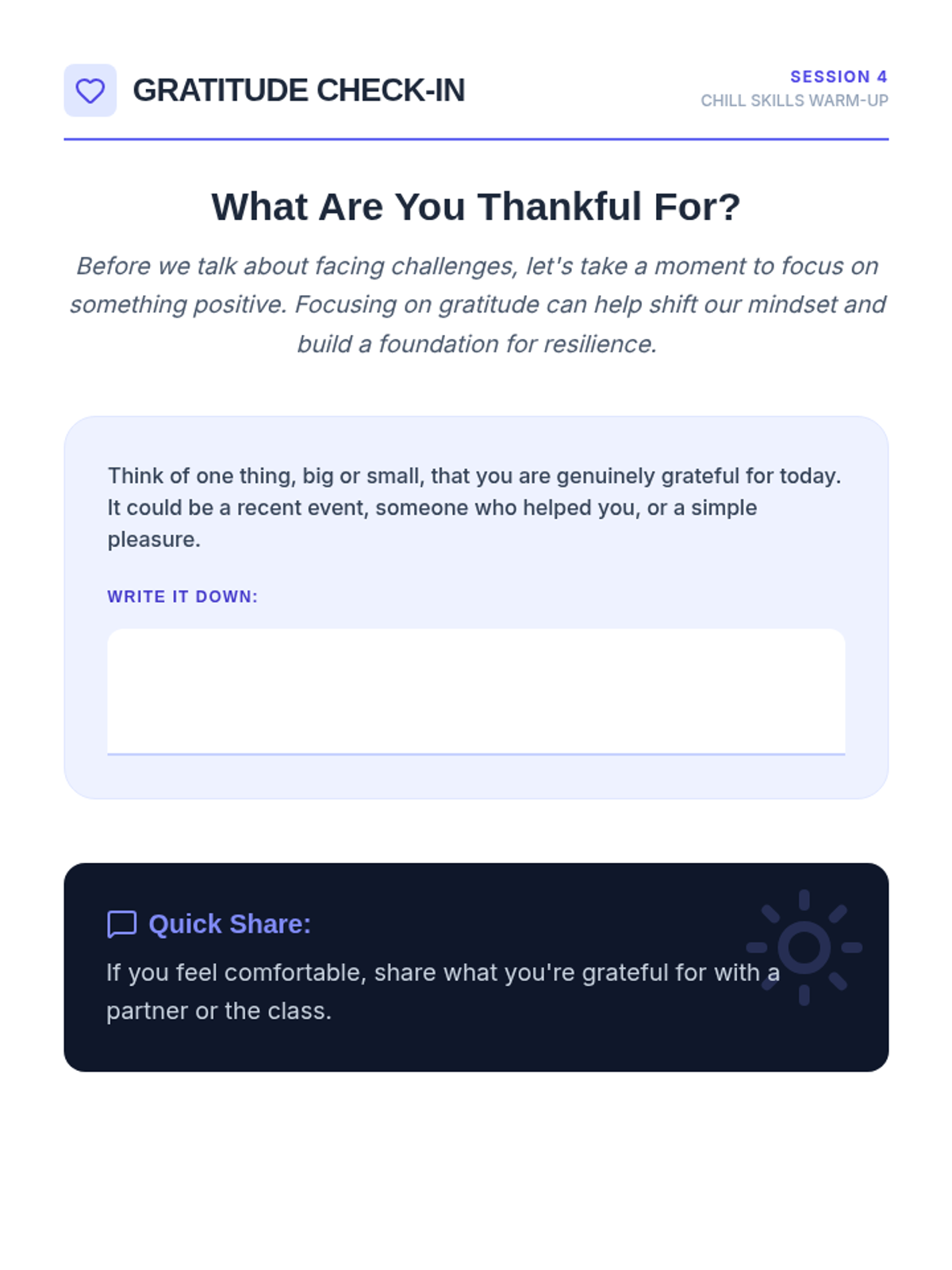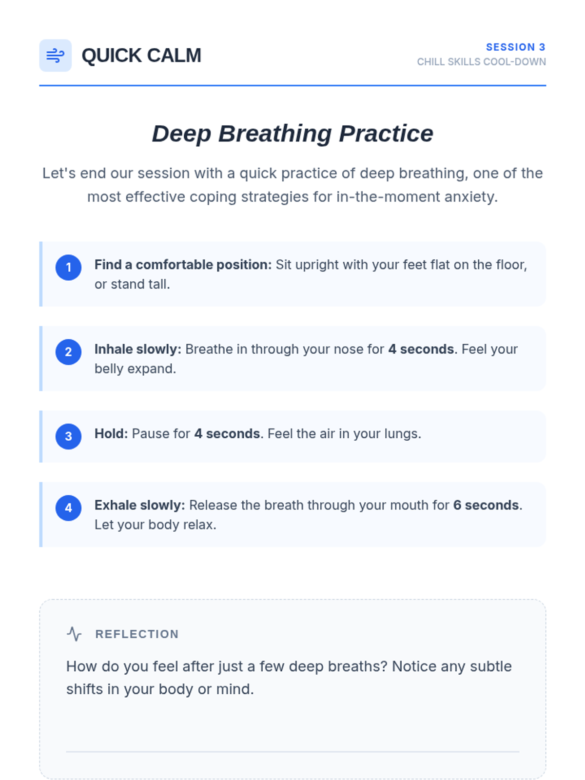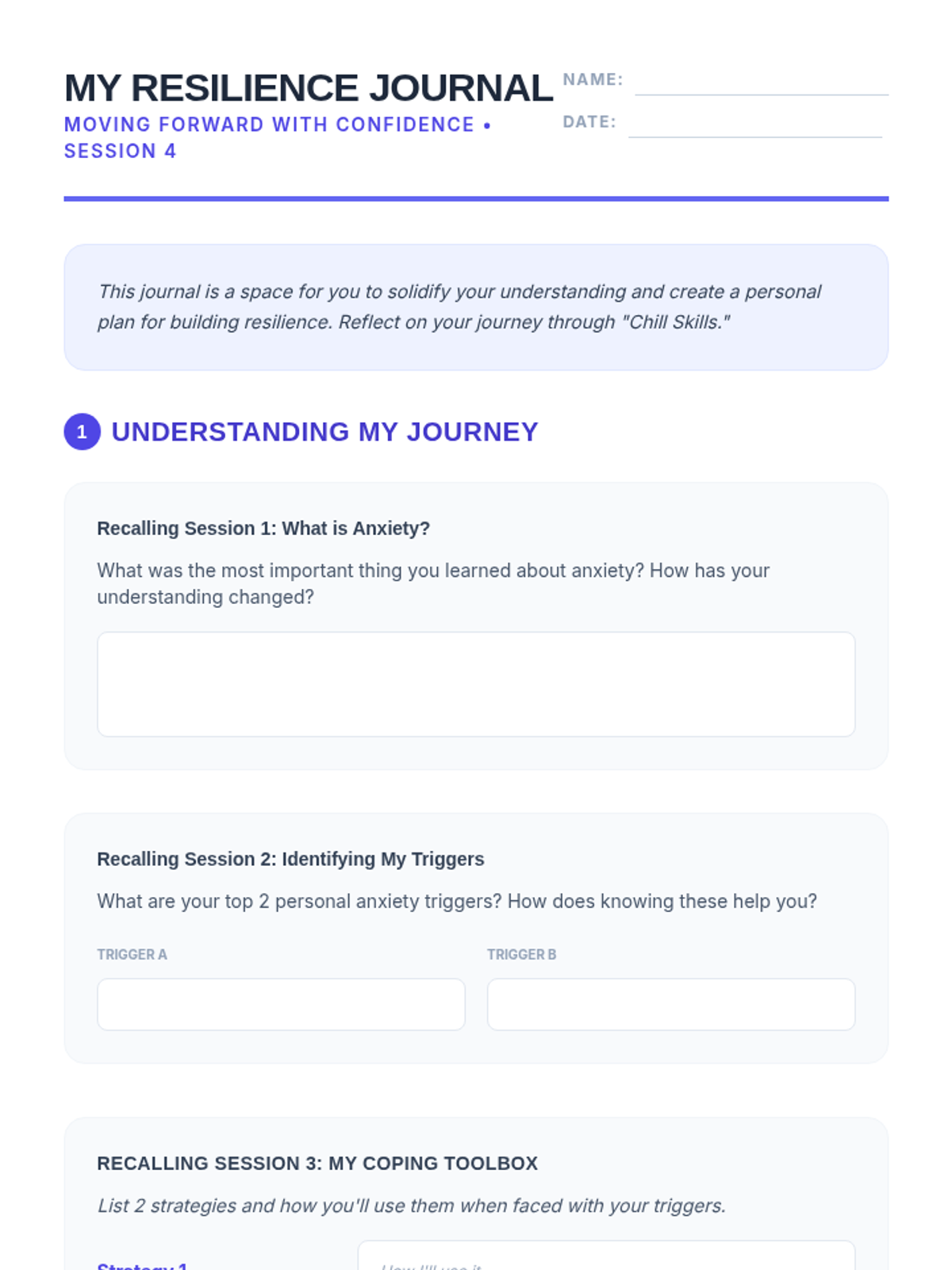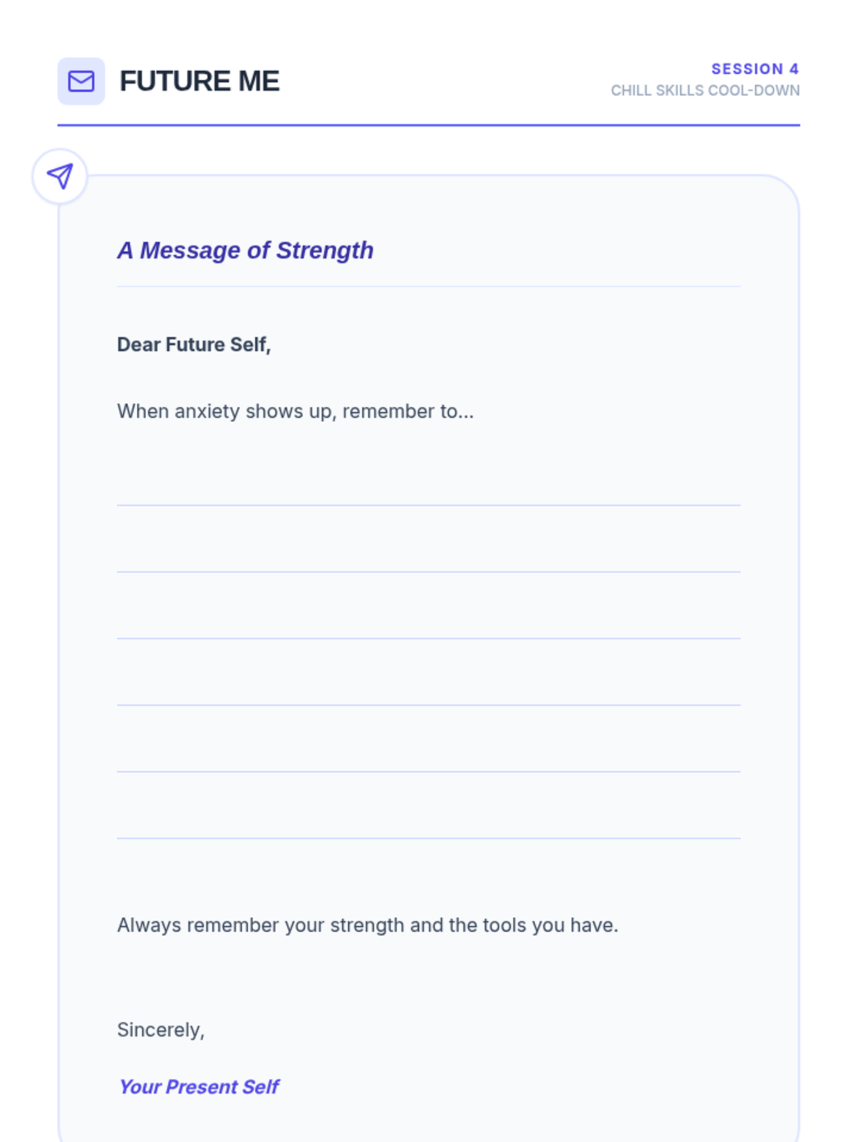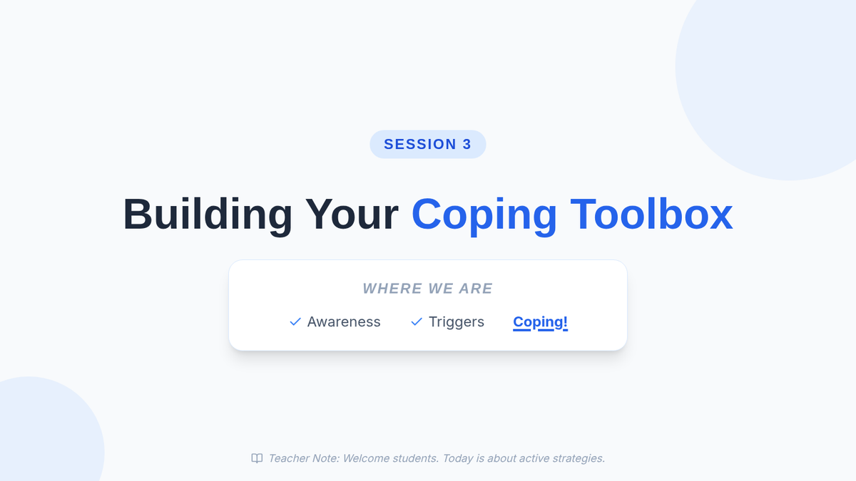 A 4-session small group counseling program for high school girls focused on identifying anxiety triggers, practicing mindfulness, and developing a personalized toolkit of coping strategies. The sequence emphasizes peer support, empowerment, and practical application within the school environment.