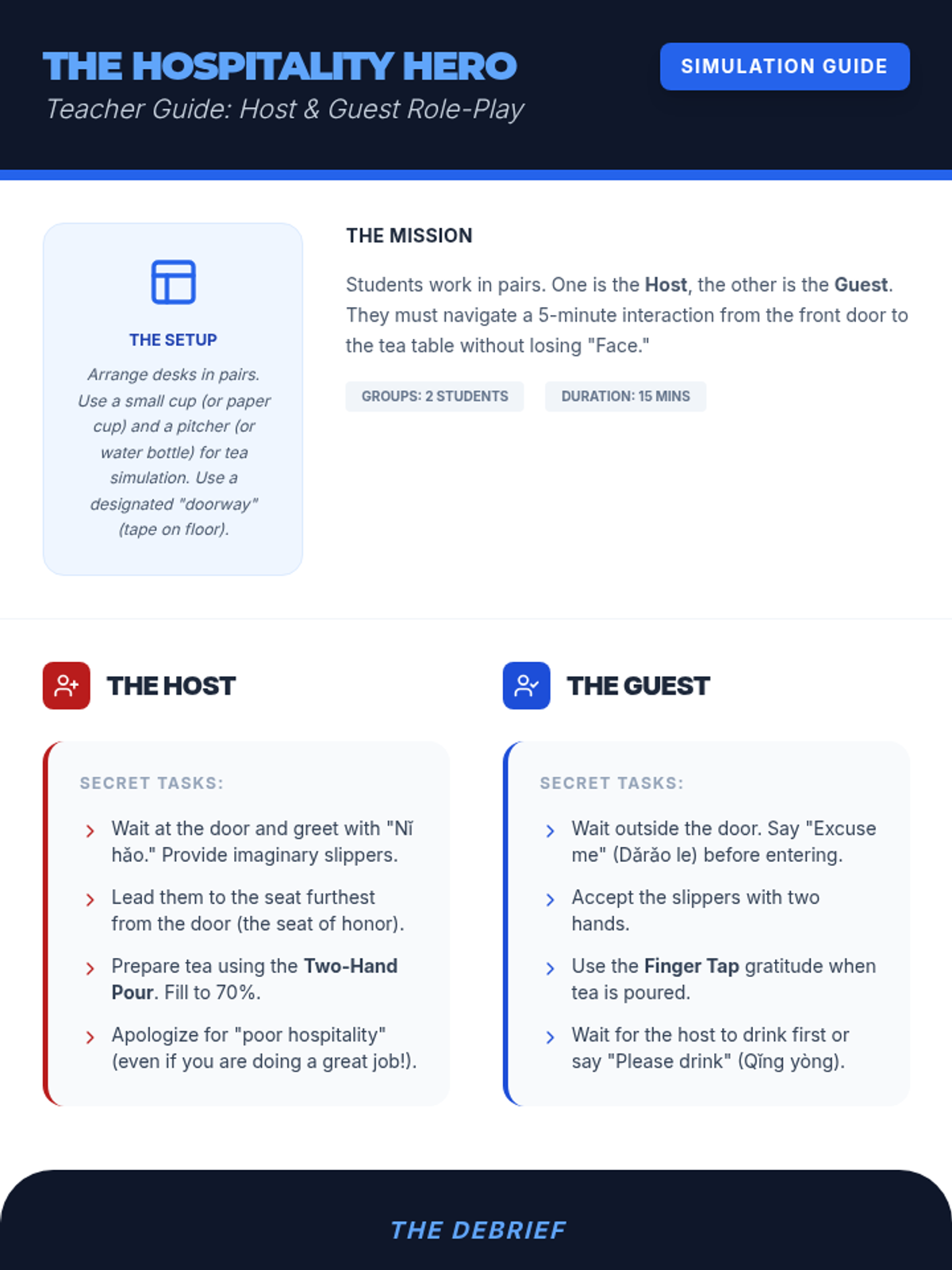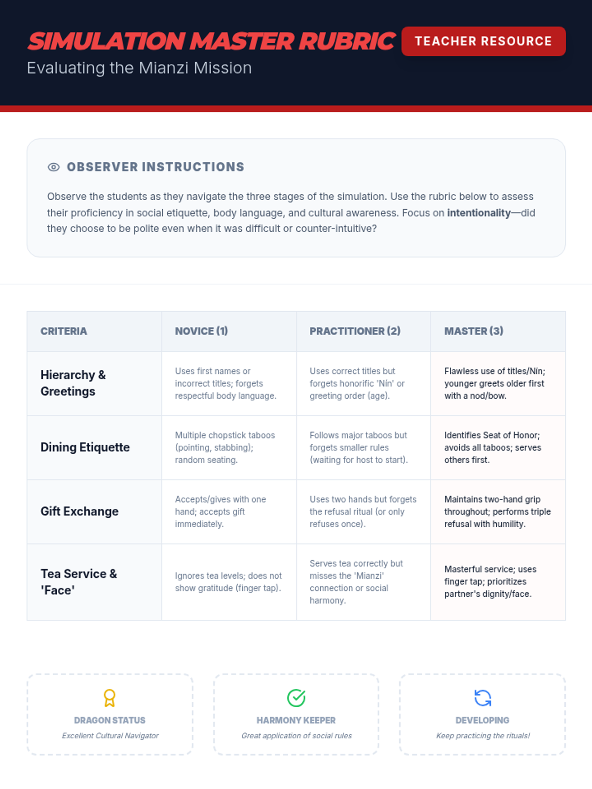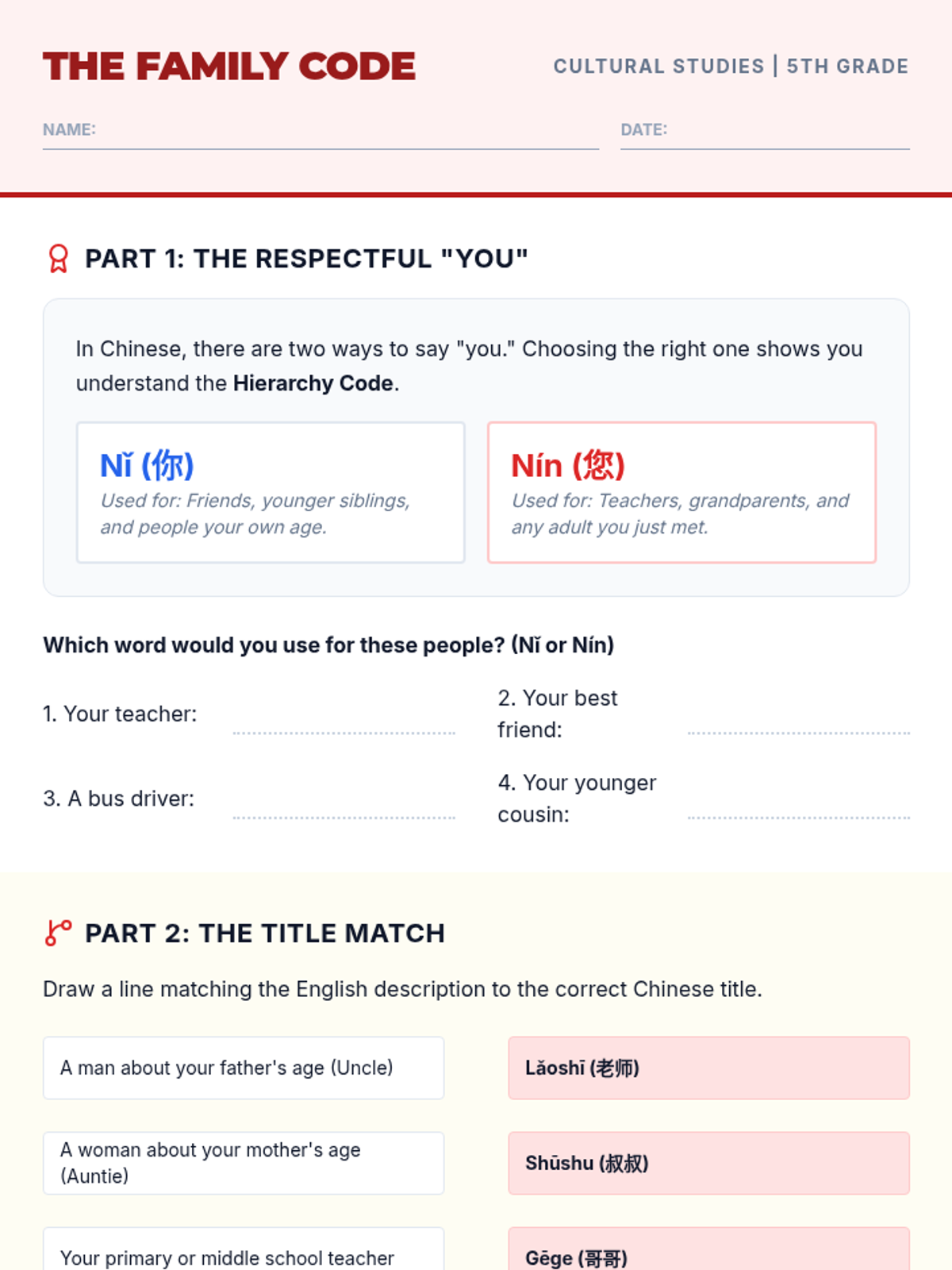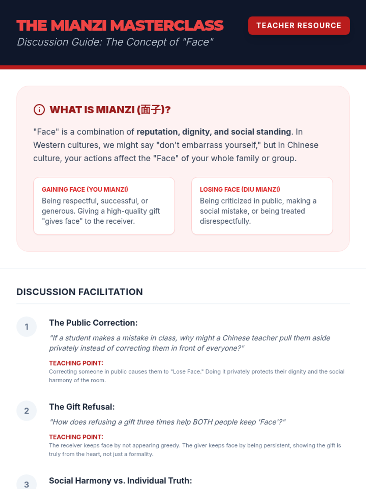 A 5th-grade cultural exploration of Chinese social etiquette, focusing on respect, hierarchy, dining, and the concept of 'Face' (Mianzi) through simulations and role-play.