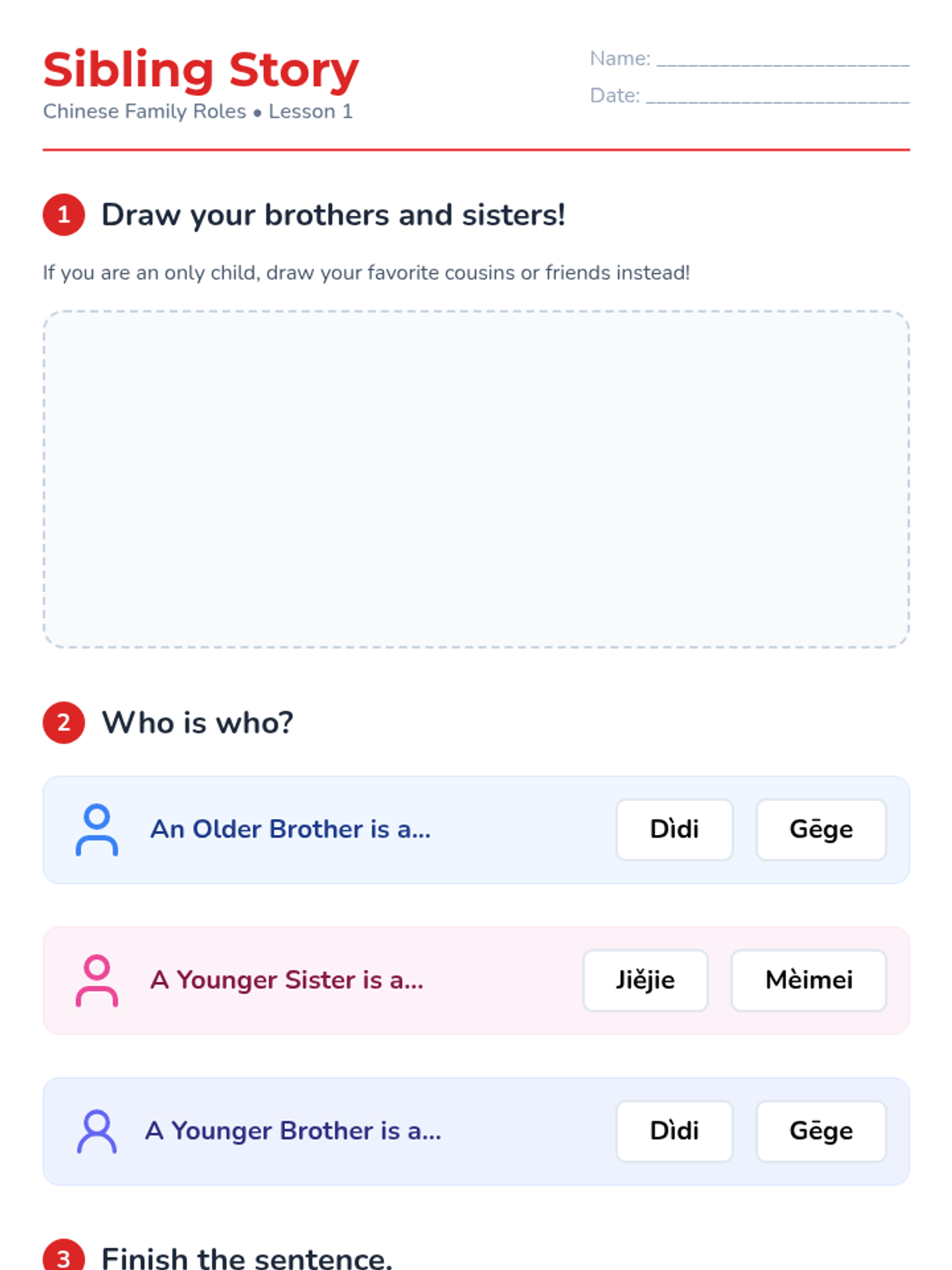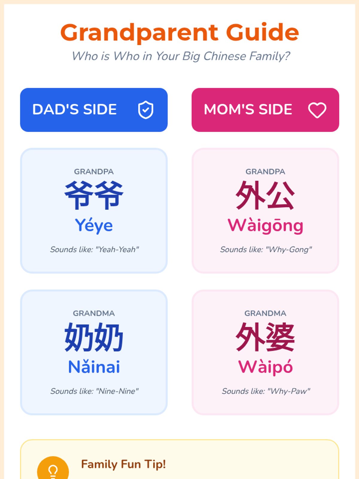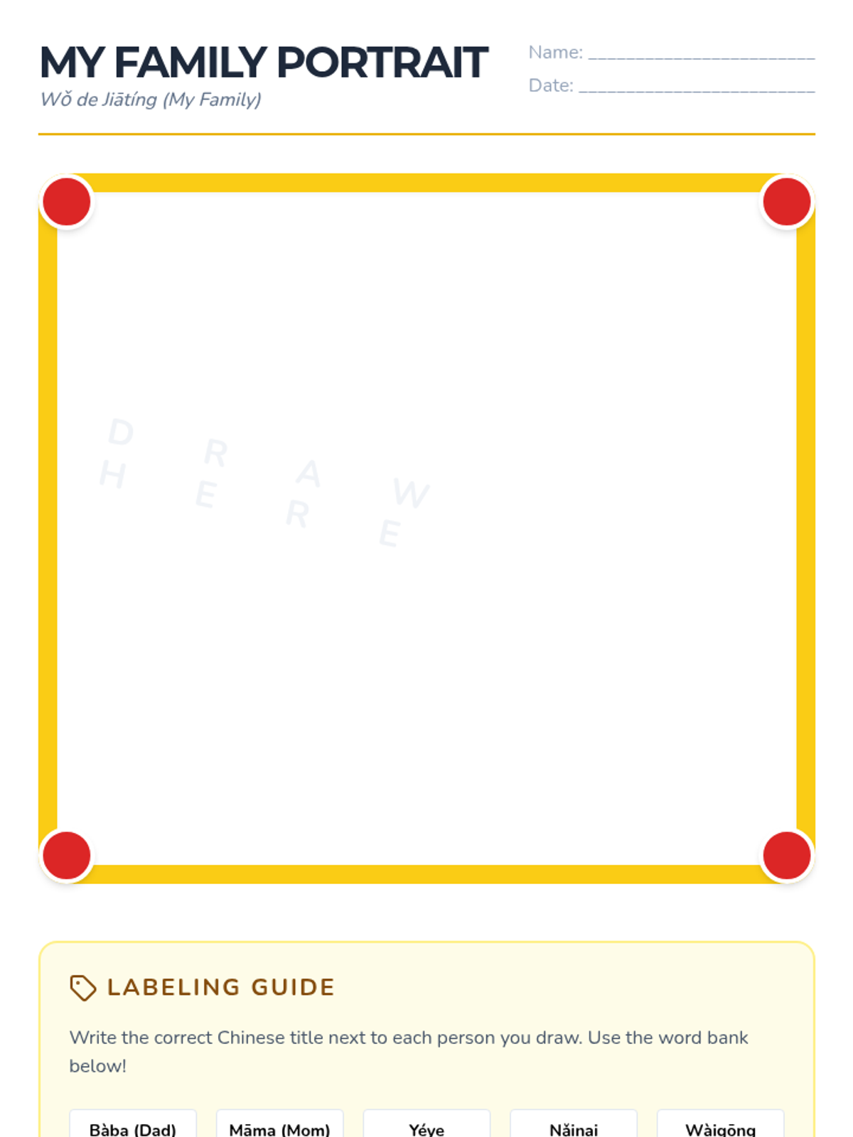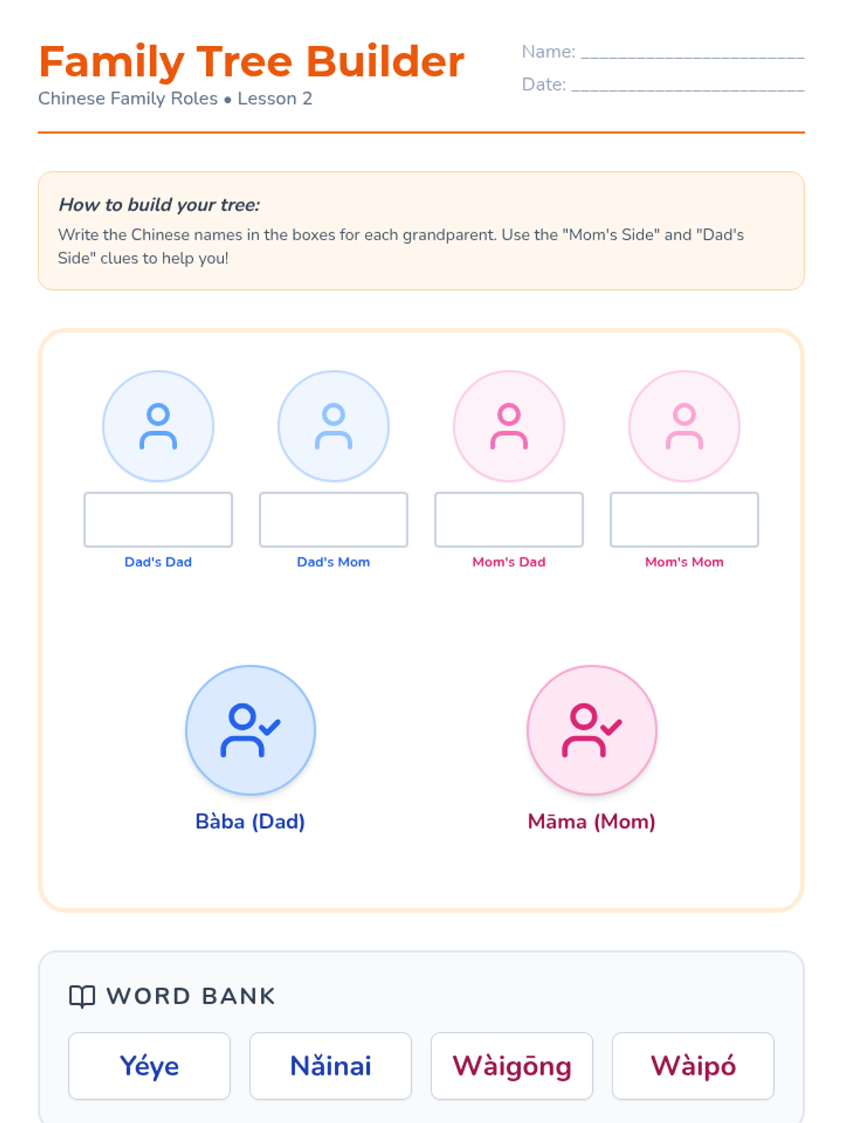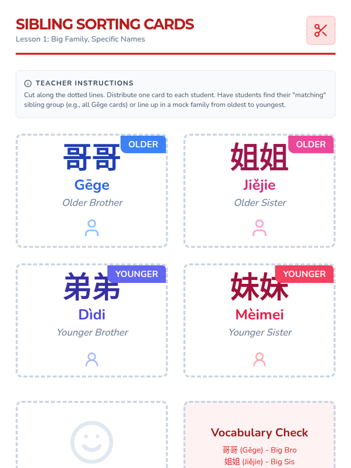This sequence explores the central role of family in Chinese culture through the lens of Confucian values adapted for young children. Students learn specific vocabulary for family members, distinguishing between maternal and paternal sides, and explore the concept of filial piety through stories and role-play.
