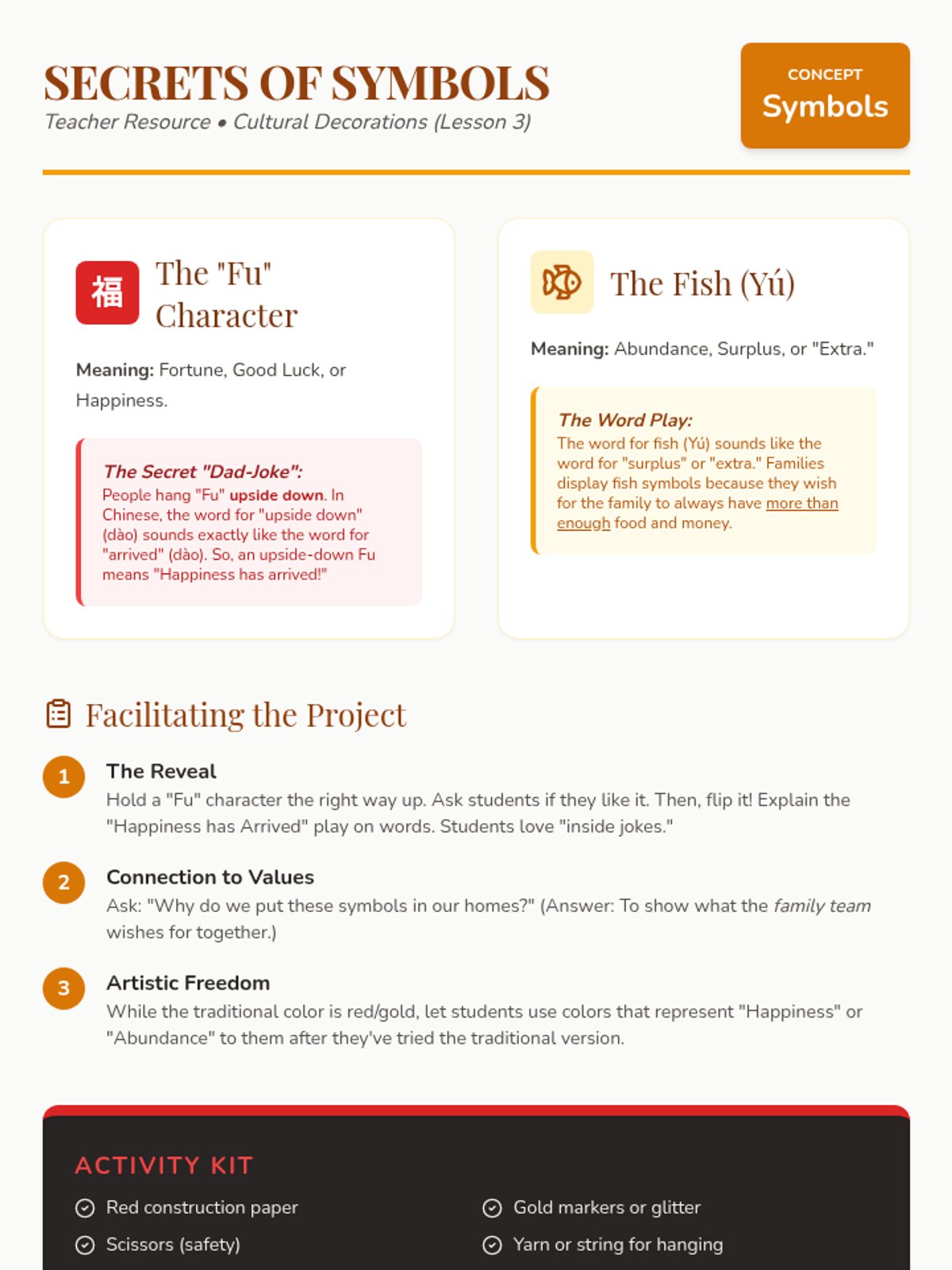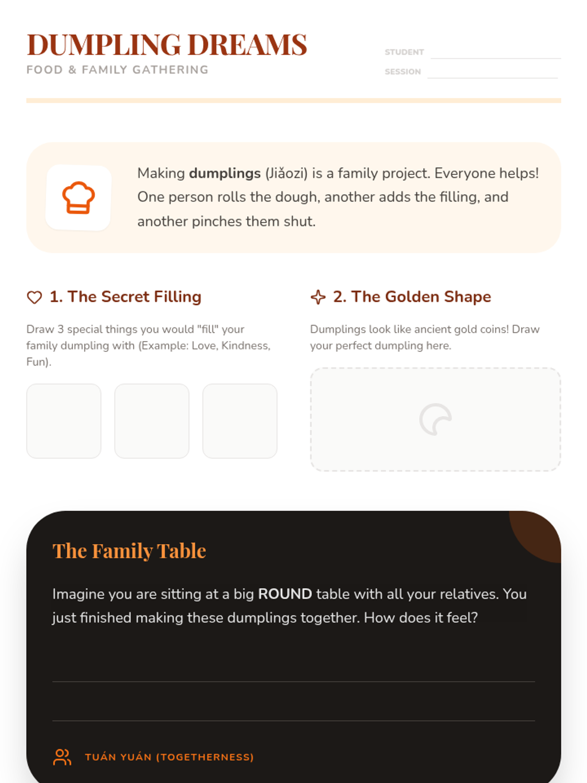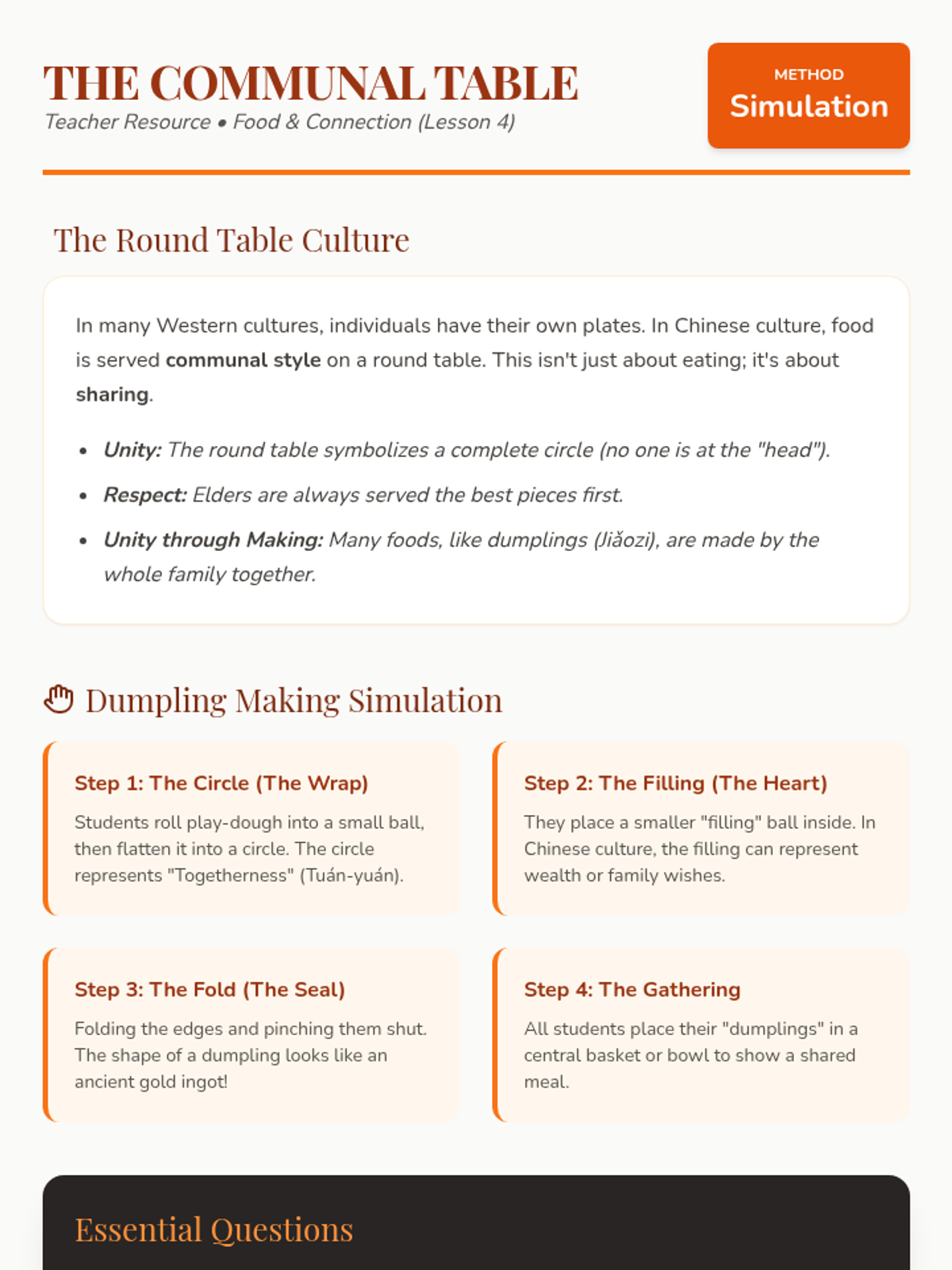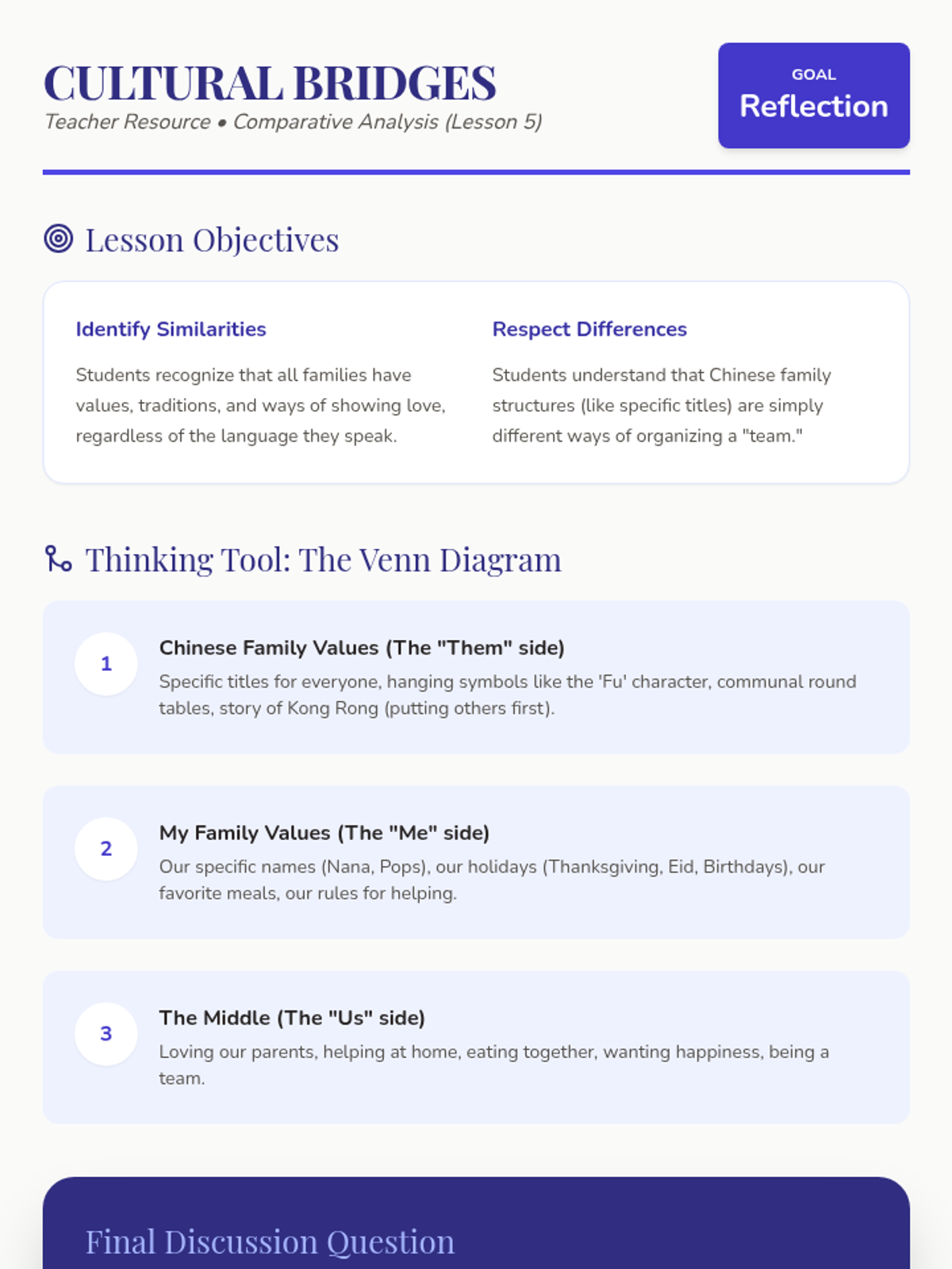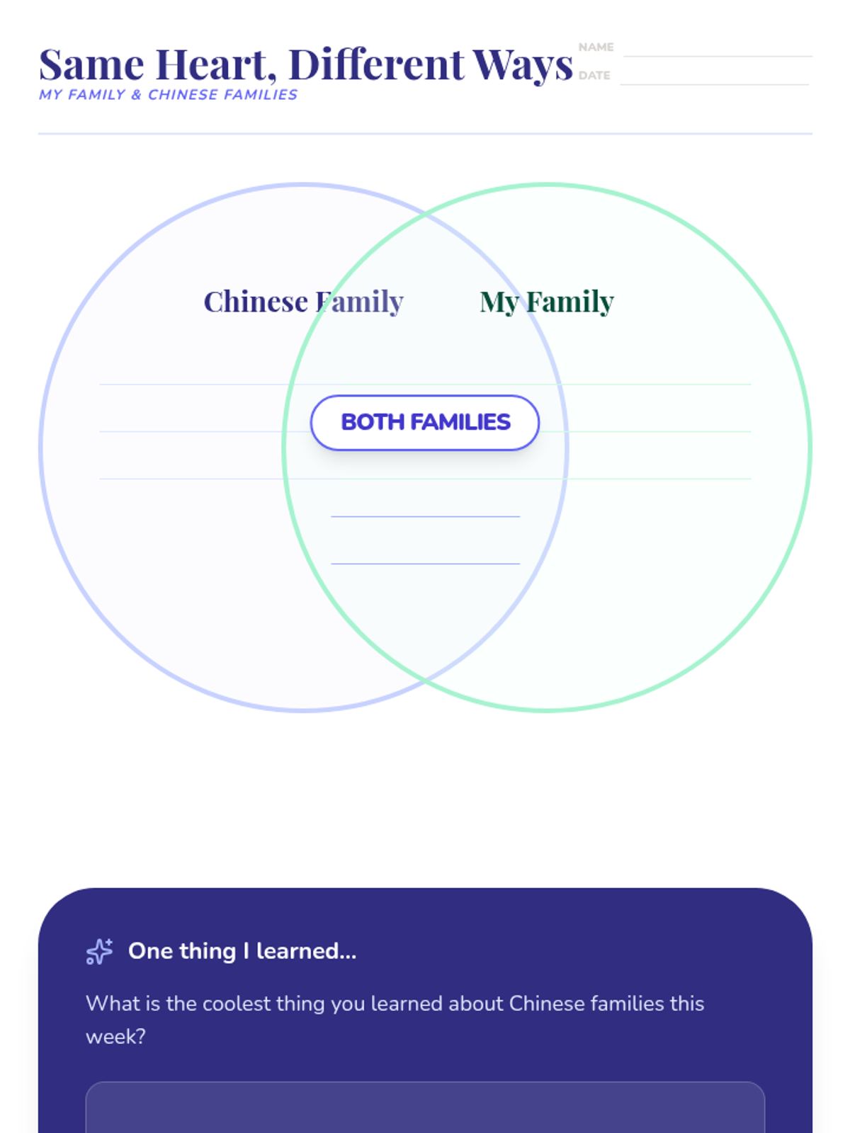 This inquiry-based sequence explores the central role of family in Chinese life, introducing students to specific terminology, the concept of filial piety, symbols of happiness, and communal dining traditions. students conclude by comparing these traditions to their own.