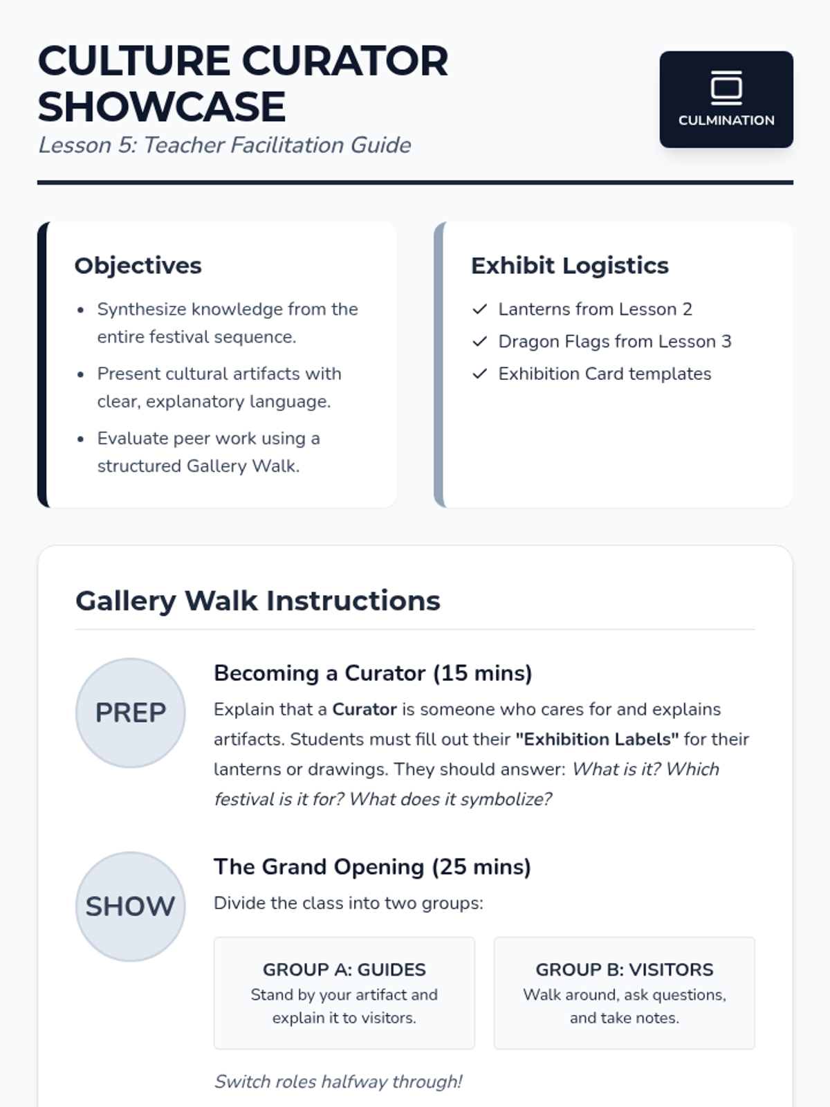 A 5-lesson journey into major Chinese festivals, exploring legends, symbolism, and communal values through storytelling, crafts, and collaborative exhibitions.
