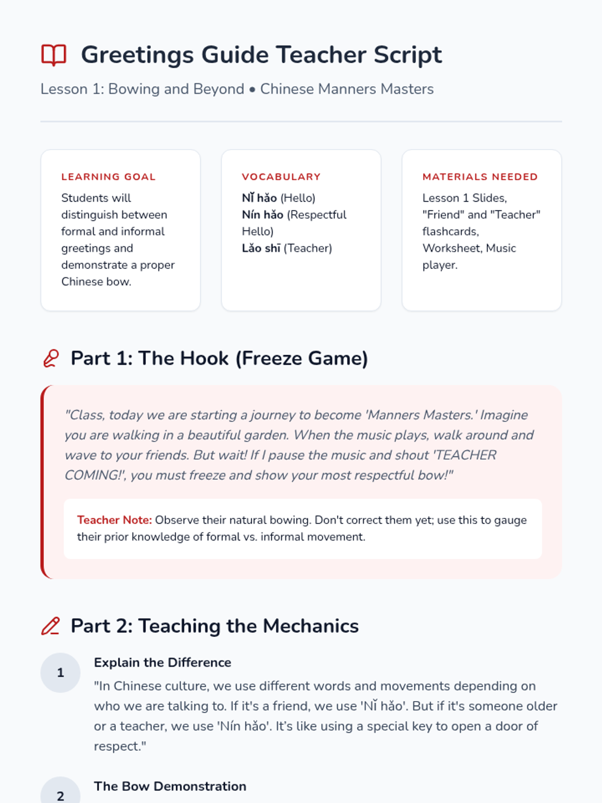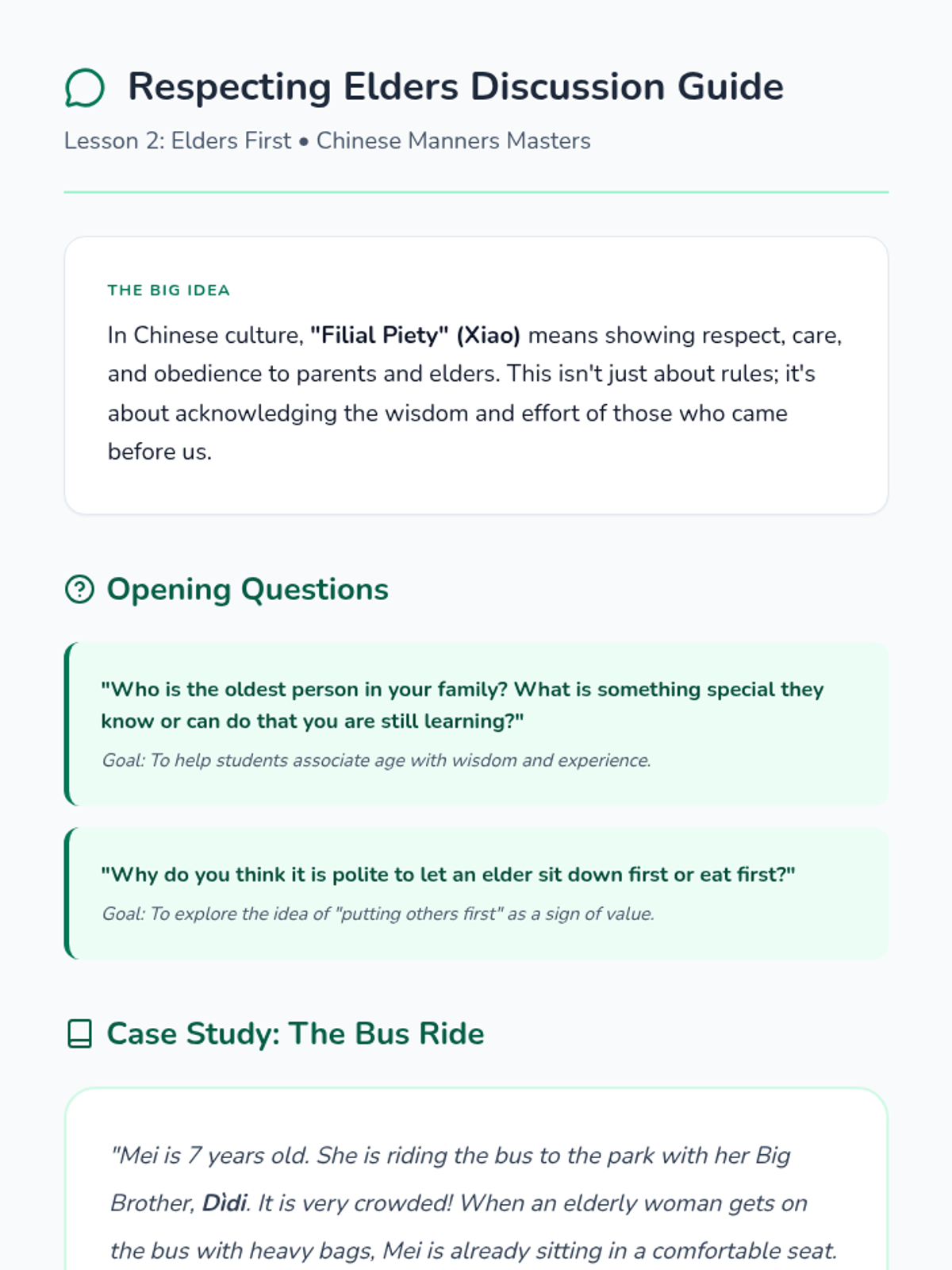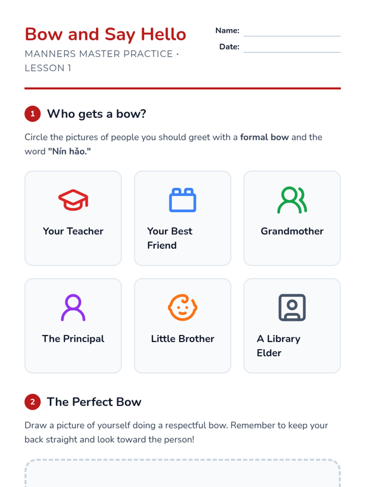 A 2nd-grade cultural exploration sequence focused on traditional Chinese social etiquette, covering greetings, elder respect, dining manners, and gift-giving rituals. Students learn to demonstrate respect through non-verbal communication and specific social protocols.