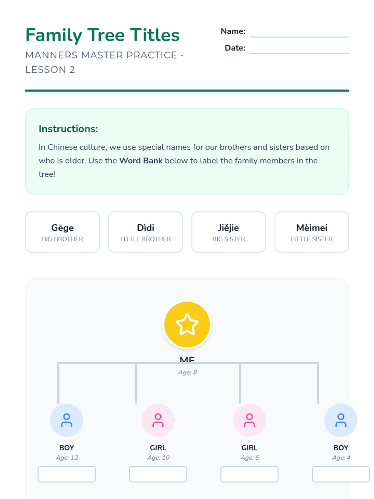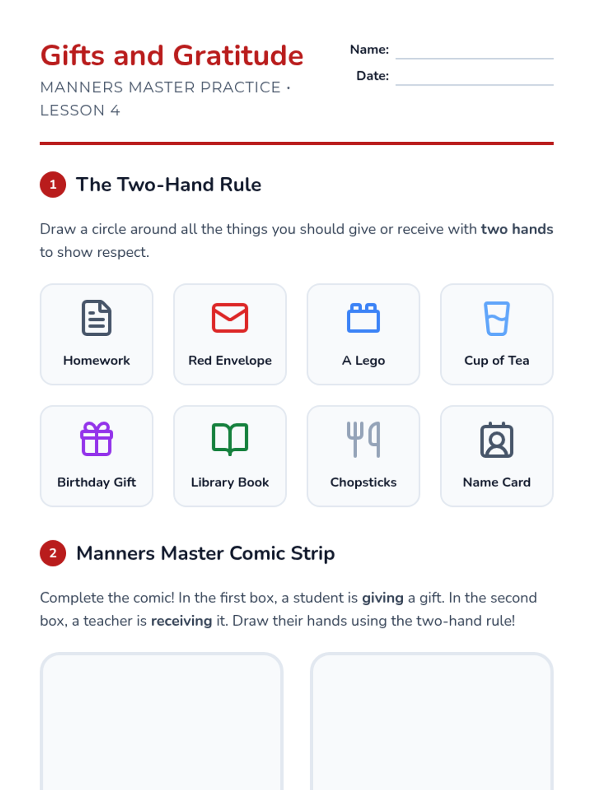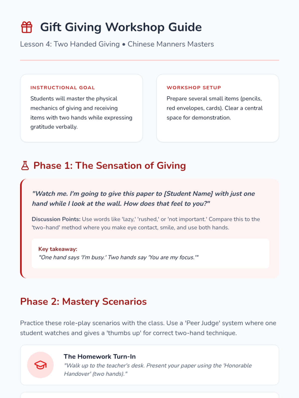 A 2nd-grade cultural exploration sequence focused on traditional Chinese social etiquette, covering greetings, elder respect, dining manners, and gift-giving rituals. Students learn to demonstrate respect through non-verbal communication and specific social protocols.
