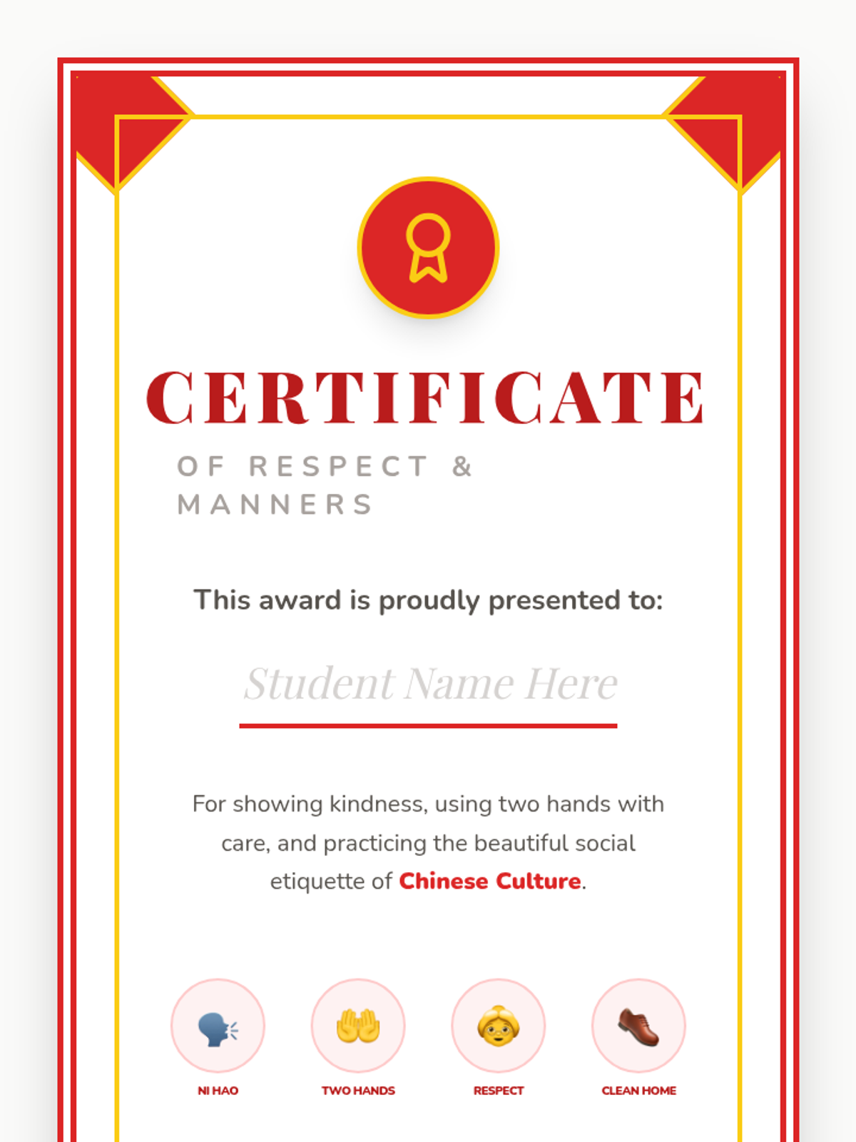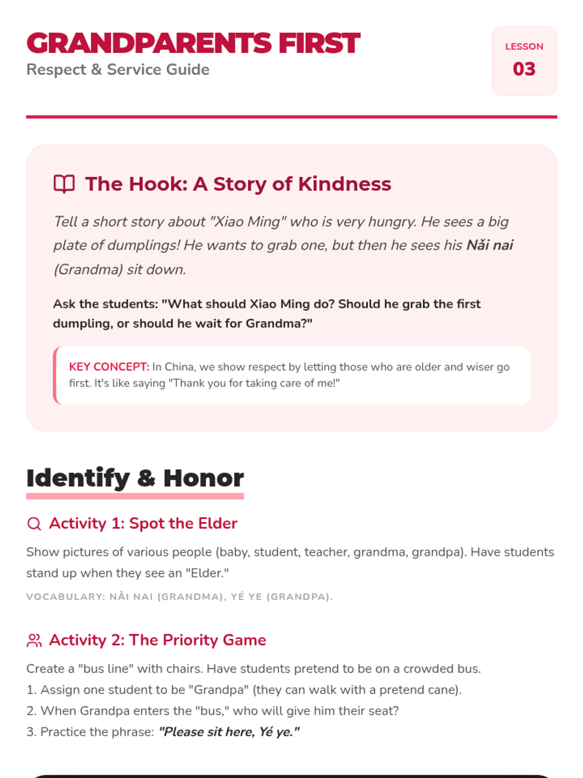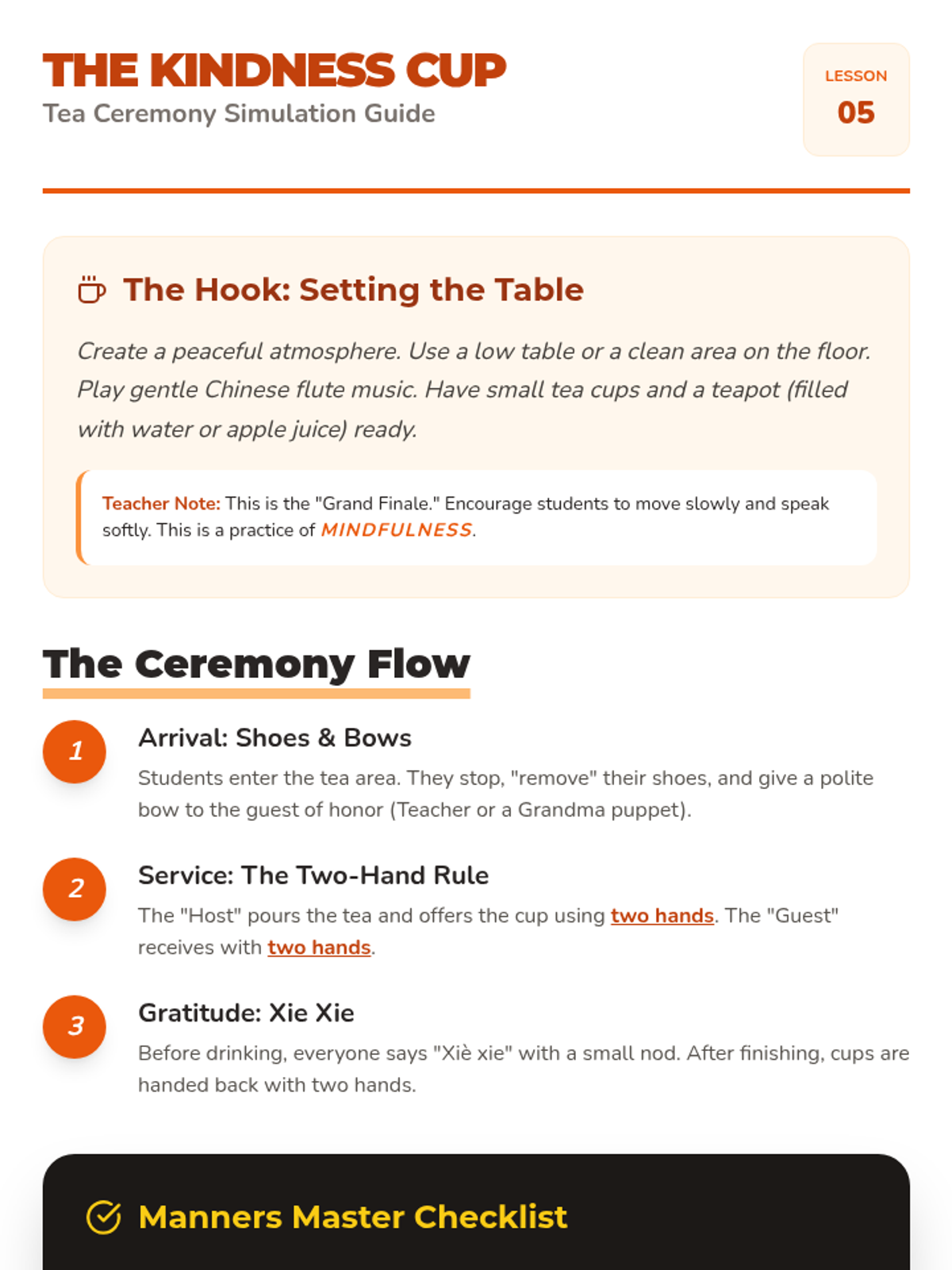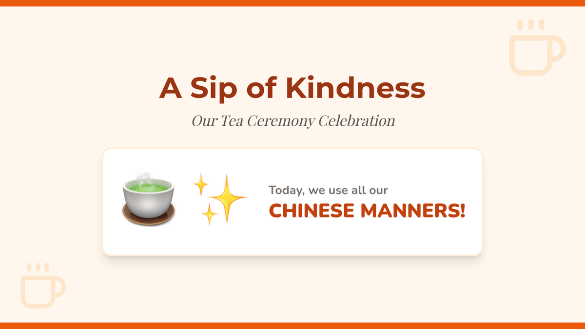 A kindergarten-level introduction to Chinese social etiquette, focusing on greetings, respect for elders, the 'two-hand rule', home customs, and a culminating tea ceremony simulation. Students learn through role-play, games, and active participation to foster cultural awareness and empathy.