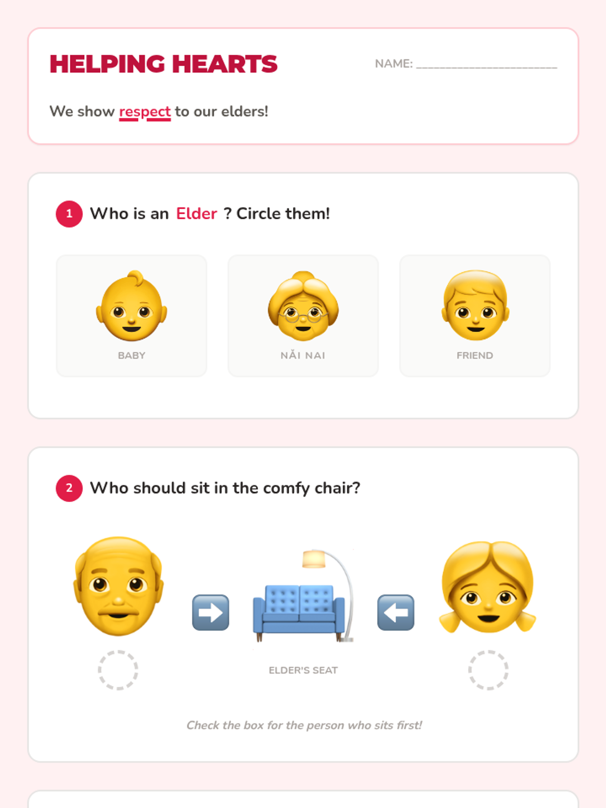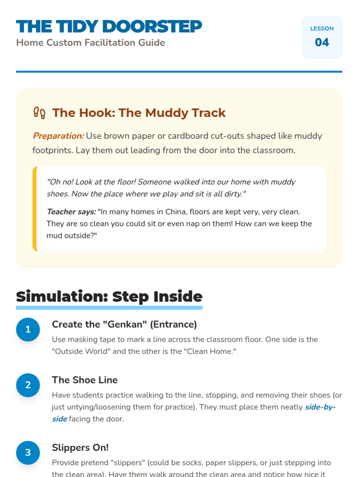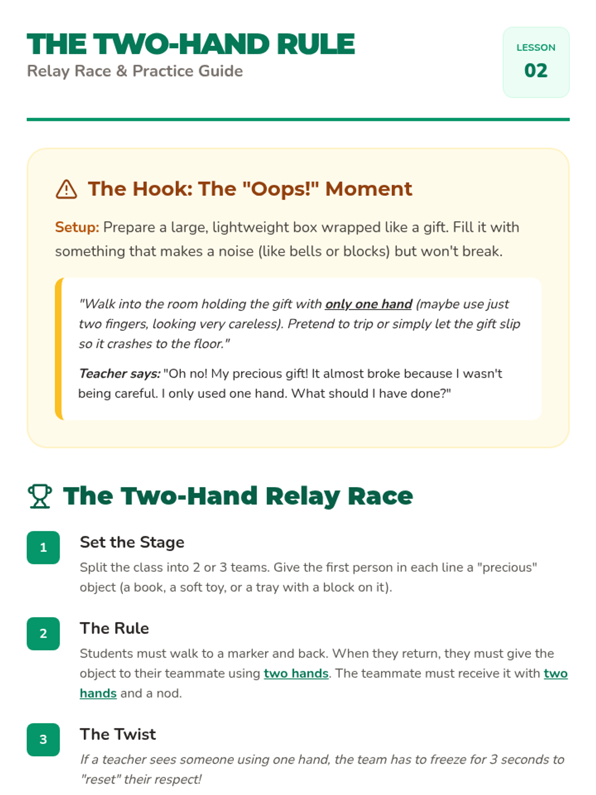 A kindergarten-level introduction to Chinese social etiquette, focusing on greetings, respect for elders, the 'two-hand rule', home customs, and a culminating tea ceremony simulation. Students learn through role-play, games, and active participation to foster cultural awareness and empathy.