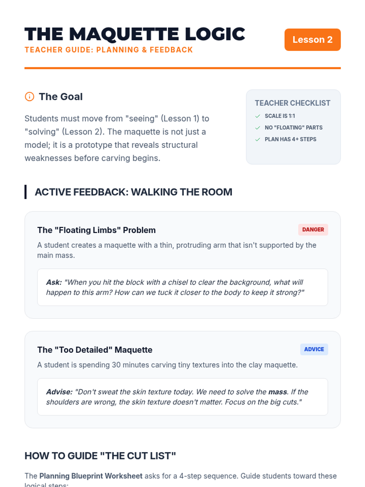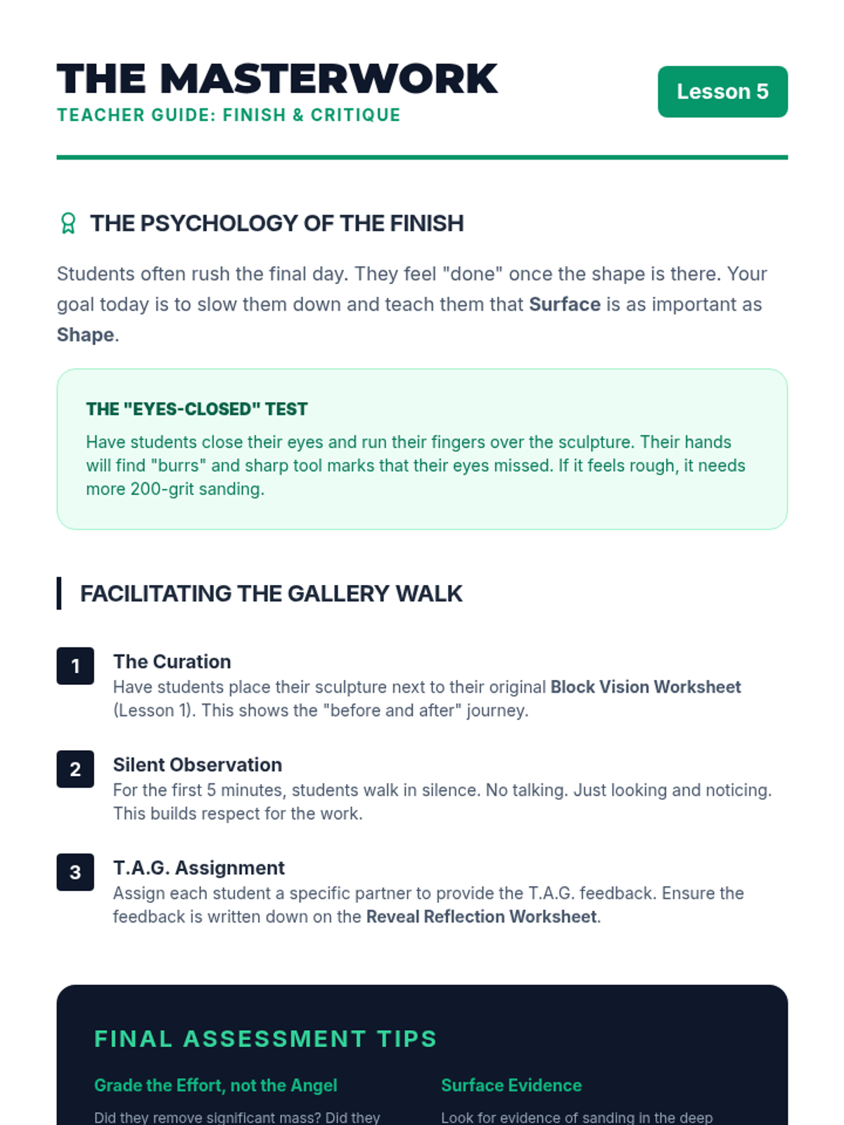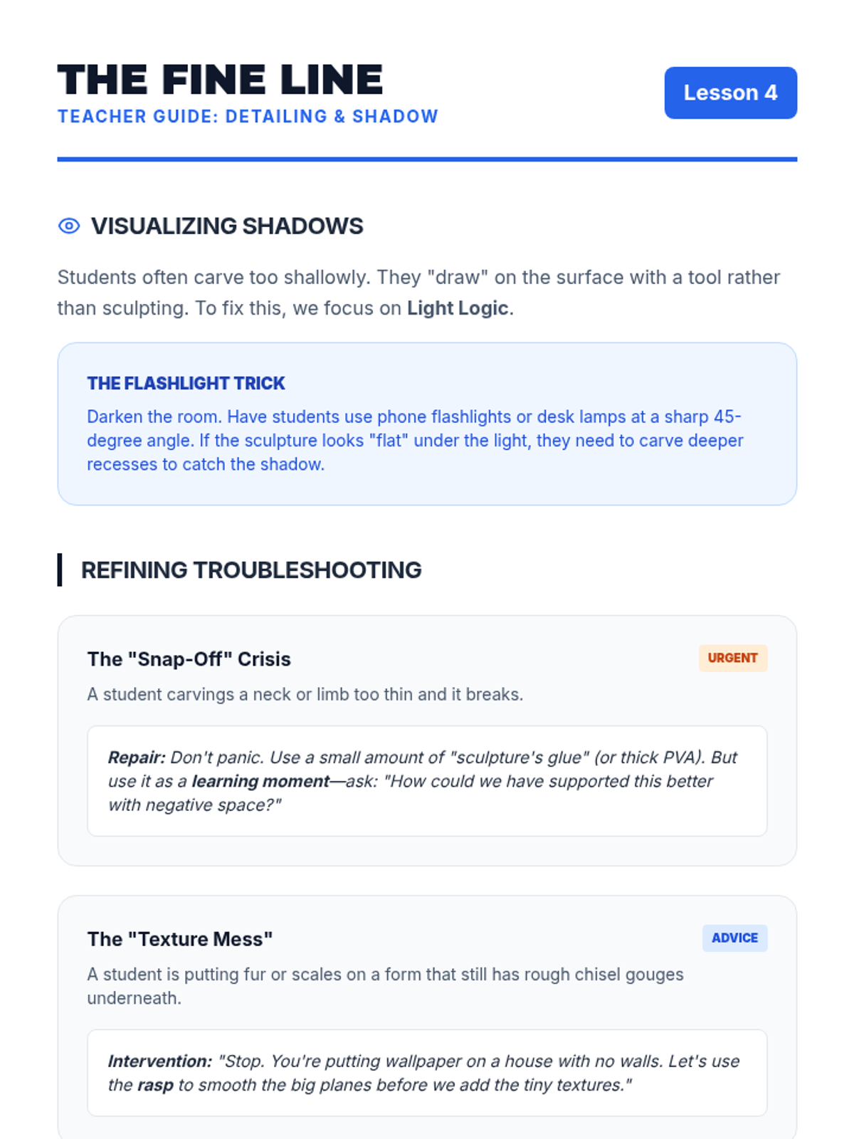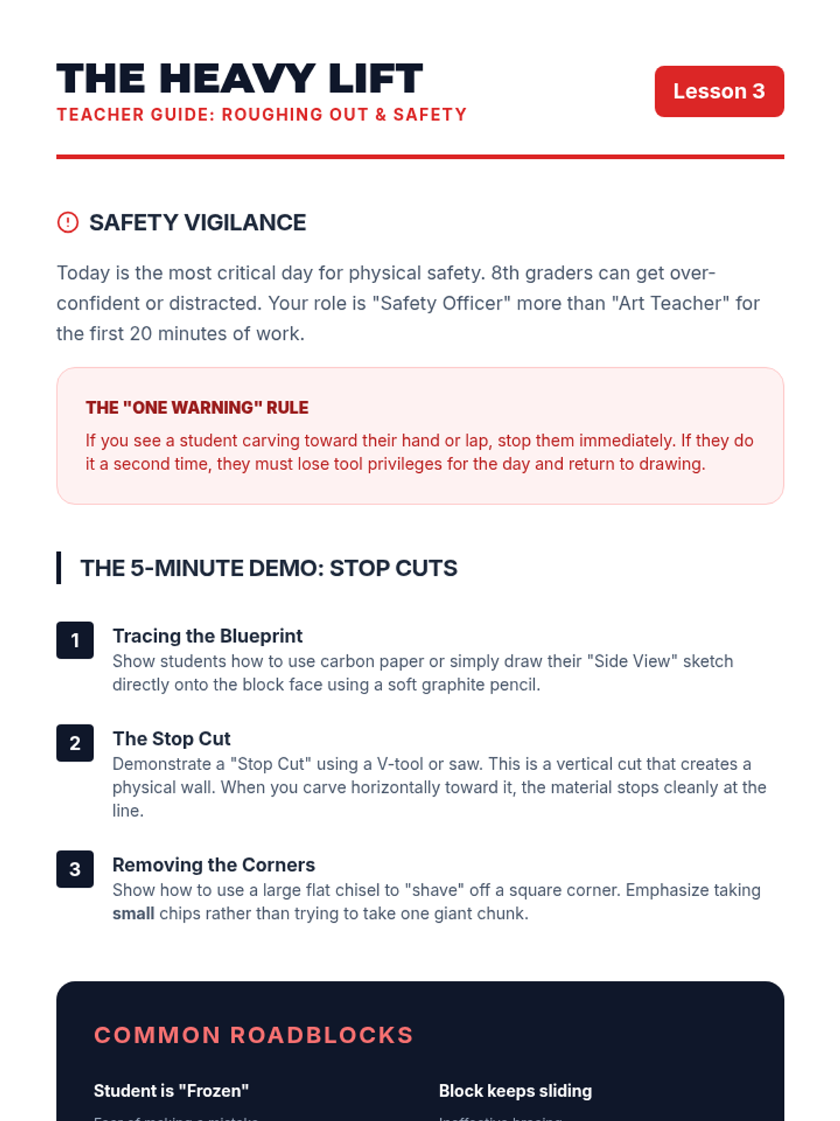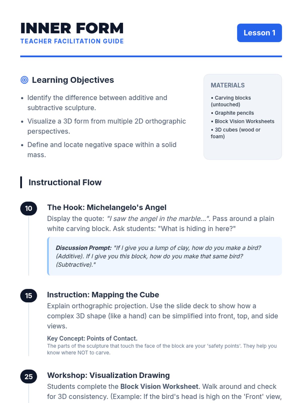 A comprehensive 8th-grade unit on subtractive sculpture, guiding students from visualization and planning with maquettes to rough carving, refining details, and final polishing. Students explore the concept of 'liberating' a form from a solid mass using soft carving blocks while mastering tool safety and spatial reasoning.