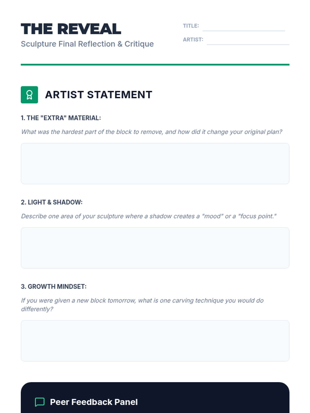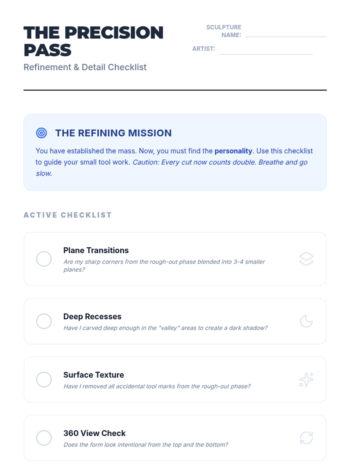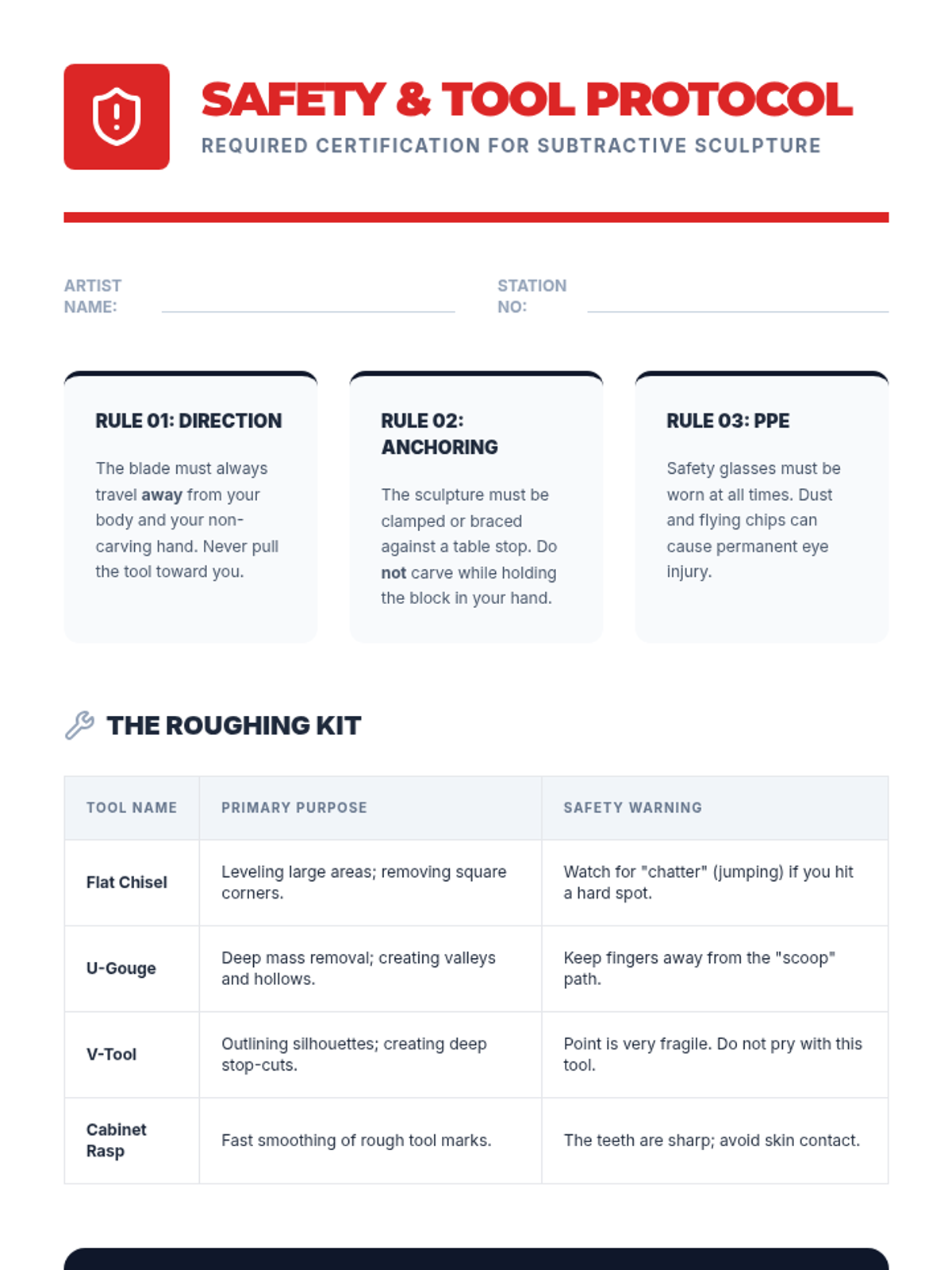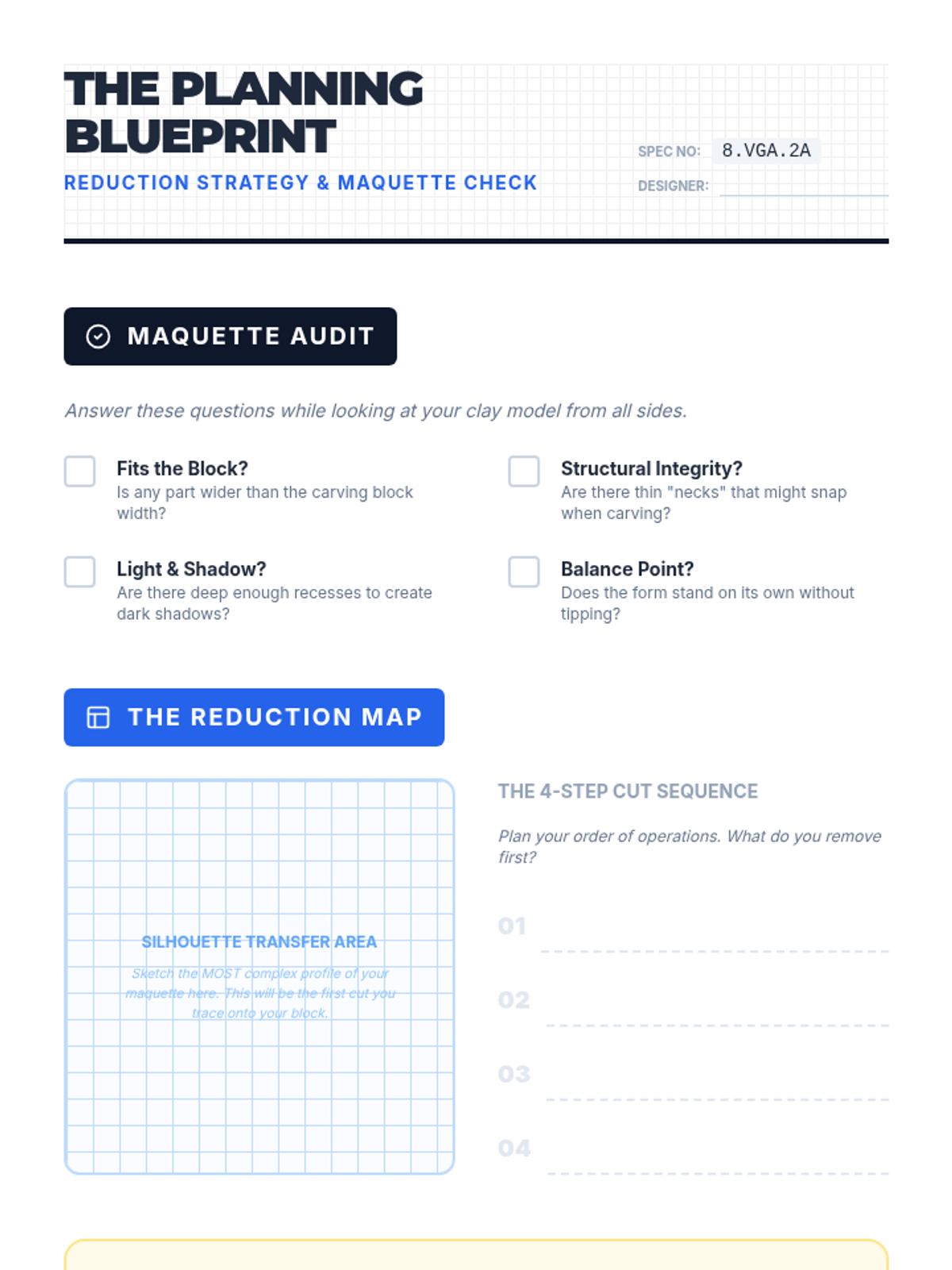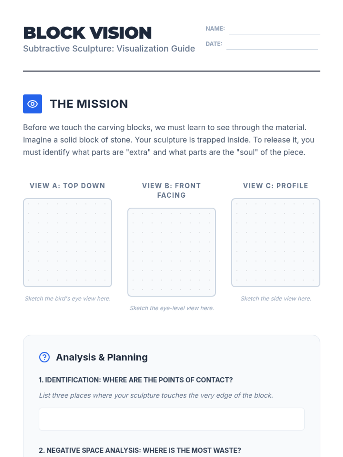 A comprehensive 8th-grade unit on subtractive sculpture, guiding students from visualization and planning with maquettes to rough carving, refining details, and final polishing. Students explore the concept of 'liberating' a form from a solid mass using soft carving blocks while mastering tool safety and spatial reasoning.