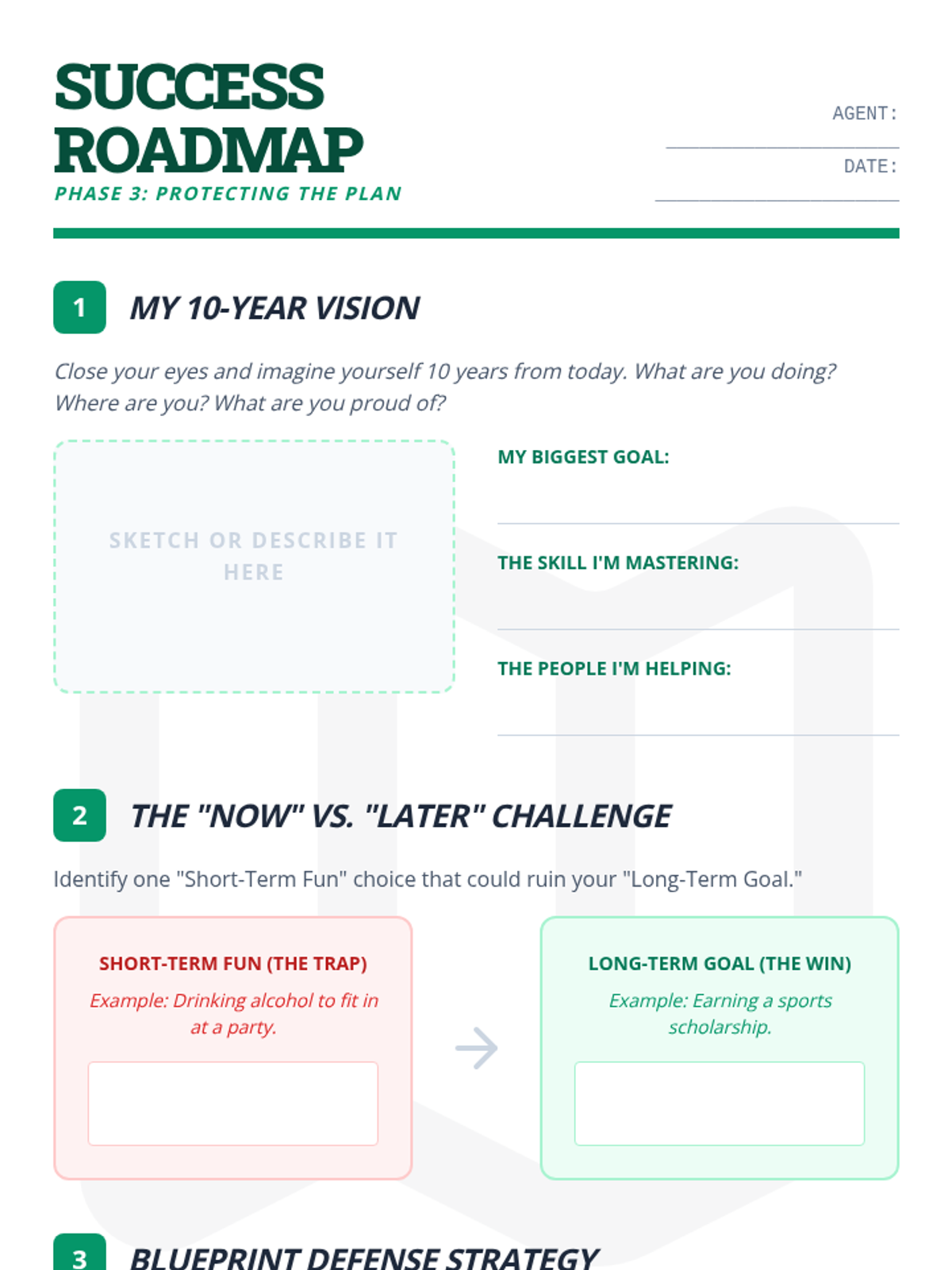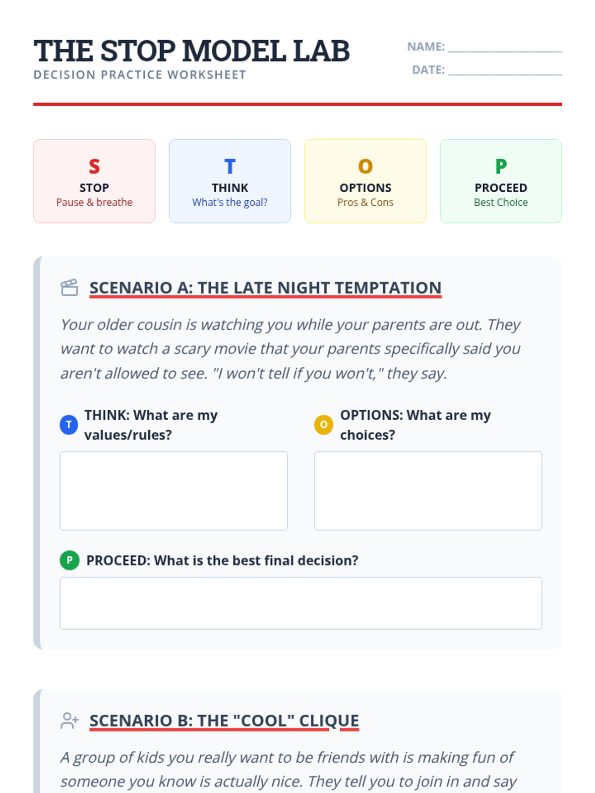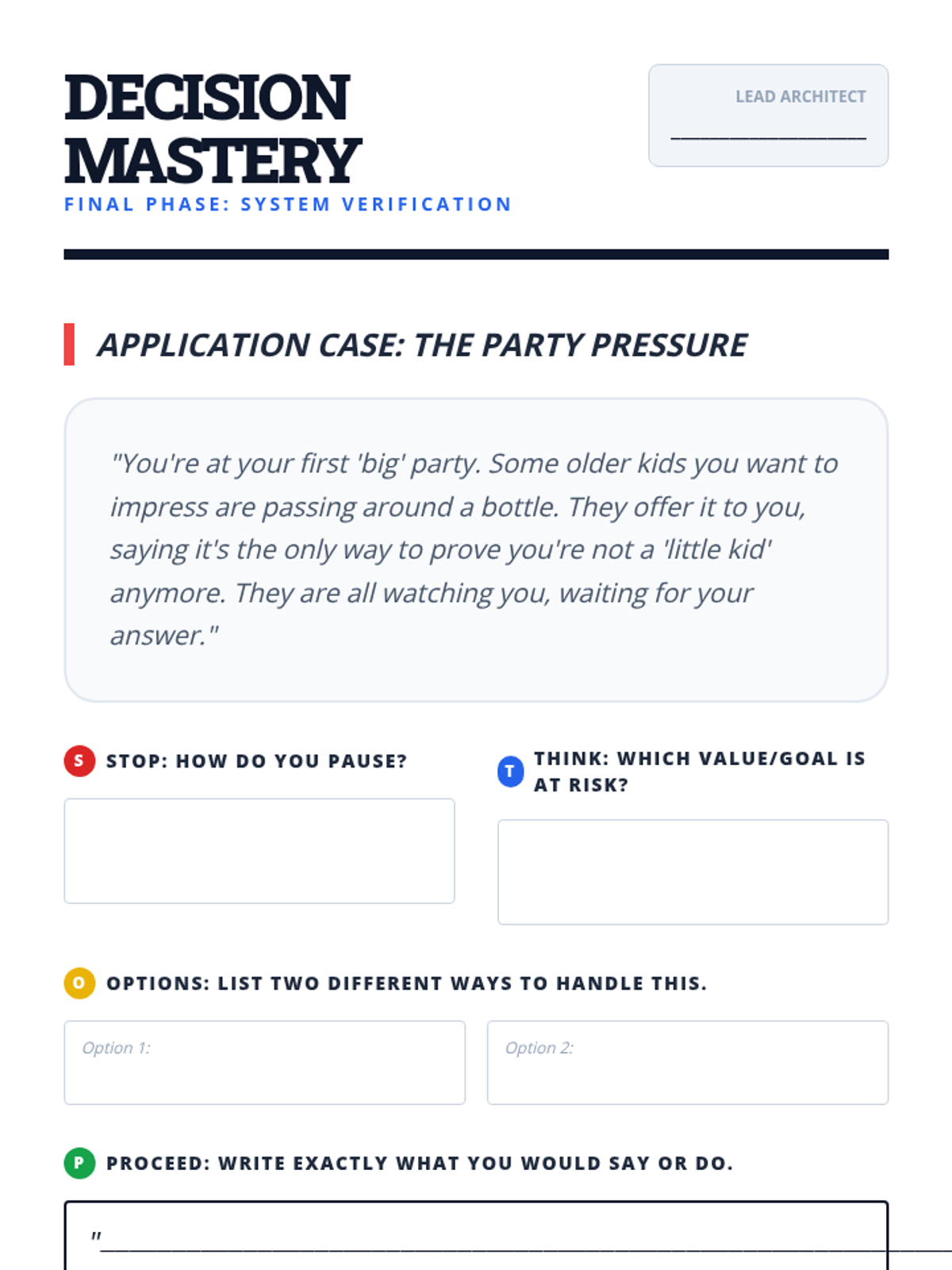 A 5th-grade sequence focusing on the internal cognitive process of decision-making regarding alcohol. Students learn to use the STOP model, identify personal values, evaluate influences, and connect their daily choices to long-term future goals.