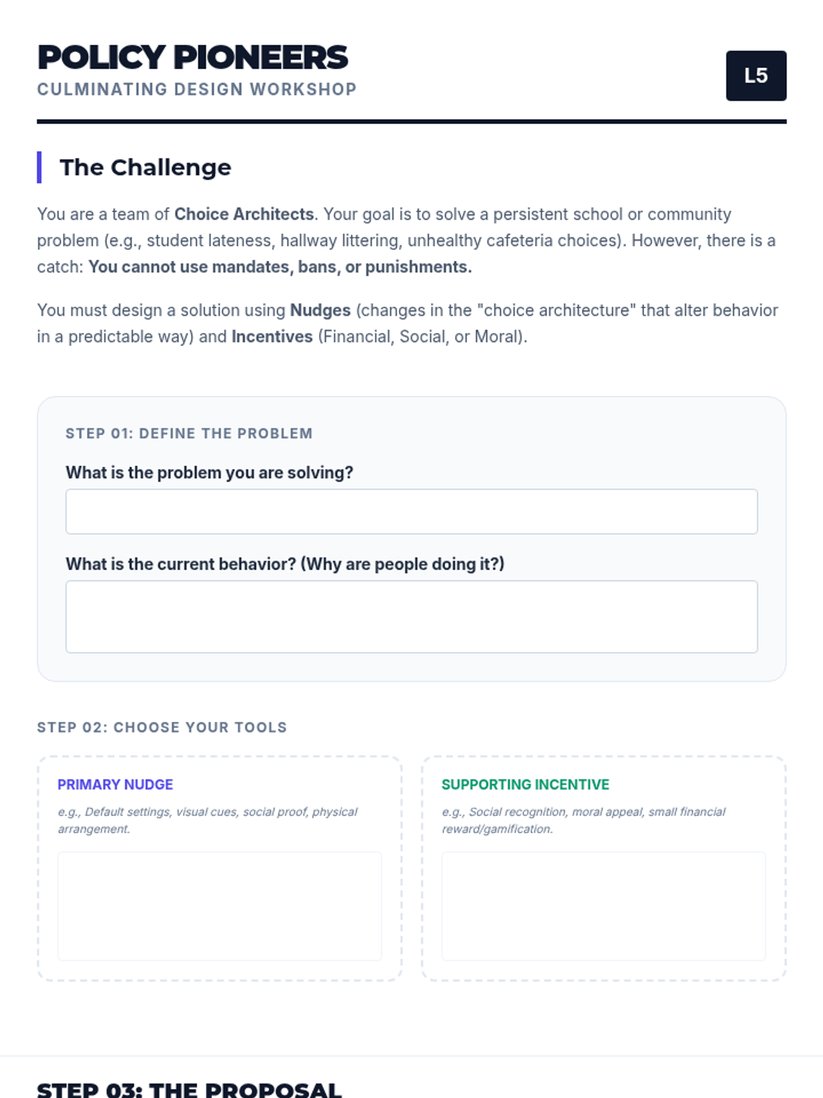 A comprehensive curriculum covering financial literacy, economic principles, and civic systems through historical case studies, ethical dilemmas, and real-world simulations.