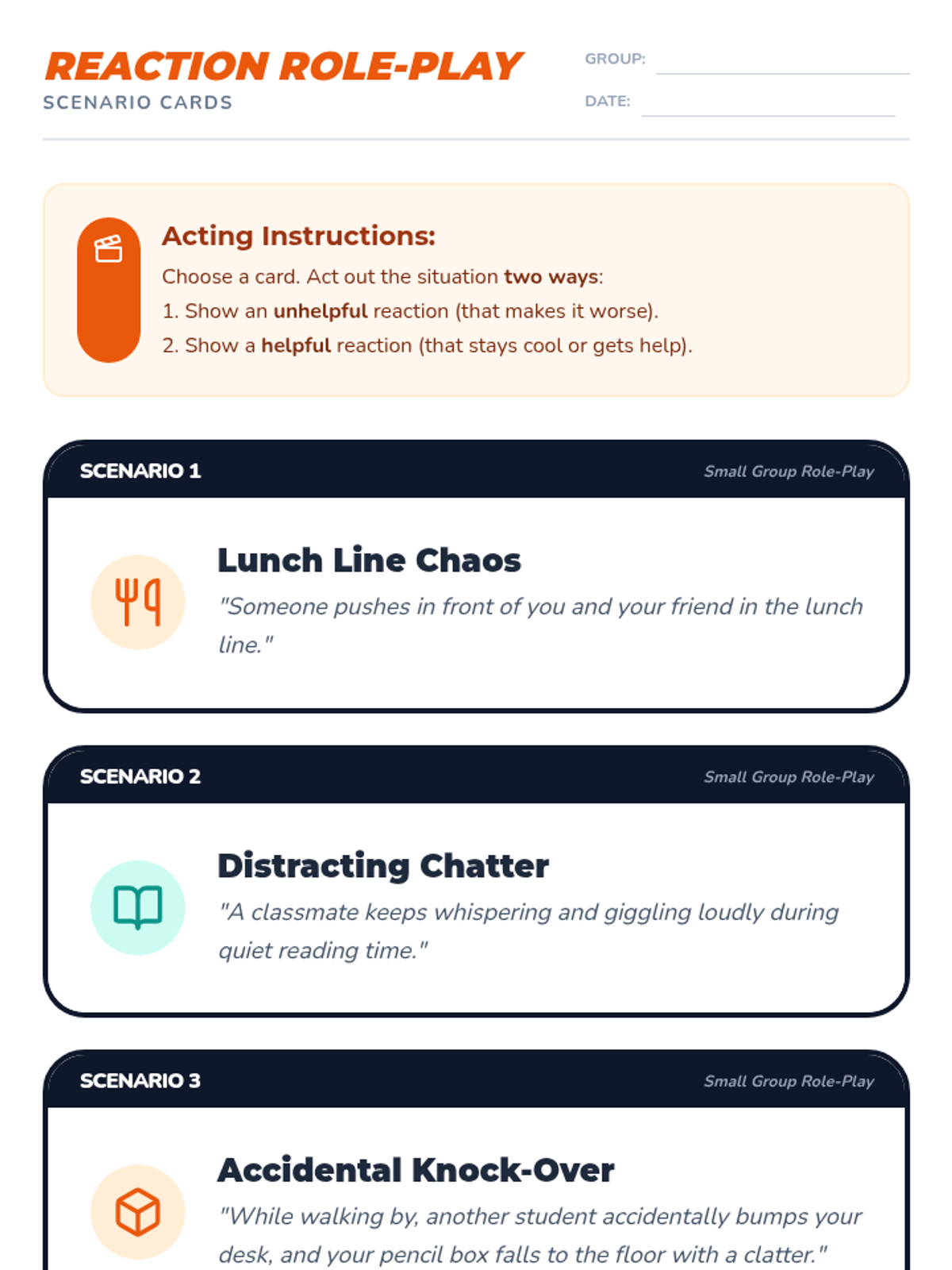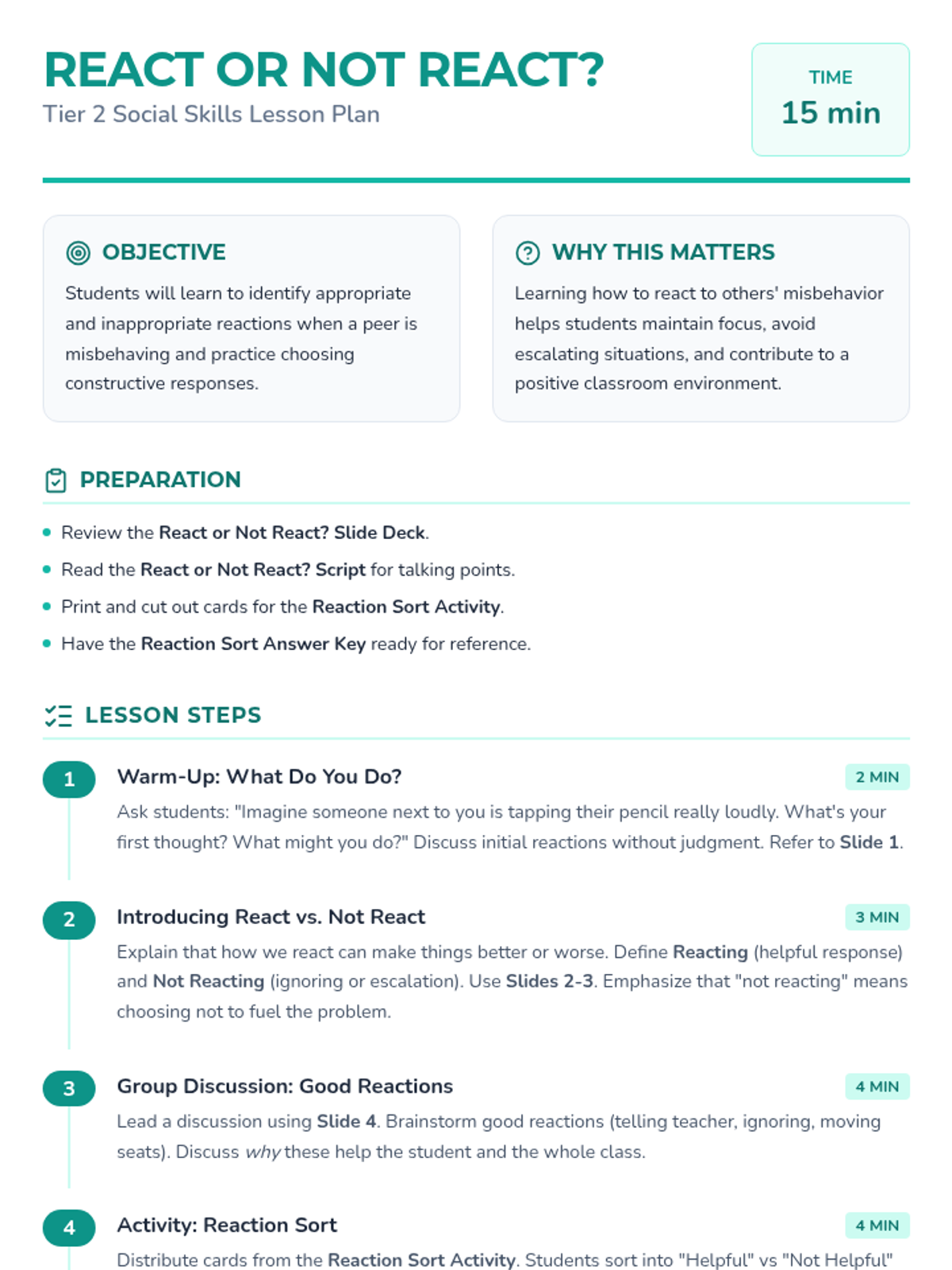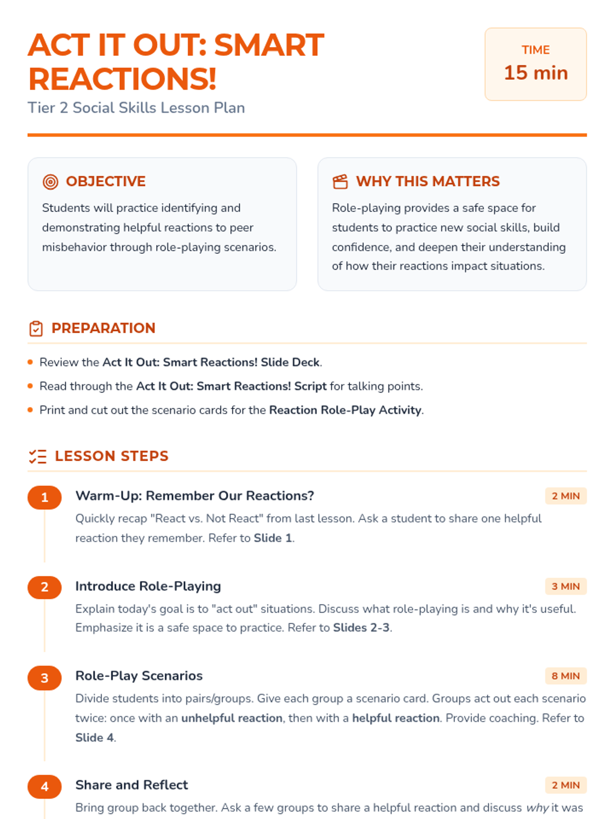 A two-part Tier 2 intervention sequence for 3rd graders focused on emotional regulation and social skills, specifically choosing helpful reactions to peer misbehavior.