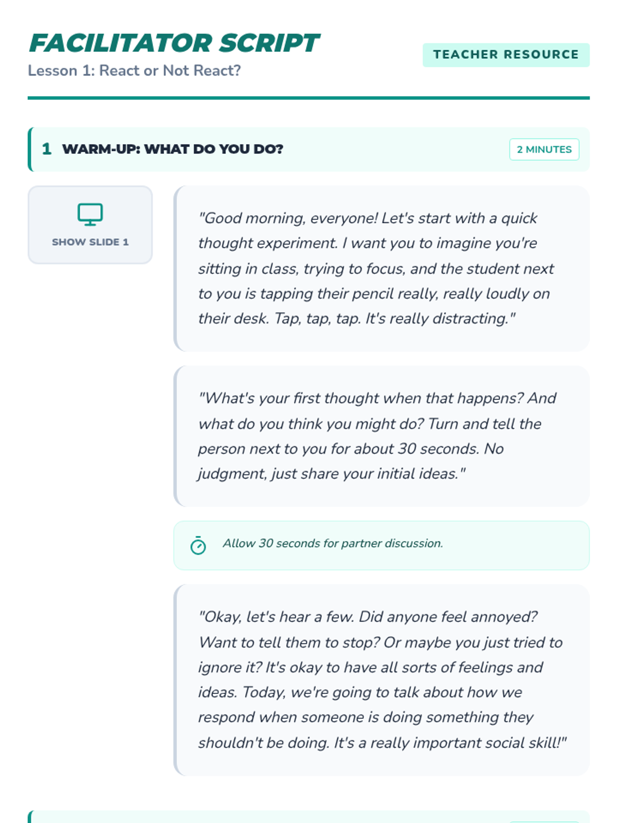 A comprehensive four-lesson series designed to help students identify their emotions, recognize physical triggers, build a coping toolbox, and align their reactions with the size of their problems.