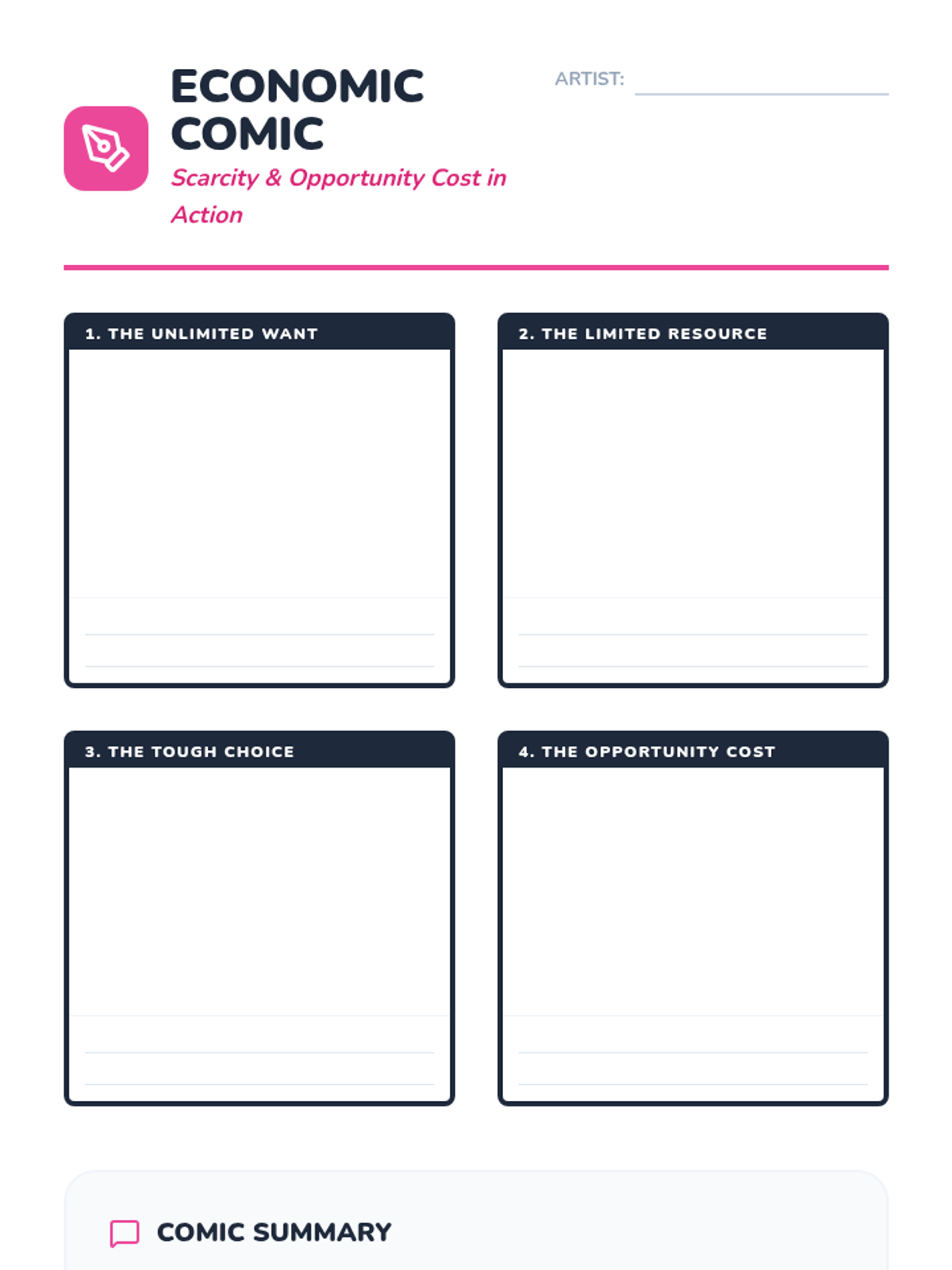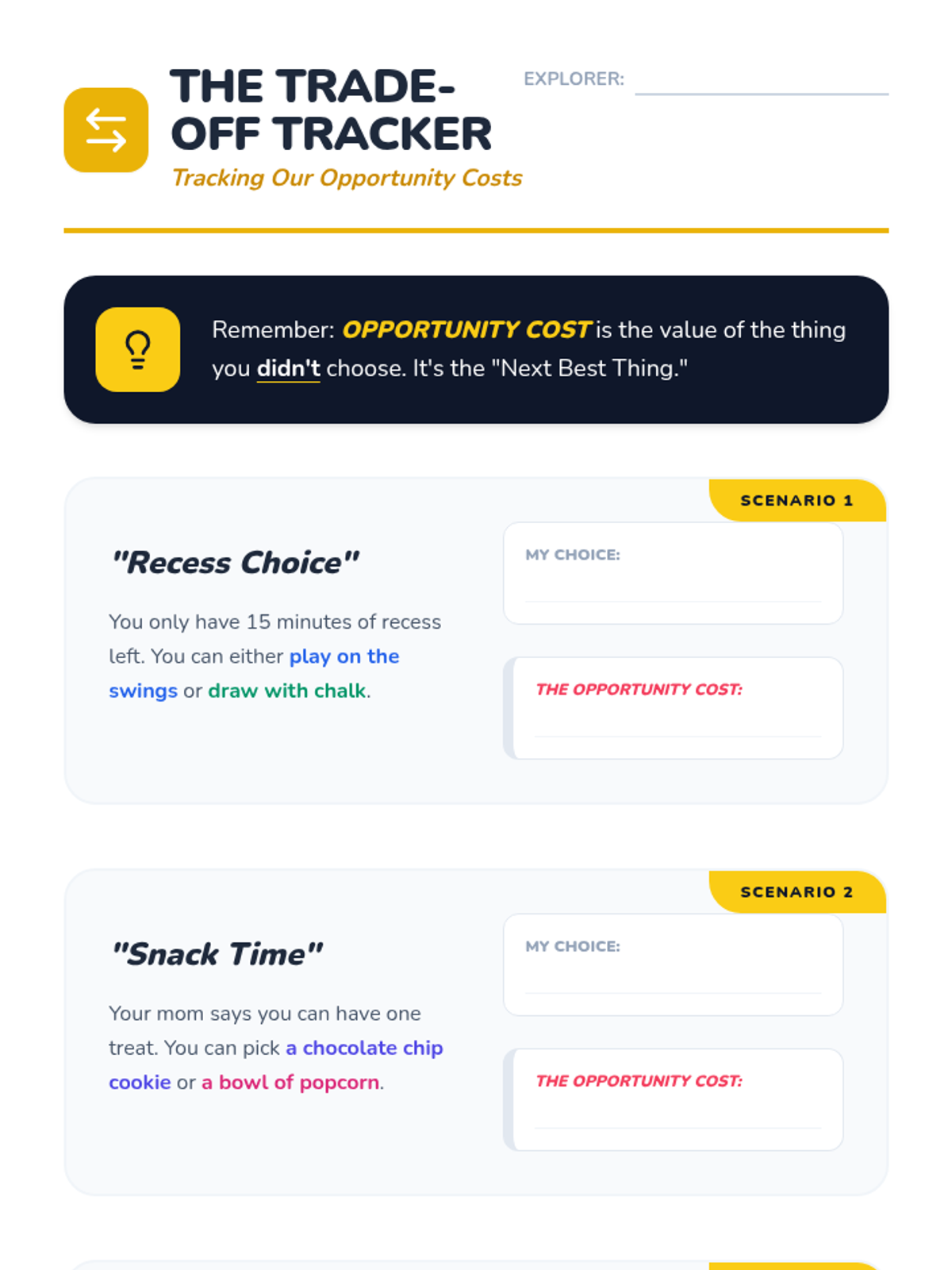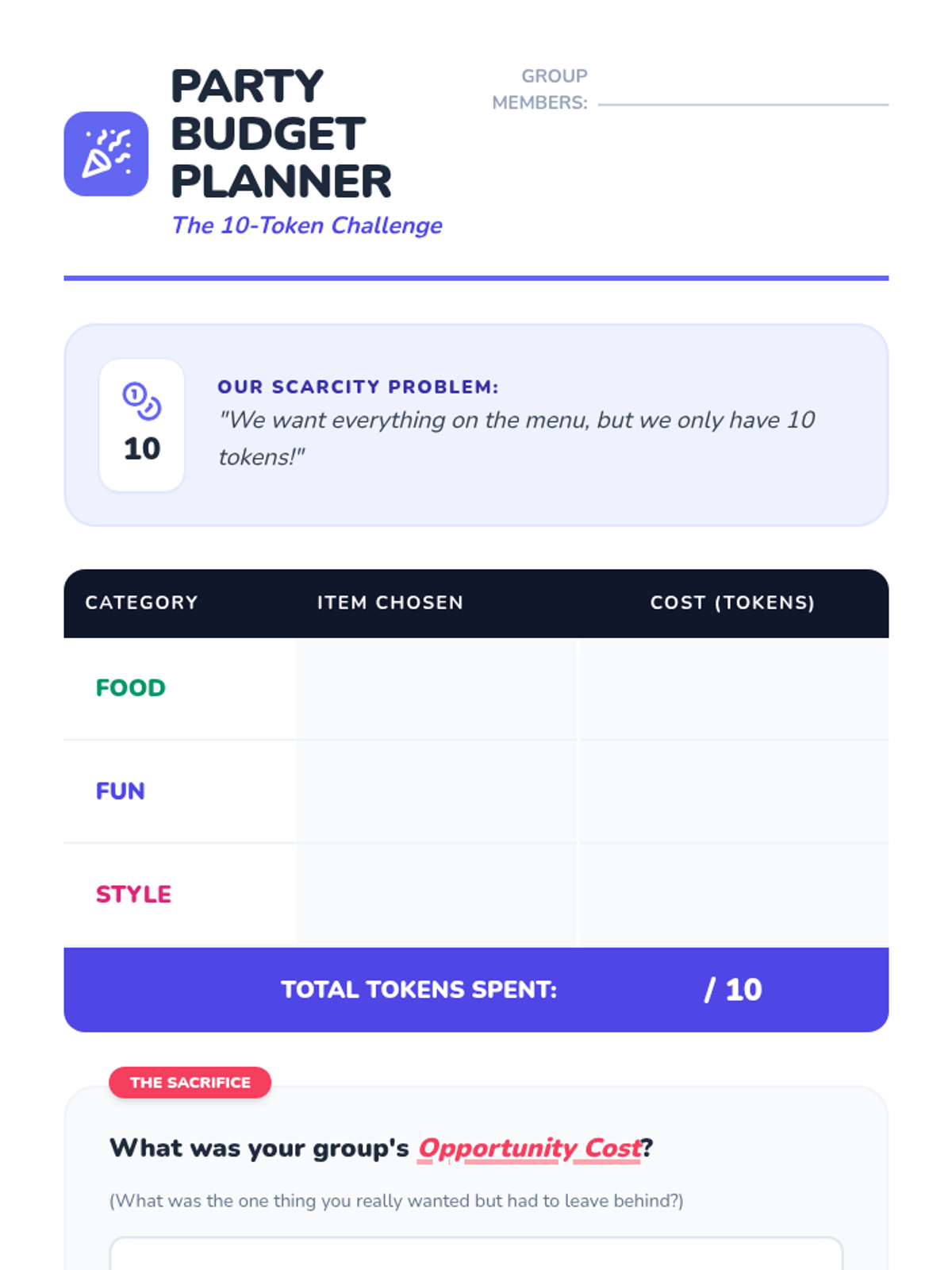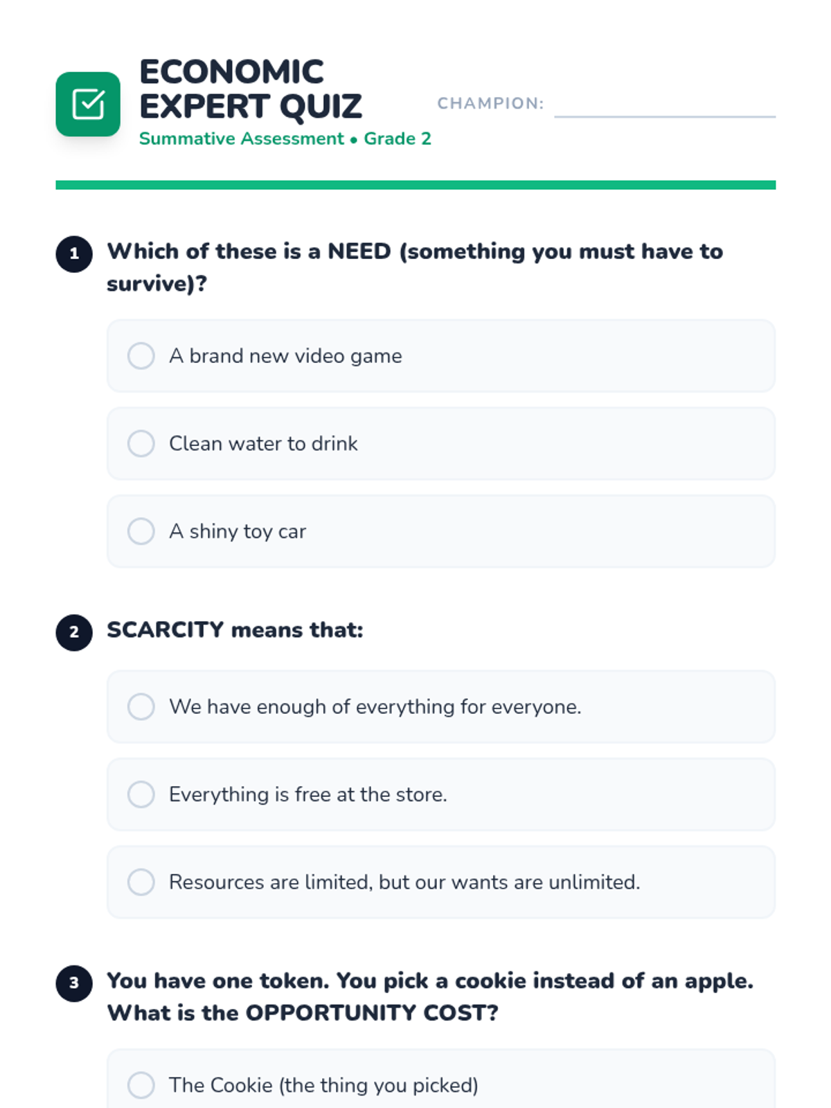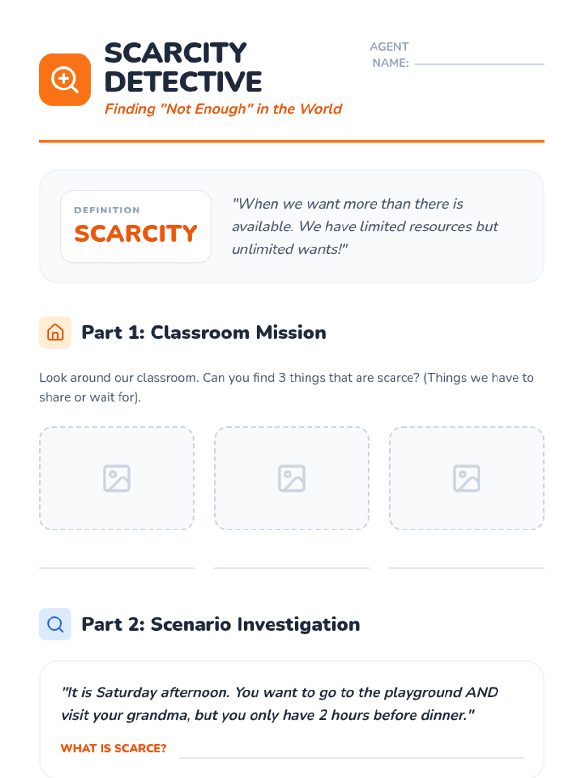 An introductory sequence for 2nd-grade students on economic concepts, focusing on the difference between needs and wants, the reality of scarcity, and the concept of opportunity cost through hands-on simulations and creative projects.