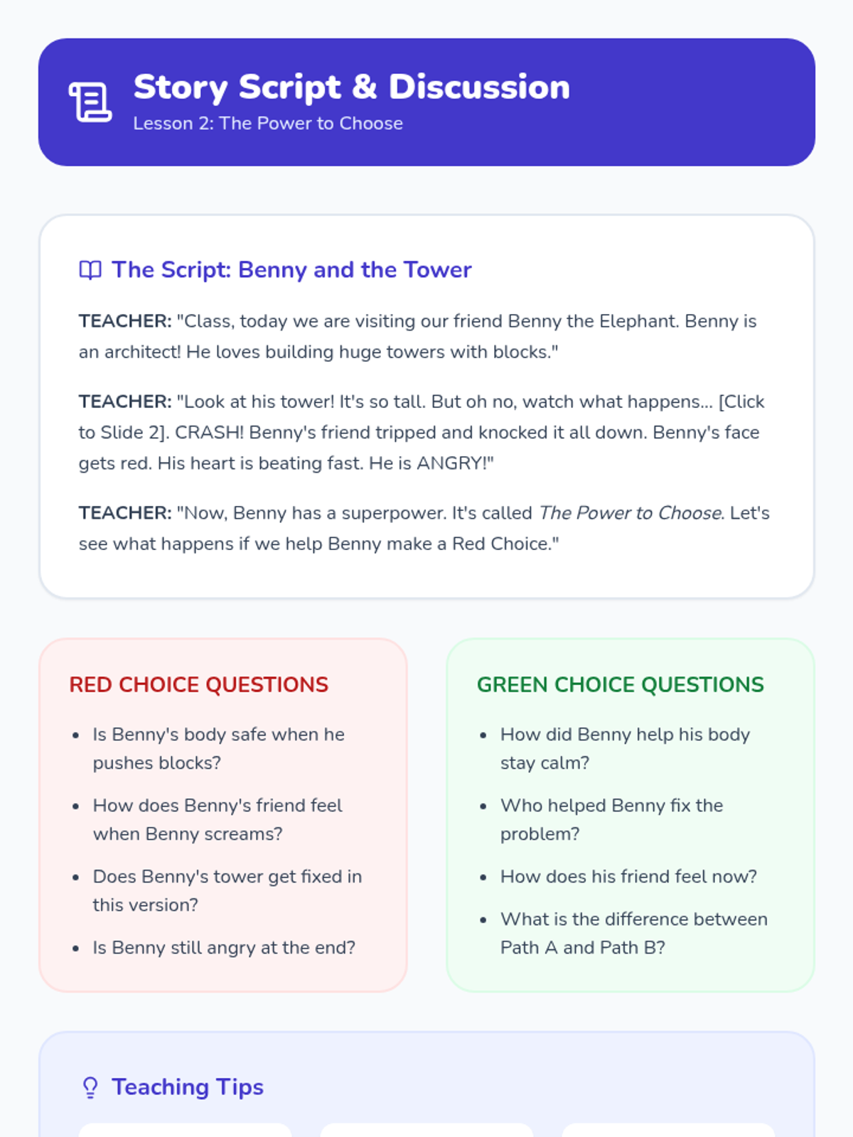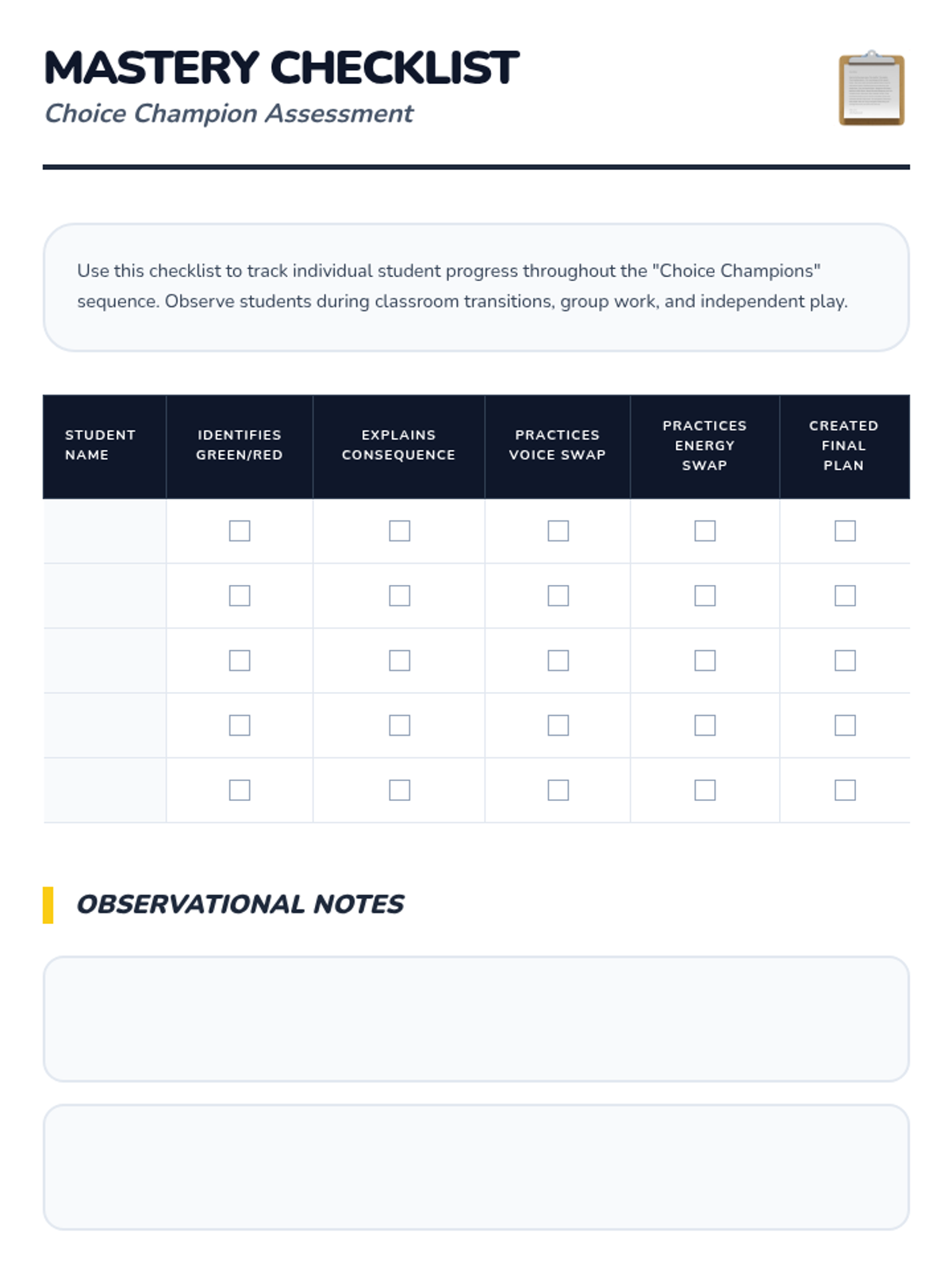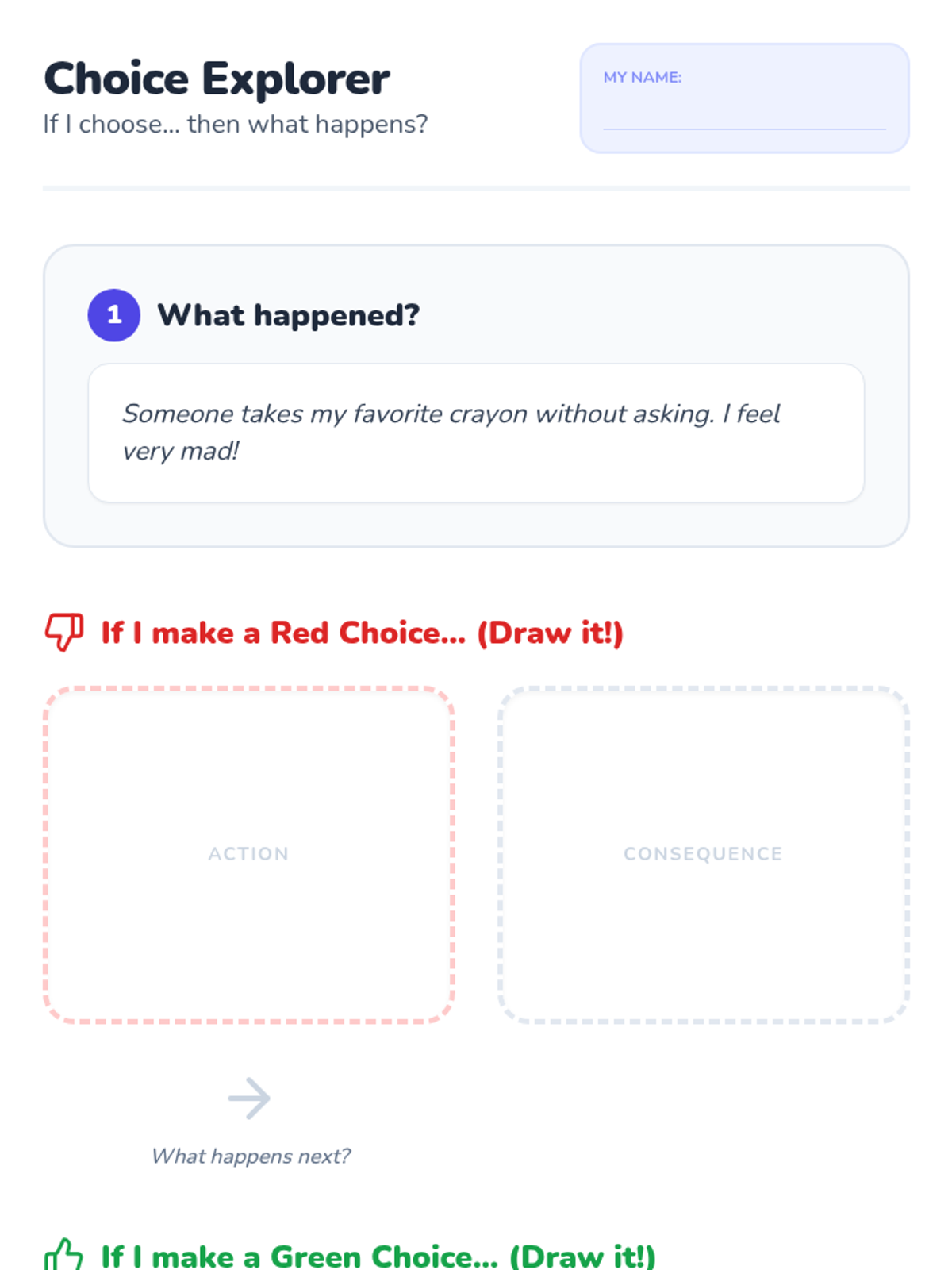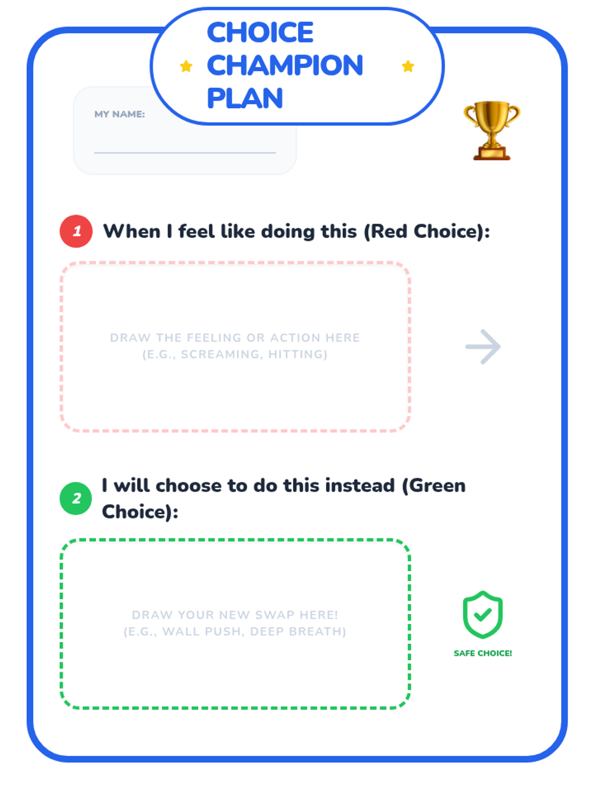 A Kindergarten sequence focused on teaching students how to identify 'Green Choices' and 'Red Choices', understand the consequences of their actions, and learn specific positive alternatives for high-intensity vocal and physical urges.