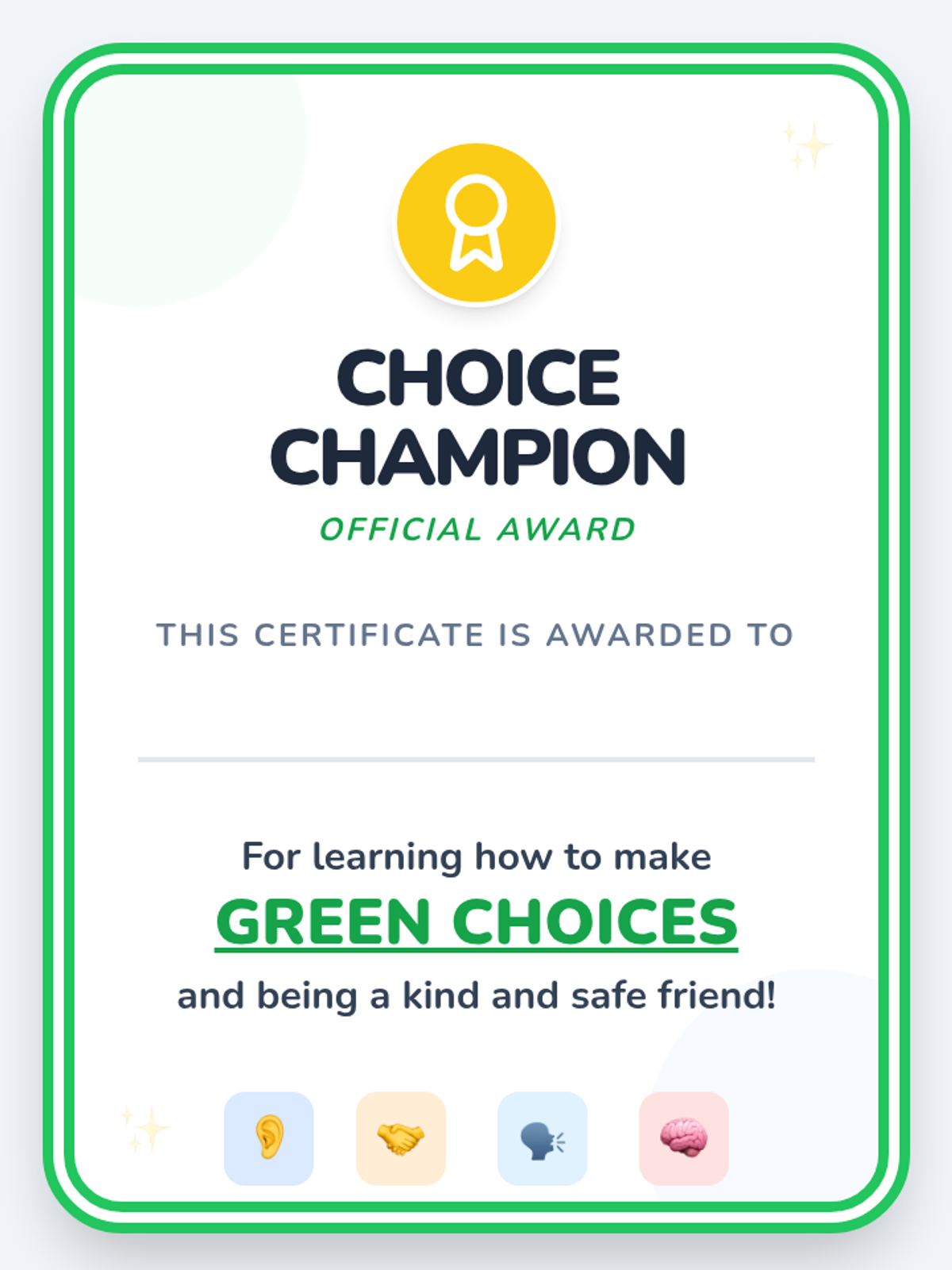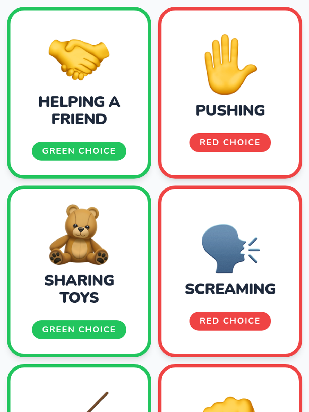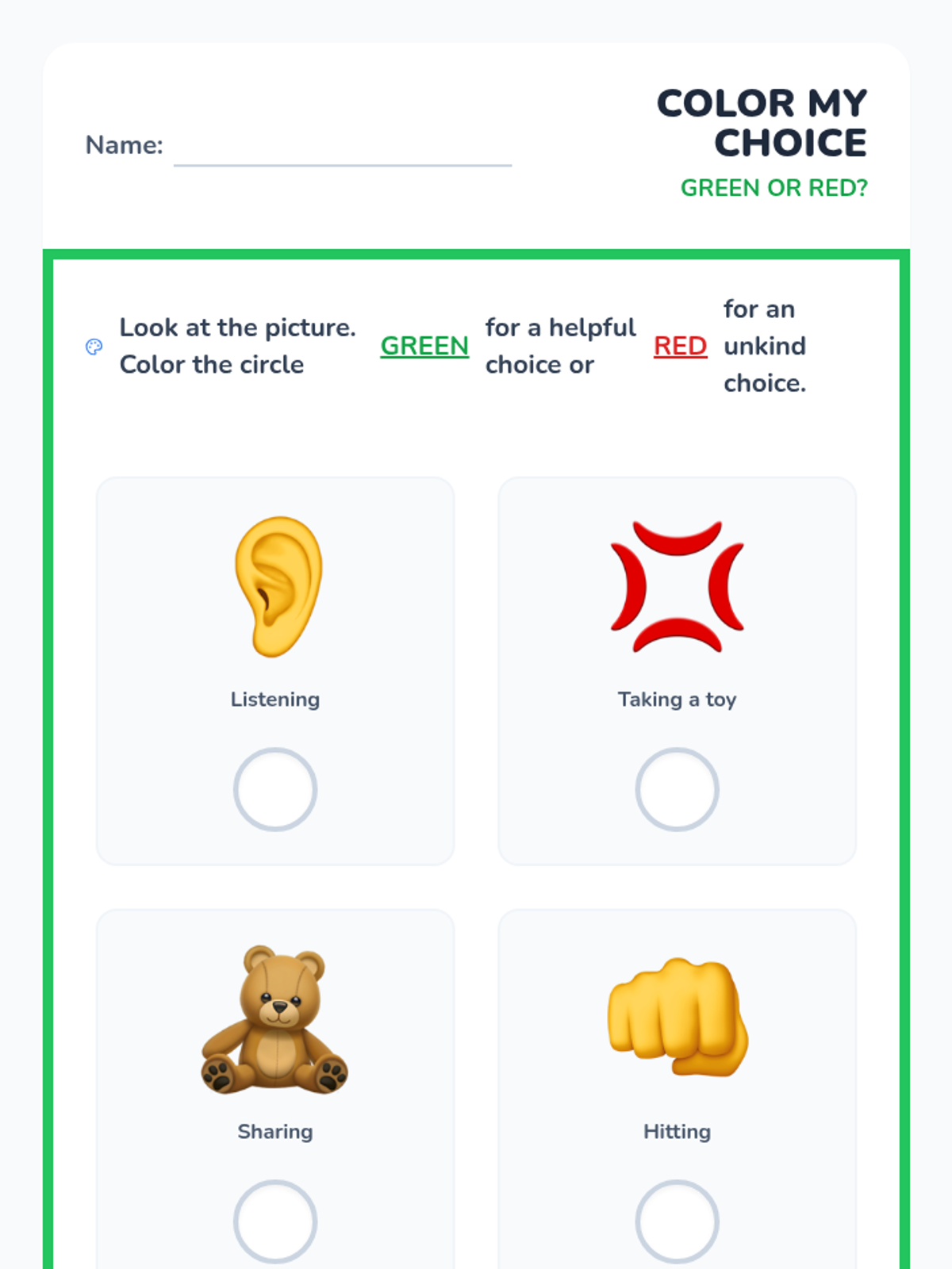 A 5-lesson sequence for Pre-K students focused on social decision evaluation using a Green Choice/Red Choice framework. Students learn to identify social cause-and-effect, categorize behaviors, understand the impact of their words, and practice restorative actions.