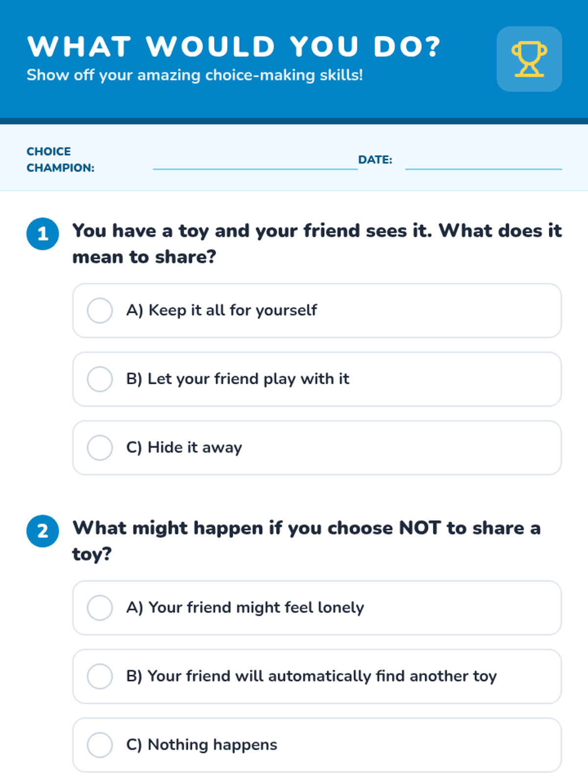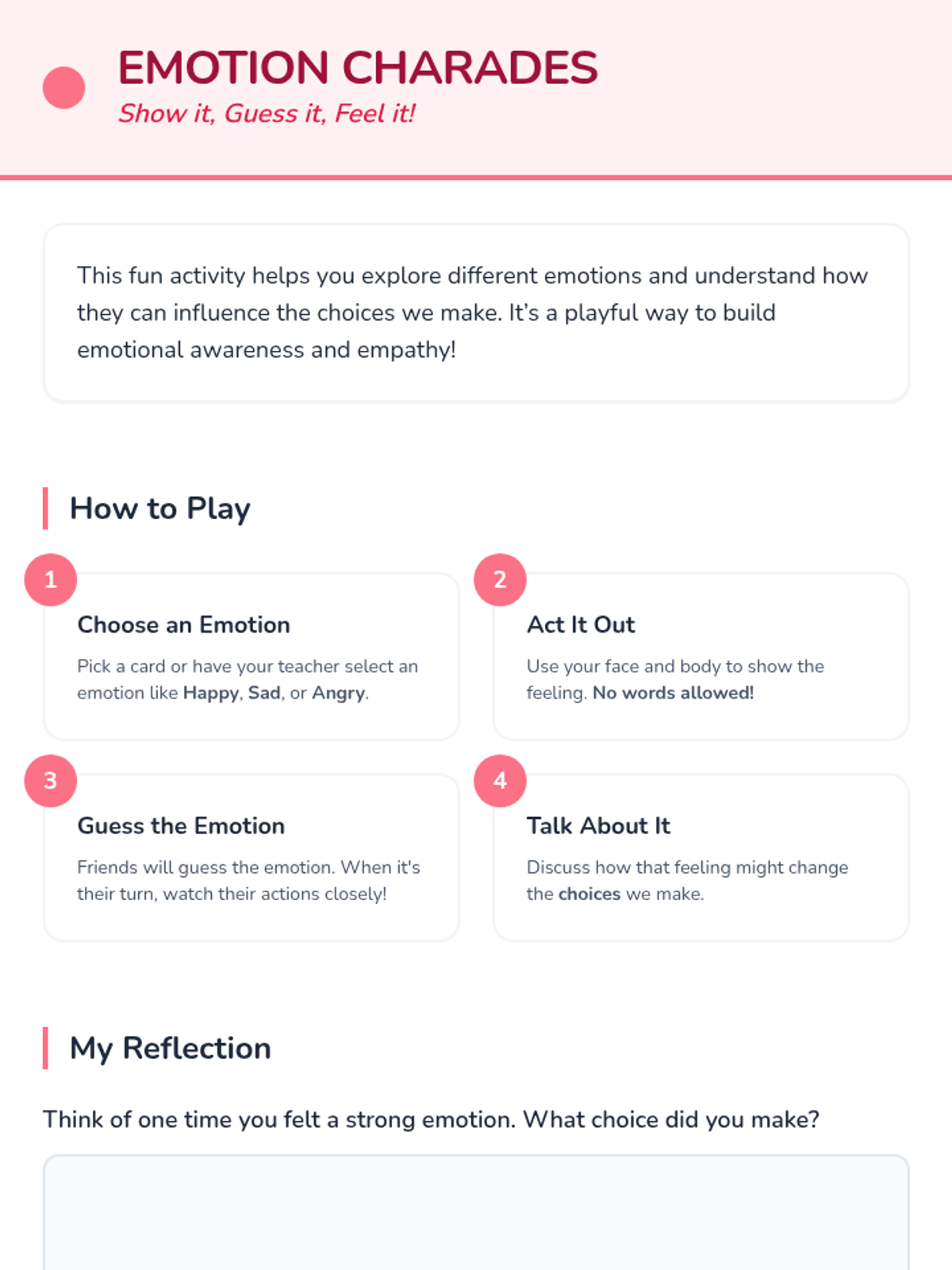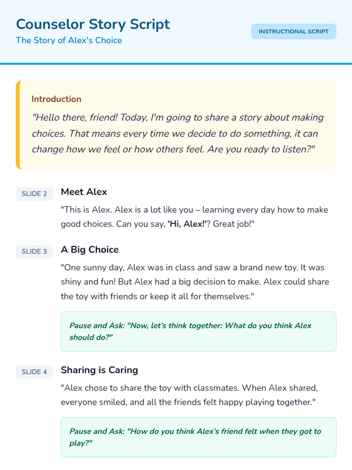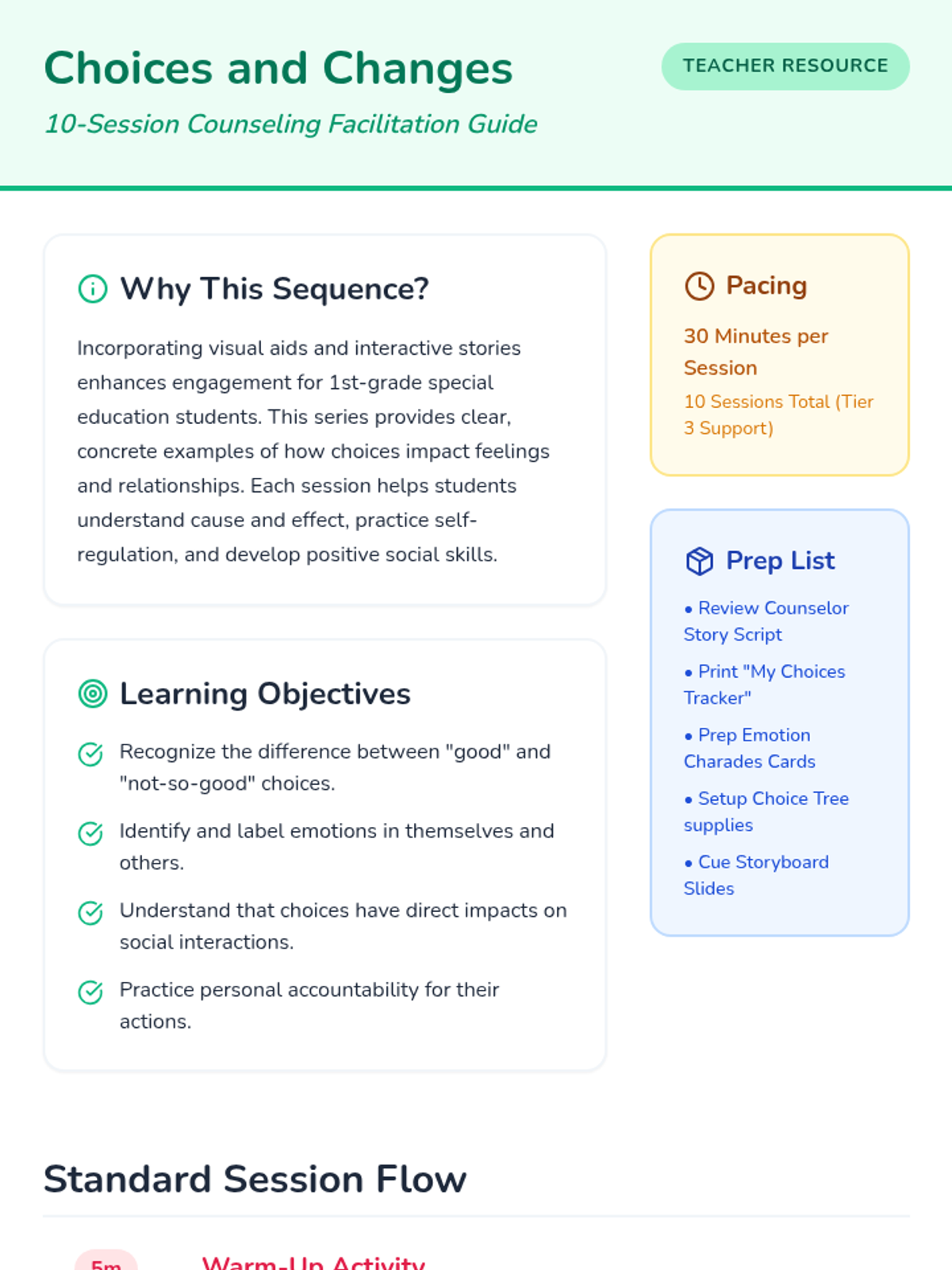 A 10-session counseling series for 1st-grade students focusing on personal accountability, self-regulation, and the impact of choices on social relationships. Each session is designed for individual Tier 3 support with interactive and engaging activities.