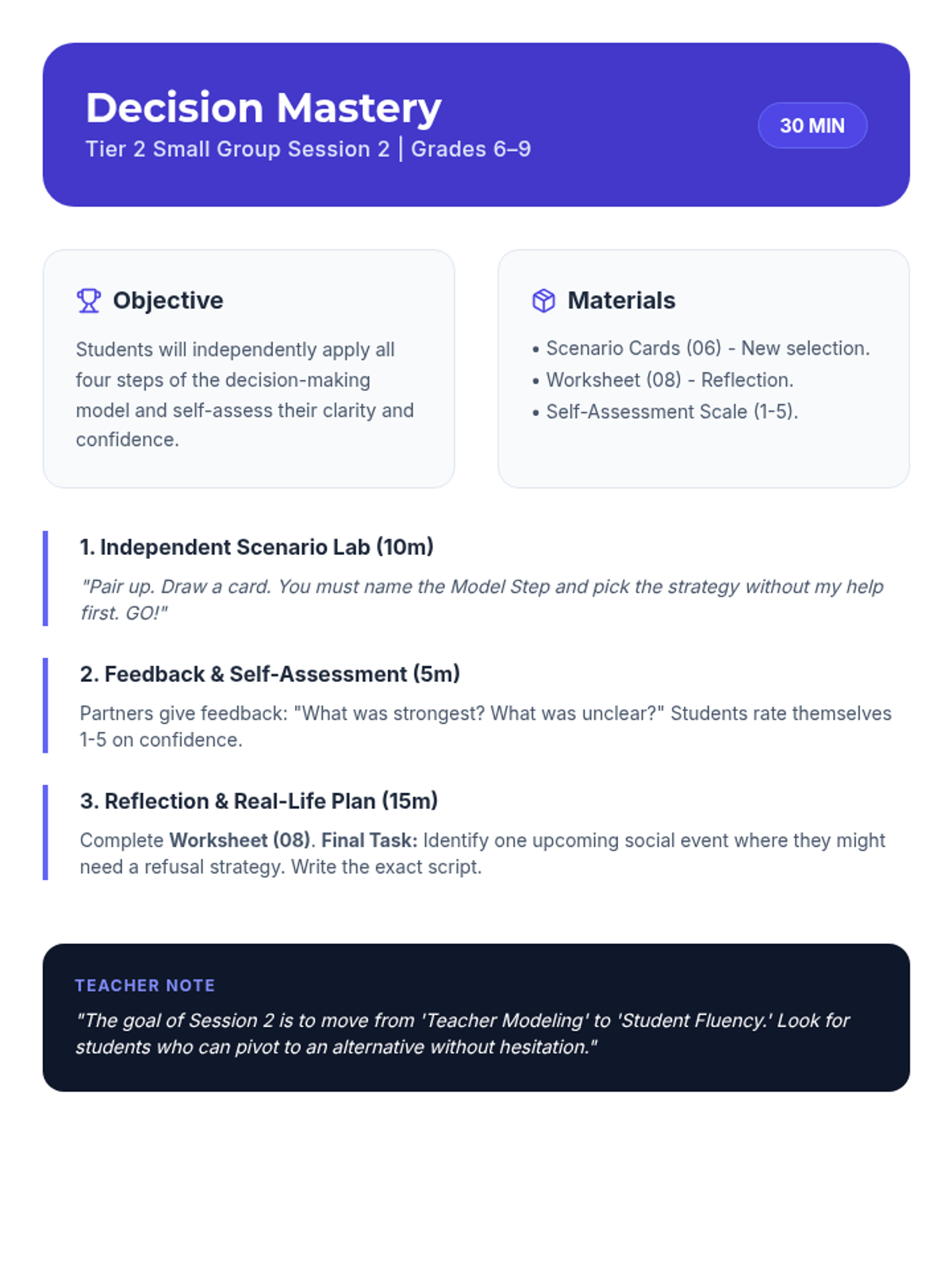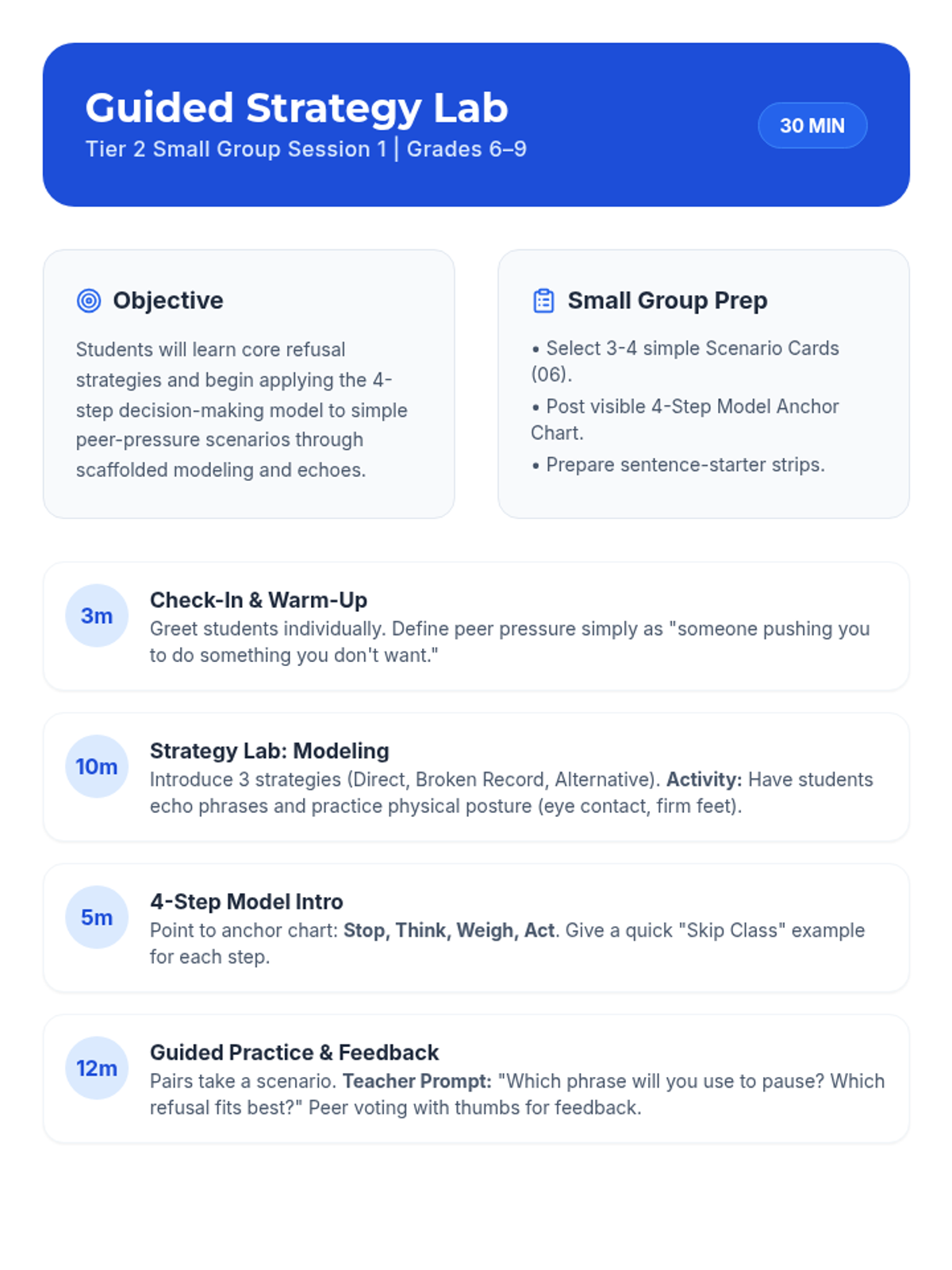 A comprehensive sequence for Grades 6-9 focusing on resisting peer pressure and making healthy decisions using a structured 4-step model. Includes foundational whole-class instruction and targeted Tier 2 small-group sessions for skill reinforcement.