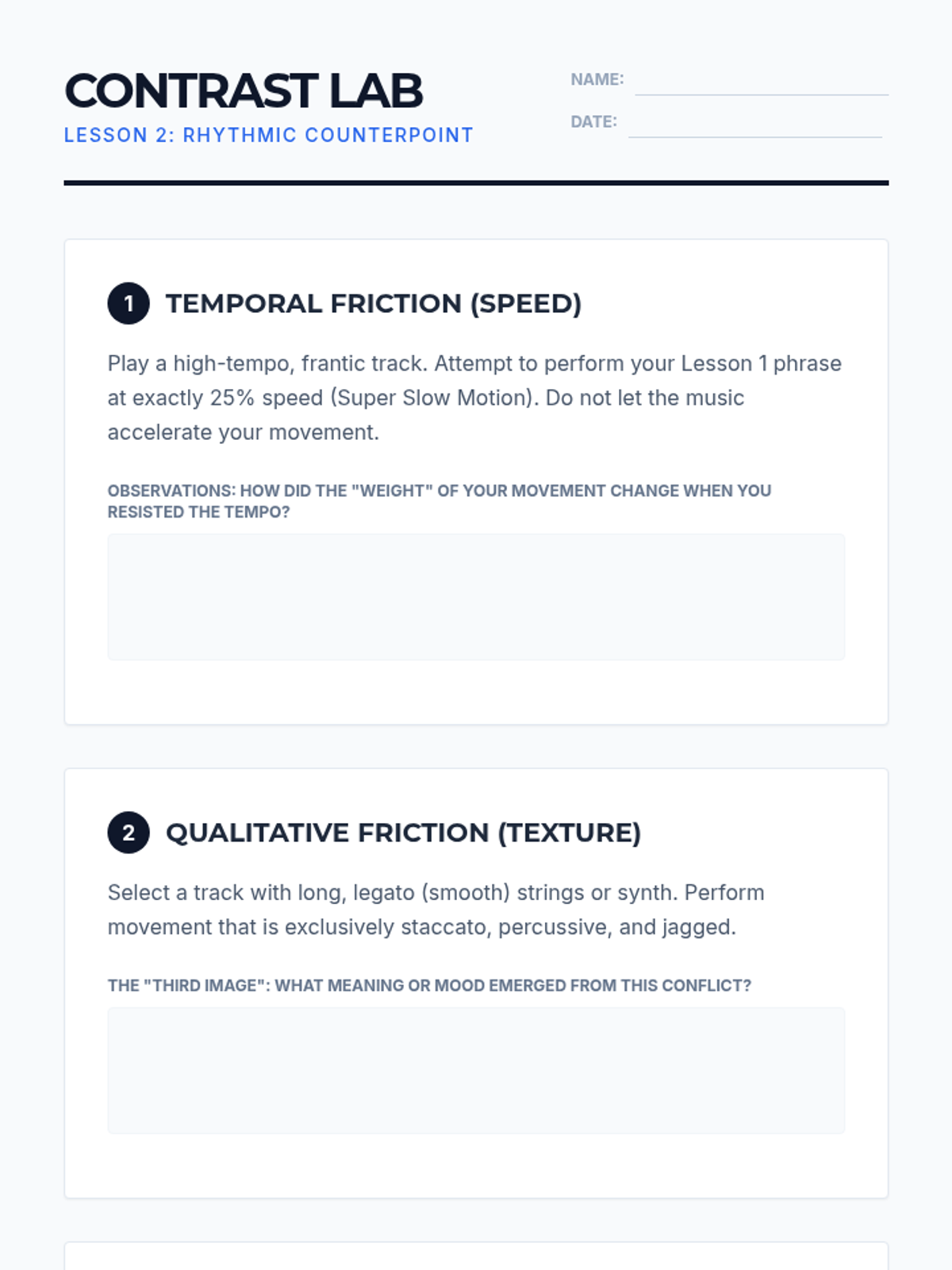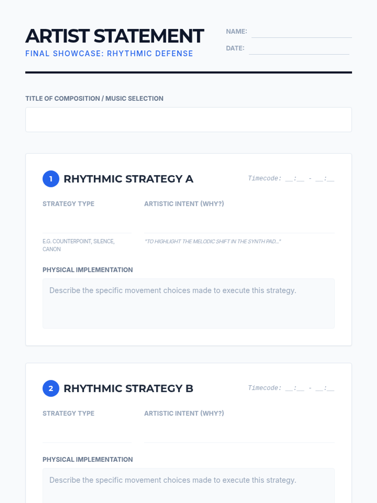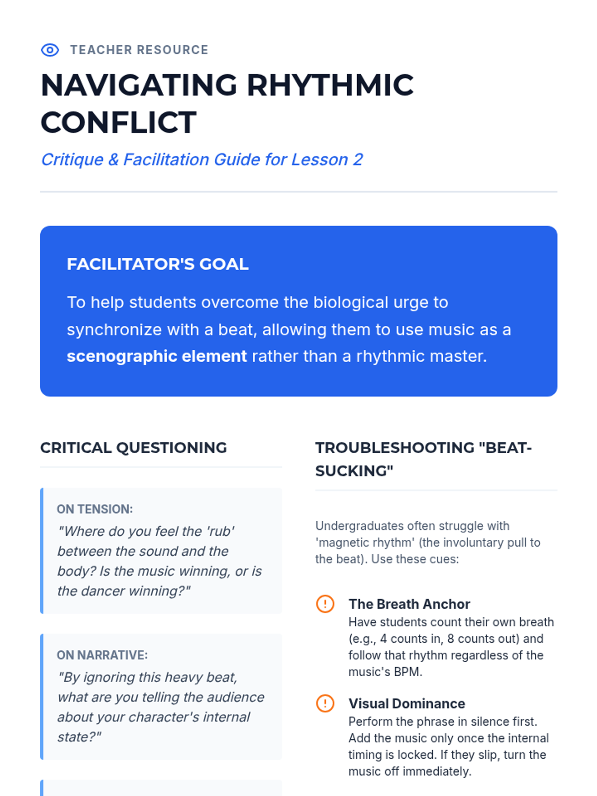 This sequence explores rhythm as a primary tool for choreography, moving from literal synchronization to complex counterpoint, silence, and temporal manipulation. Undergraduate students will develop the ability to justify rhythmic choices through composition and performance.