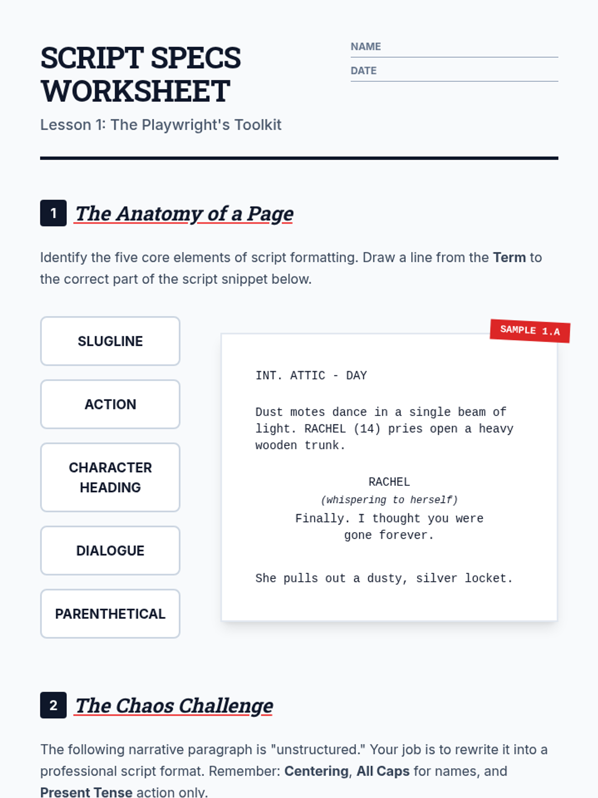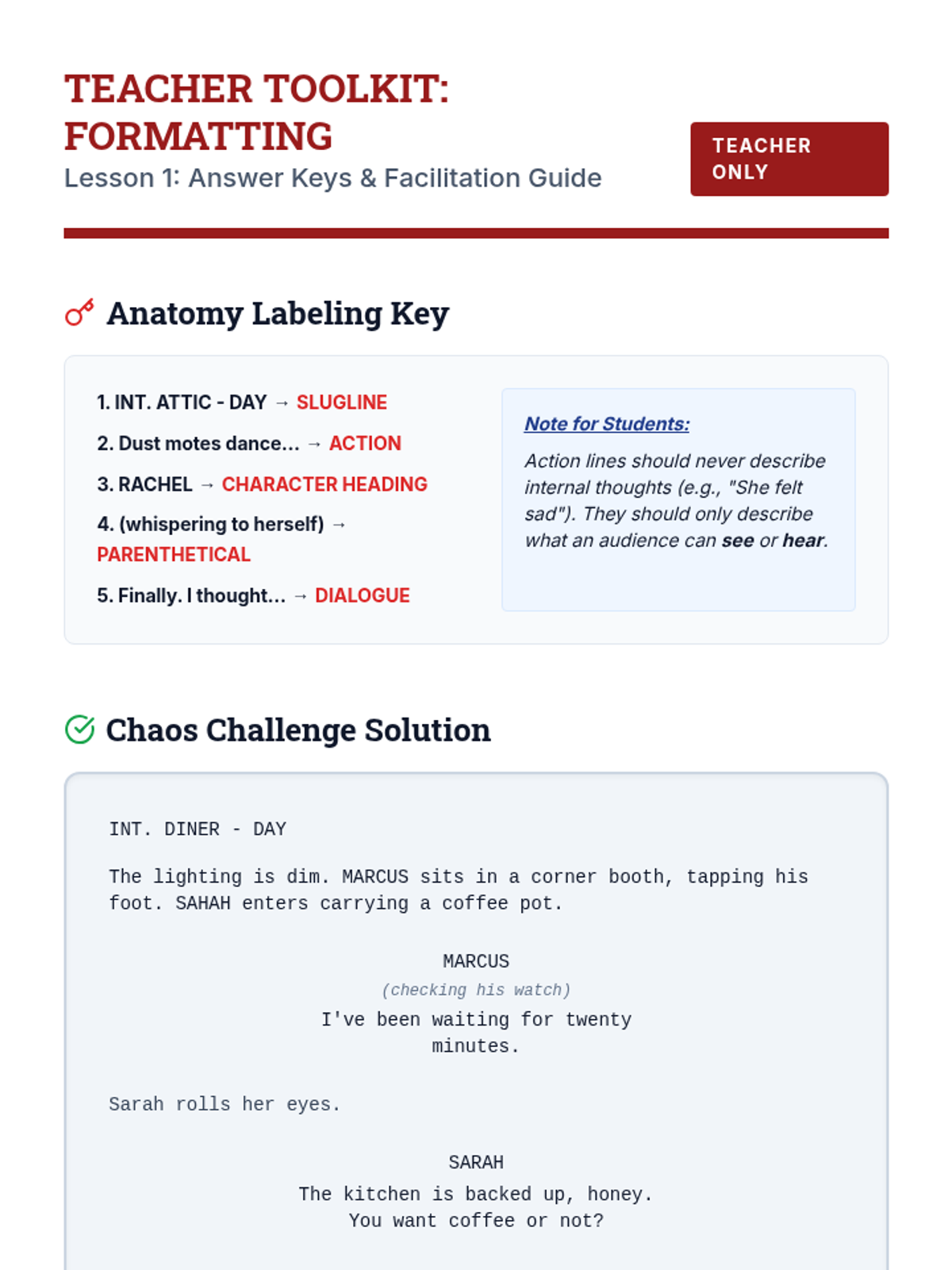 A comprehensive 5-lesson unit for 8th-grade students on the mechanics of playwriting. Students transition from narrative writing to dramatic writing, focusing on industry-standard formatting, distinct character voices, subtext, and the integration of physical action with dialogue.
