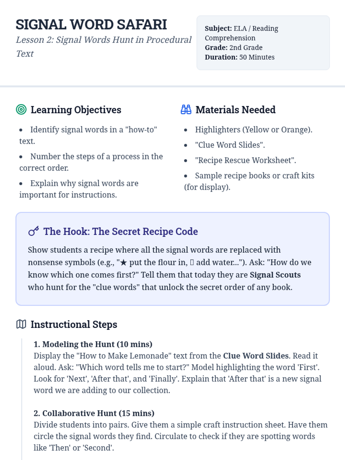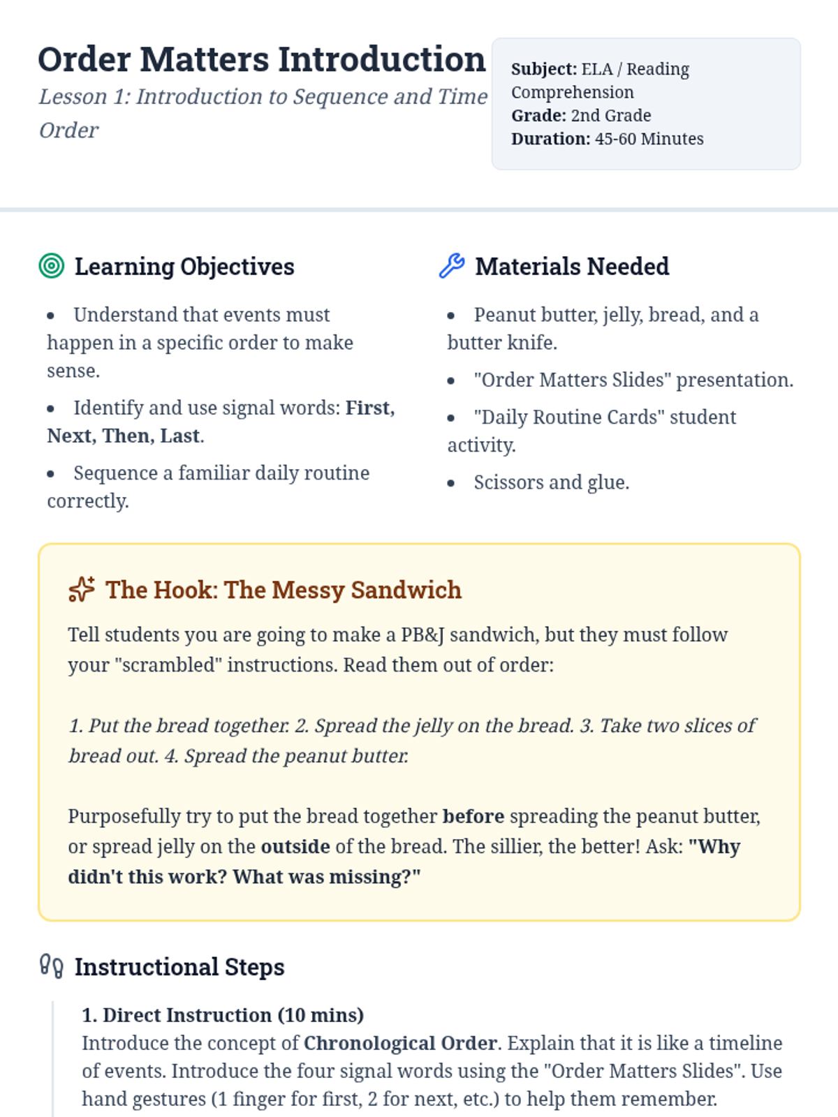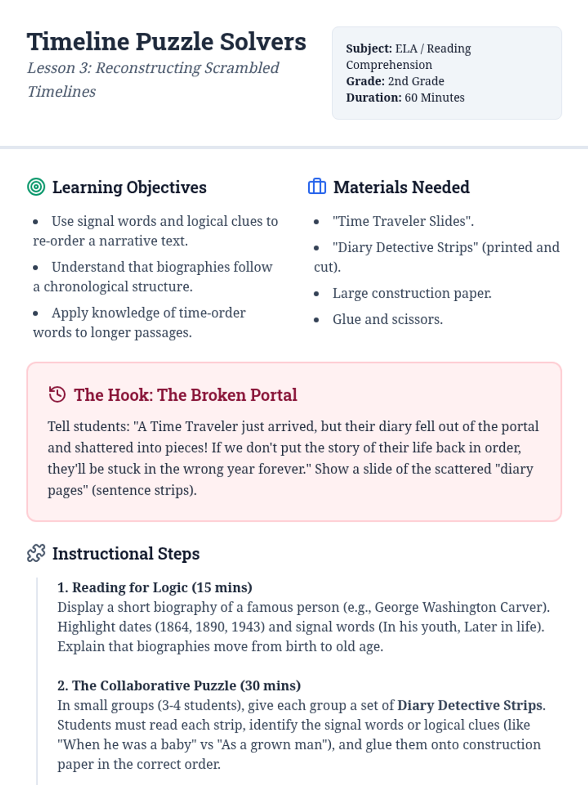 A 2nd-grade reading comprehension sequence focused on chronological order. Students learn to identify signal words, reconstruct scrambled texts, and write their own procedural guides through a 'Time Detective' lens.