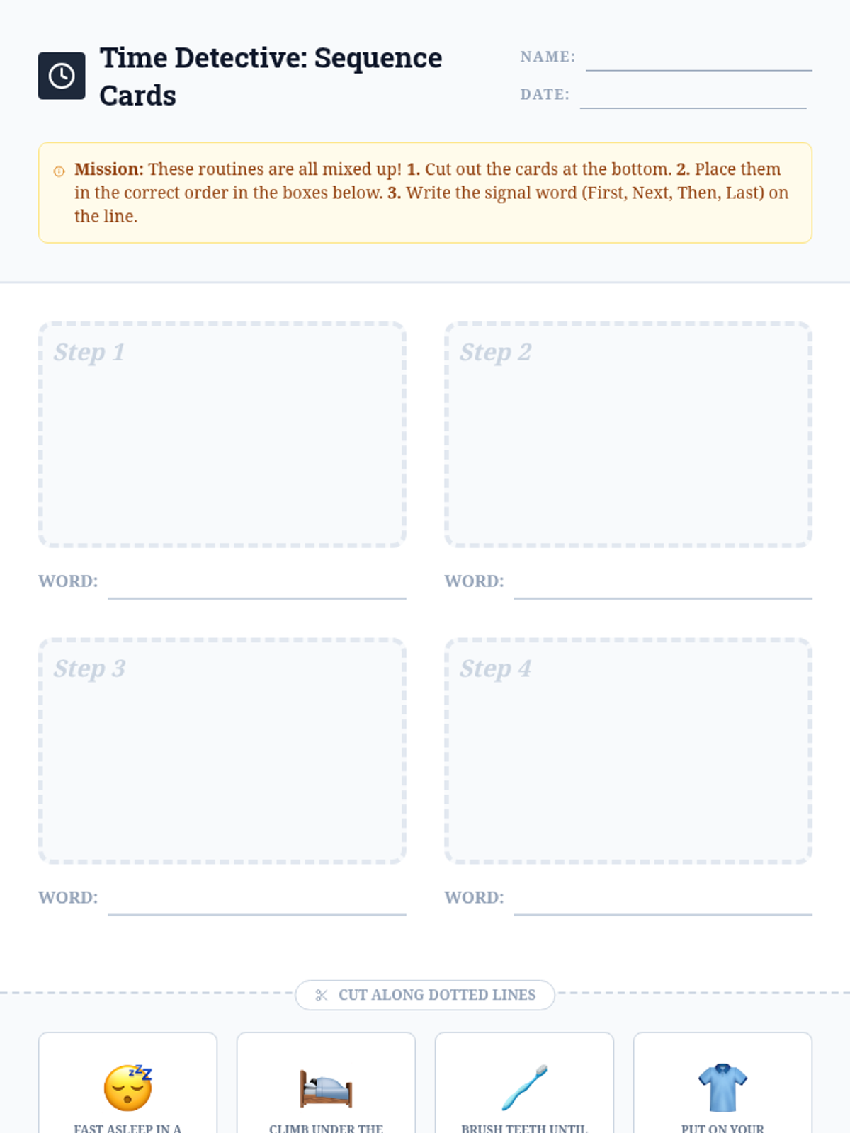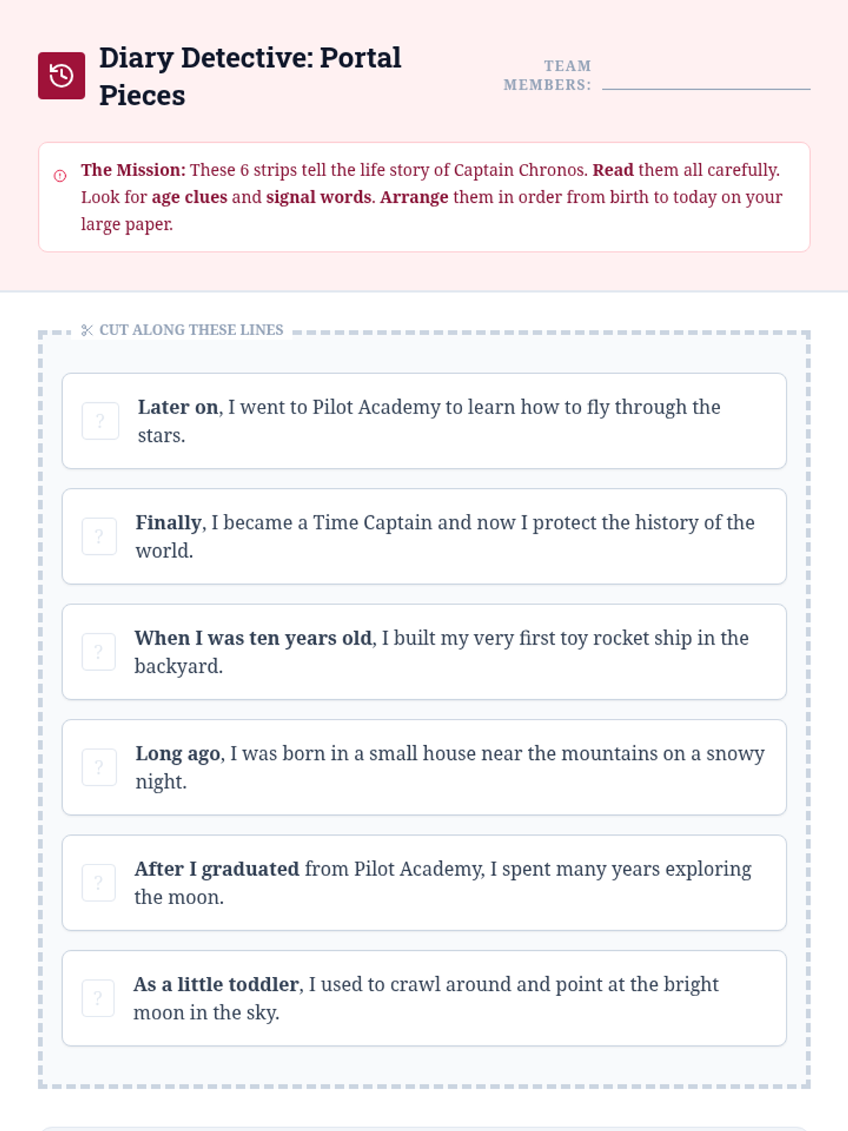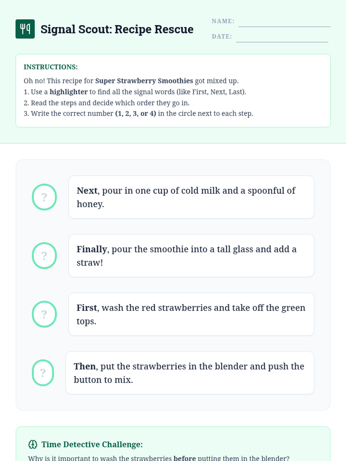 A 2nd-grade reading comprehension sequence focused on chronological order. Students learn to identify signal words, reconstruct scrambled texts, and write their own procedural guides through a 'Time Detective' lens.