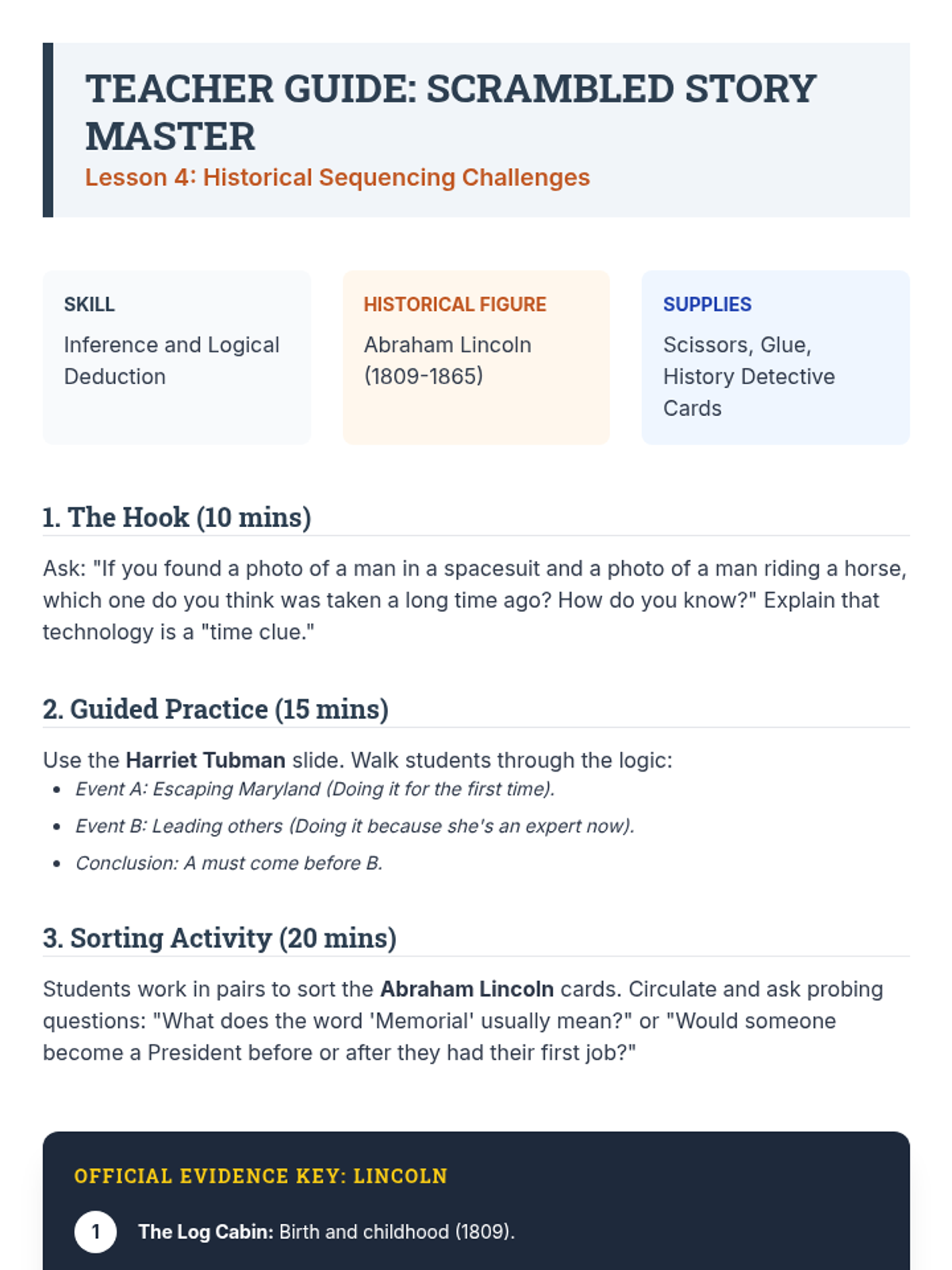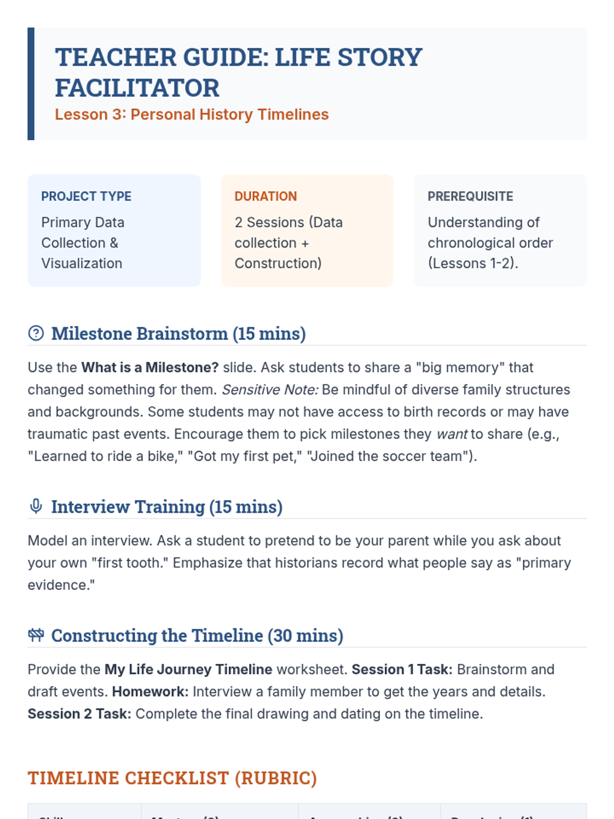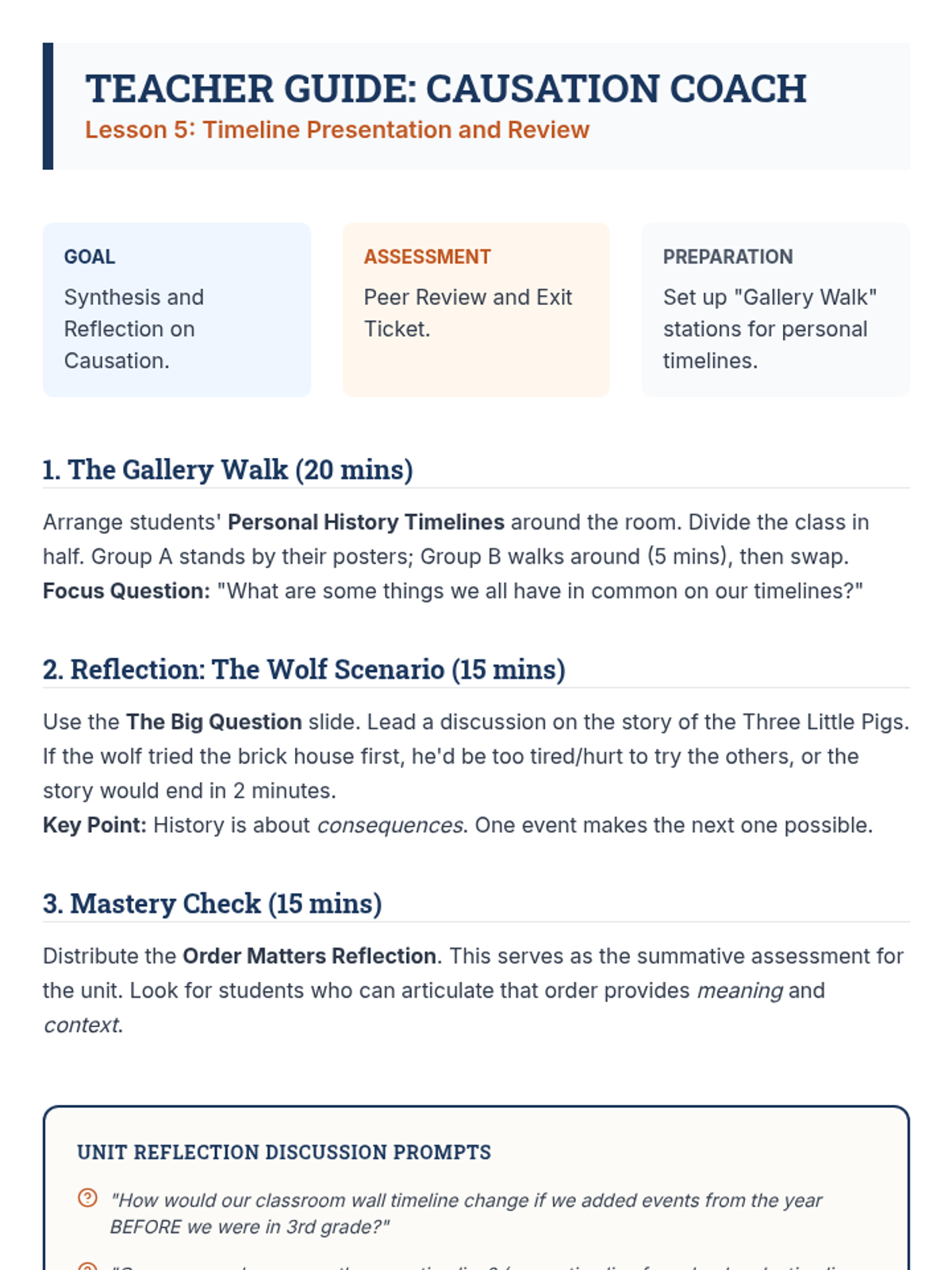 A 5-lesson sequence for 3rd graders to master chronological thinking. Students progress from ordering daily routines to constructing personal histories and using logic to sequence historical events, emphasizing that history is a linear story of cause and effect.