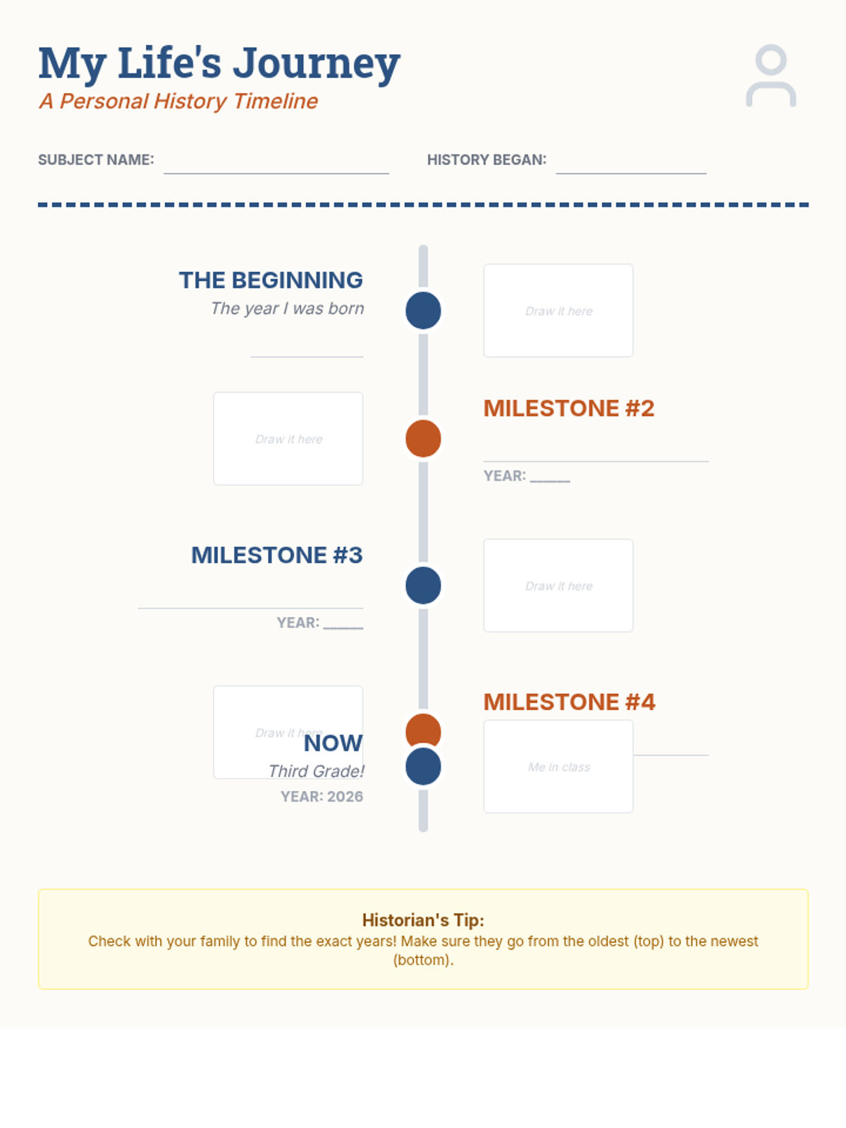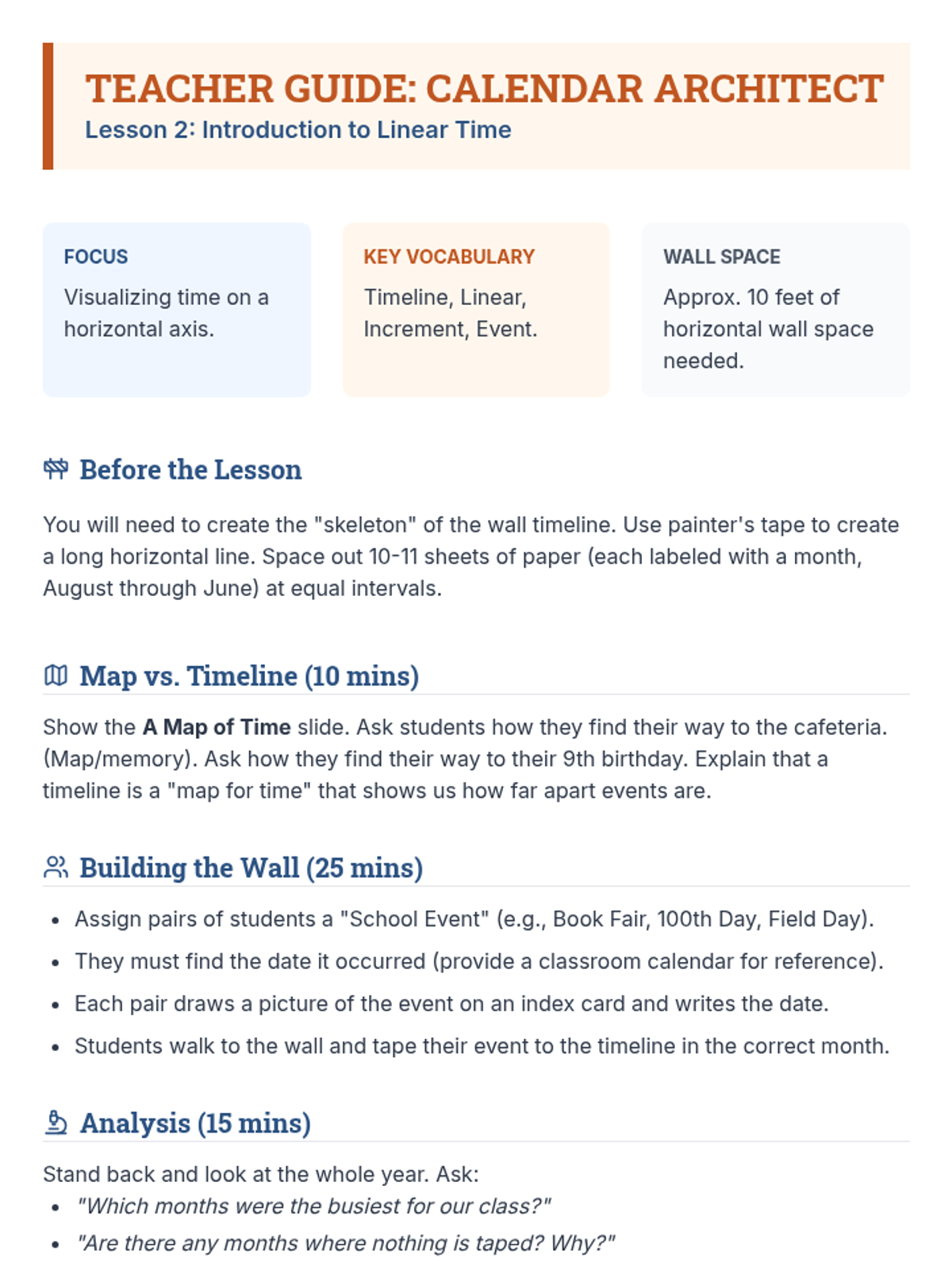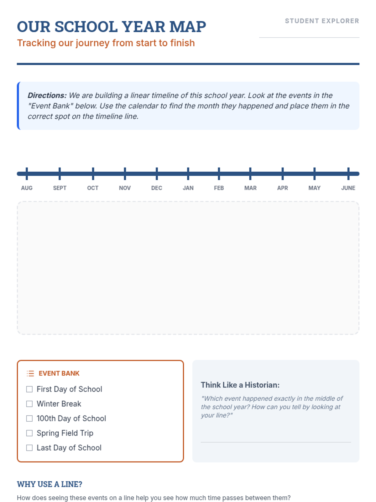 A 5-lesson sequence for 3rd graders to master chronological thinking. Students progress from ordering daily routines to constructing personal histories and using logic to sequence historical events, emphasizing that history is a linear story of cause and effect.