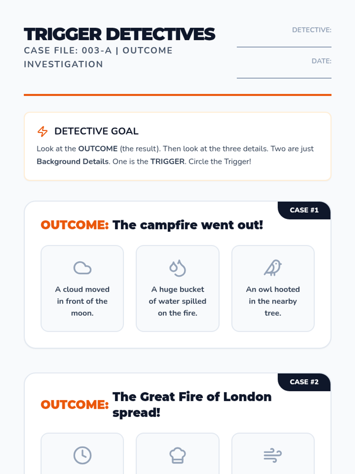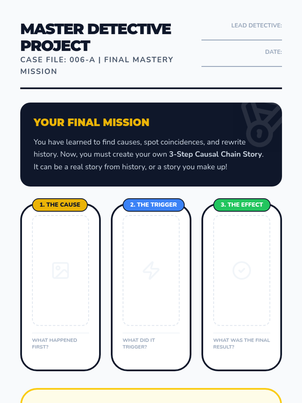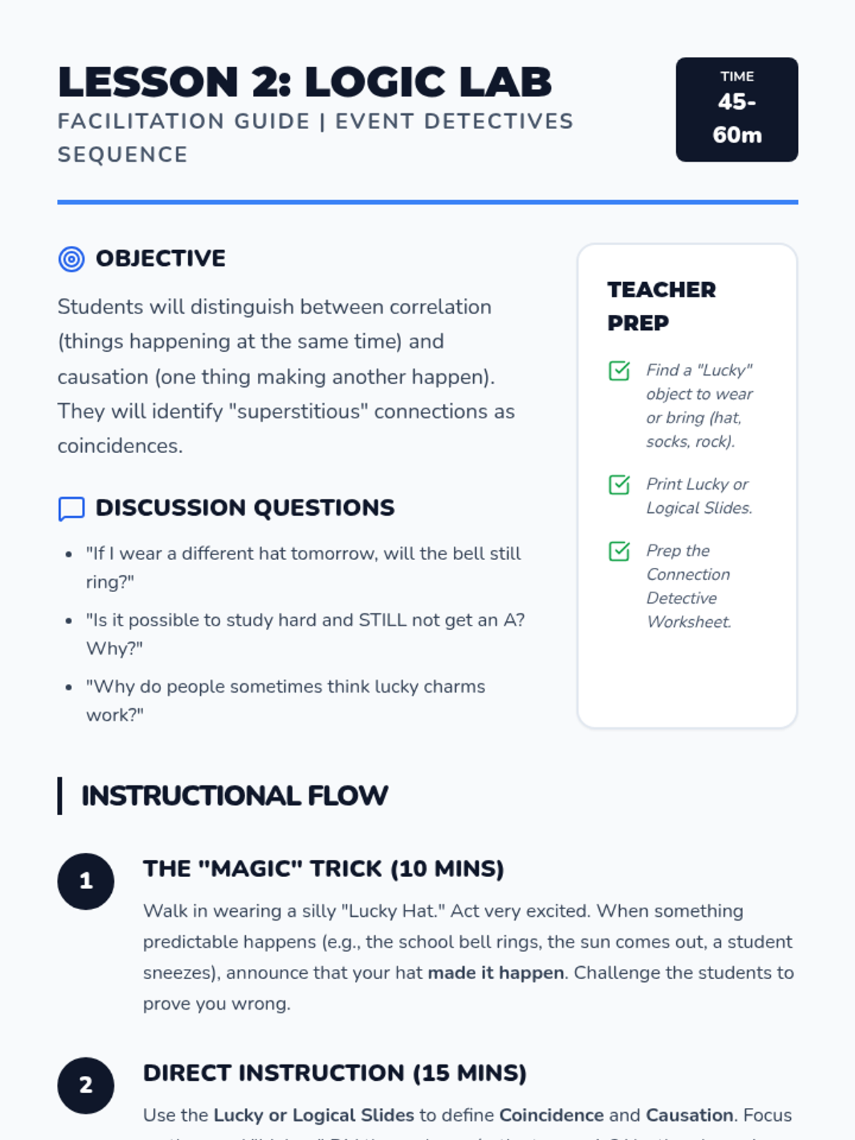 A game-based sequence for 2nd graders to distinguish between correlation and causation in history and daily life using a detective-themed approach. Students move from physical chain reactions to analyzing historical events and predicting hypothetical outcomes.