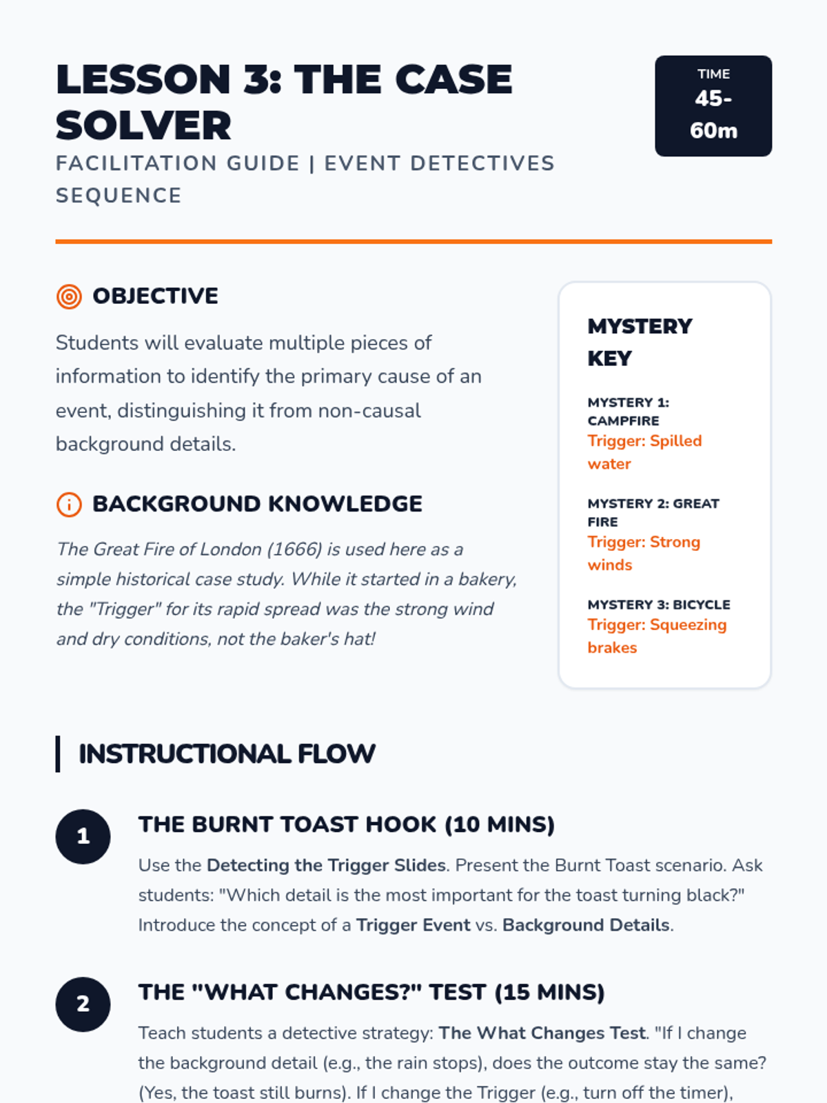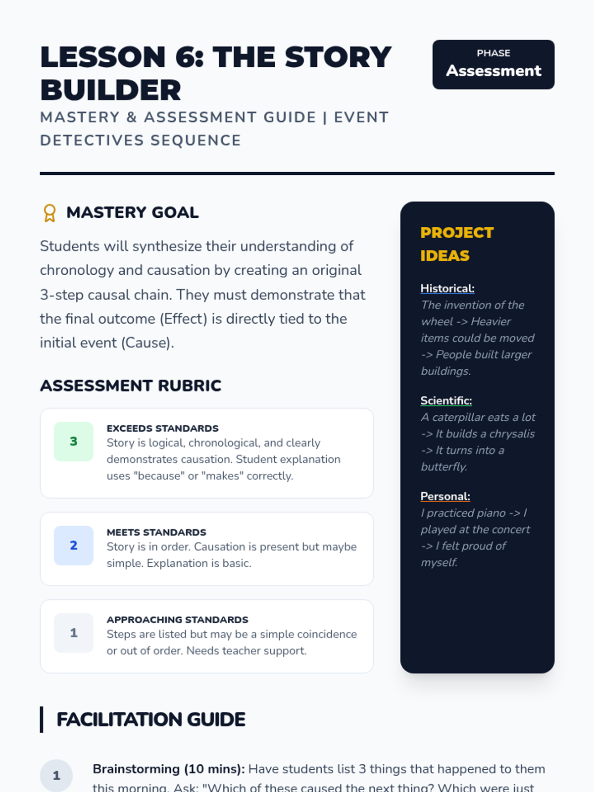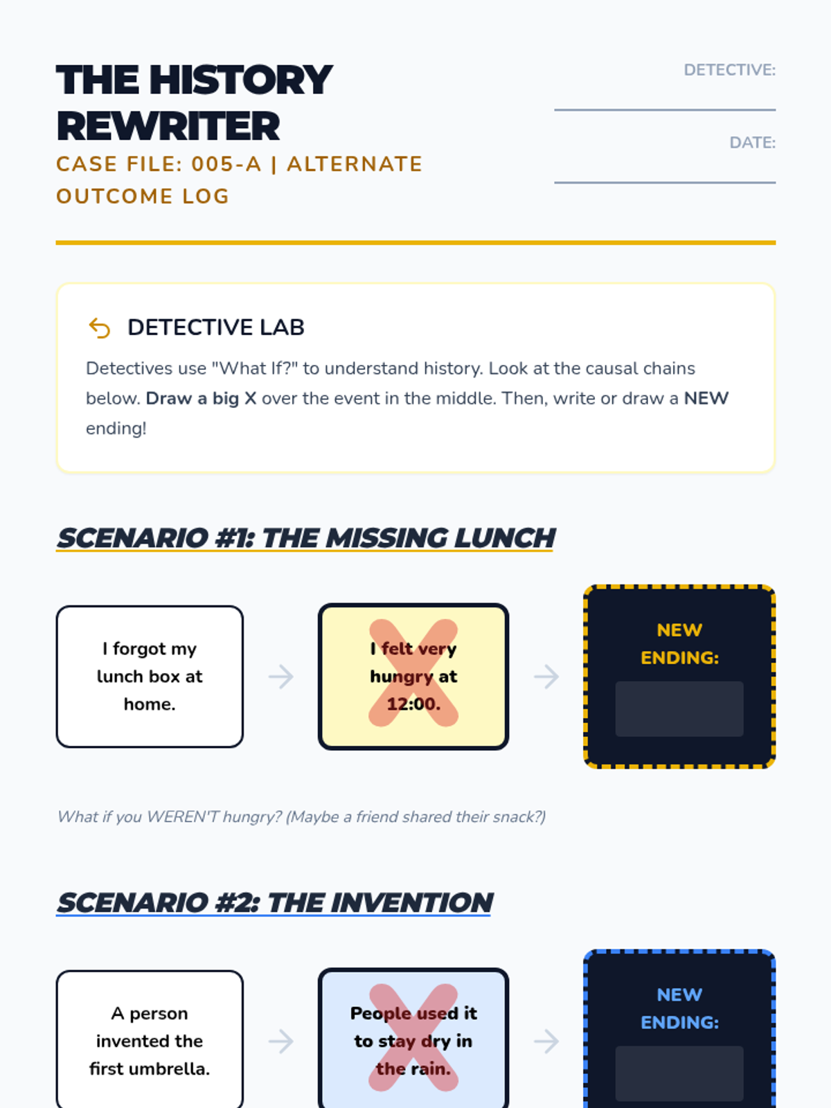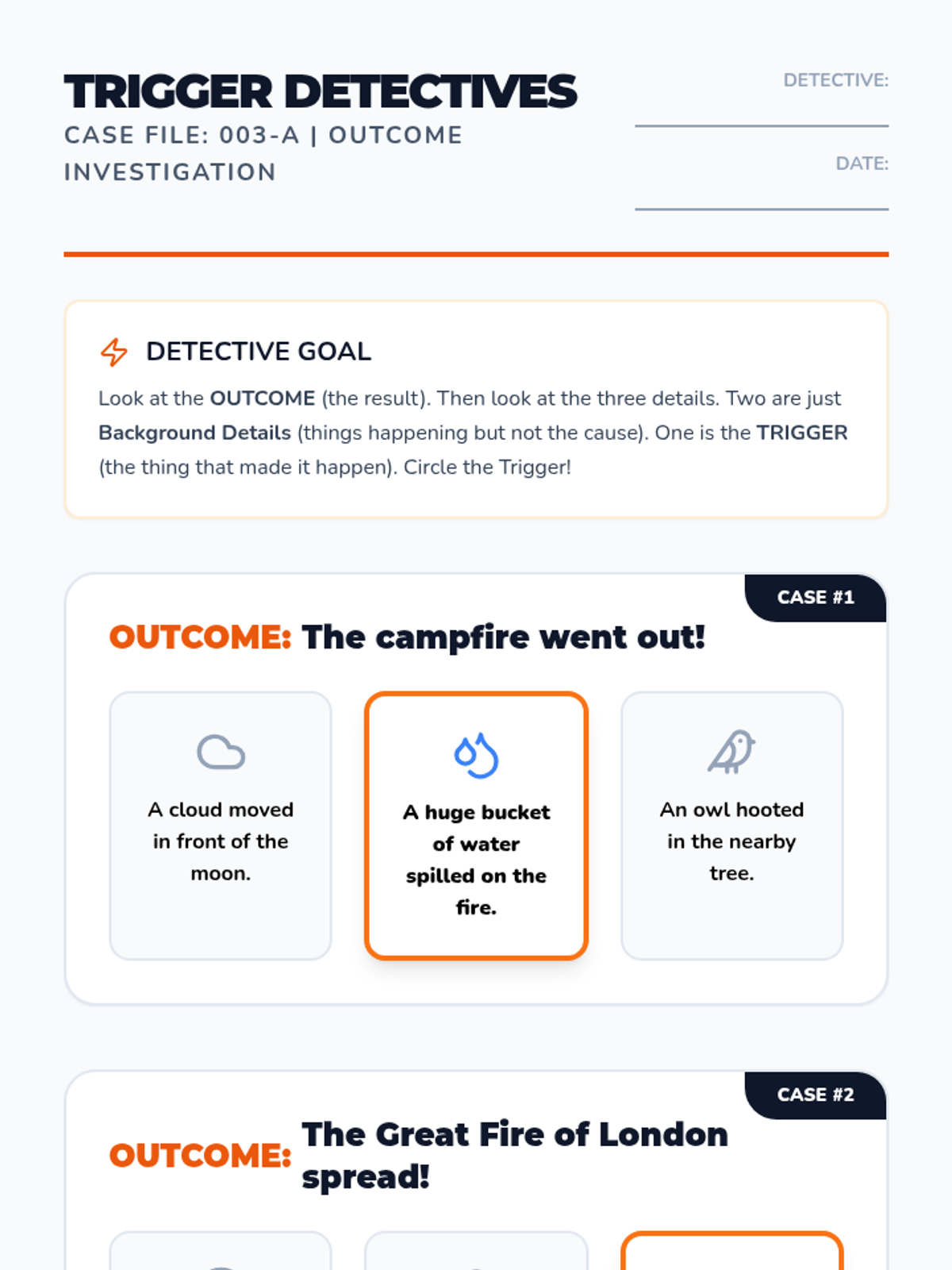 A game-based sequence for 2nd graders to distinguish between correlation and causation in history and daily life using a detective-themed approach. Students move from physical chain reactions to analyzing historical events and predicting hypothetical outcomes.
