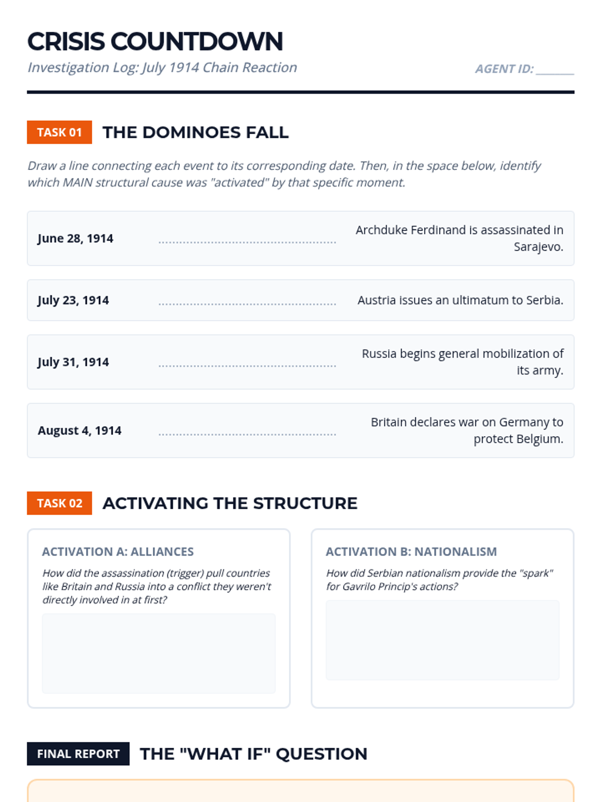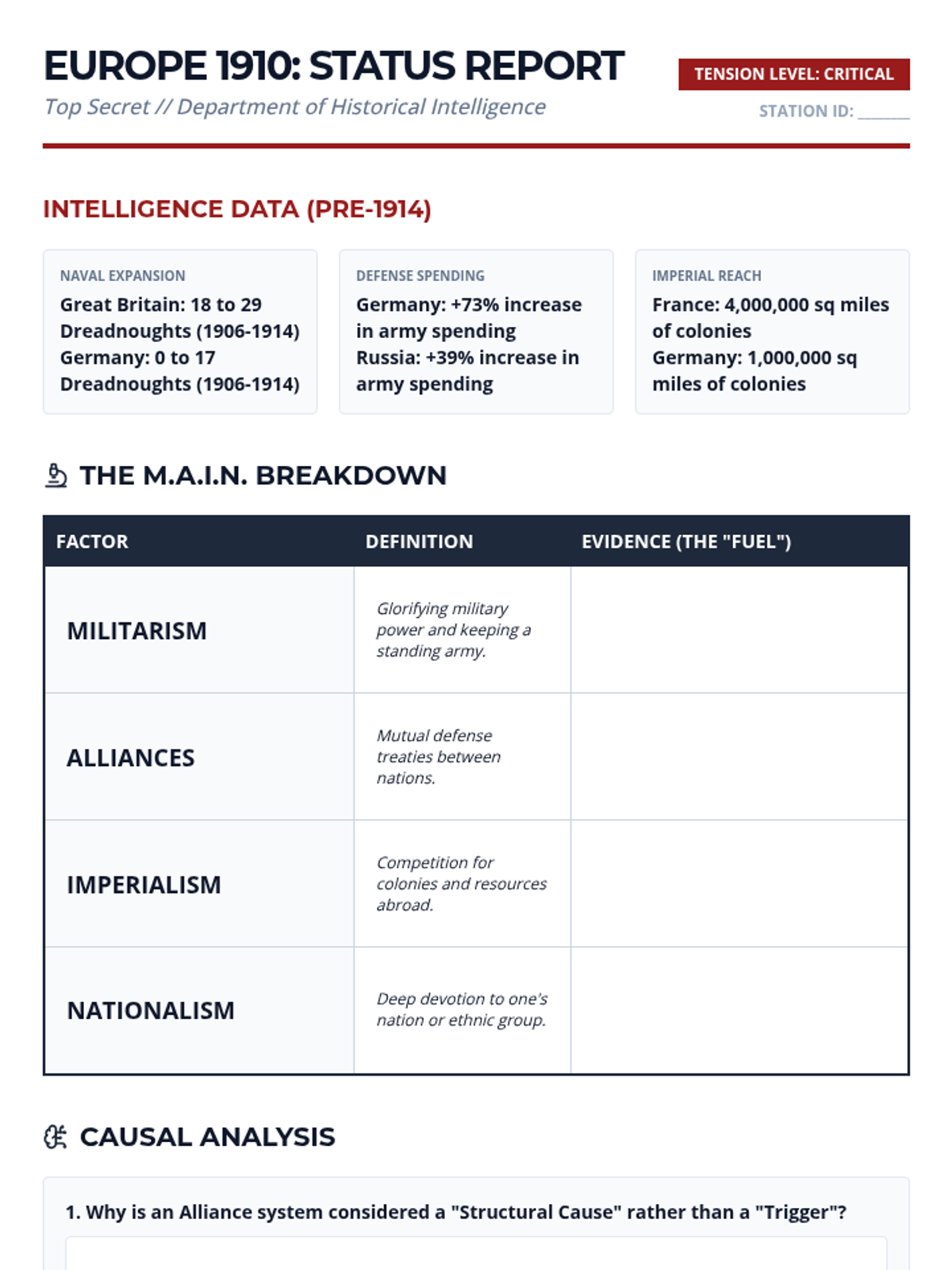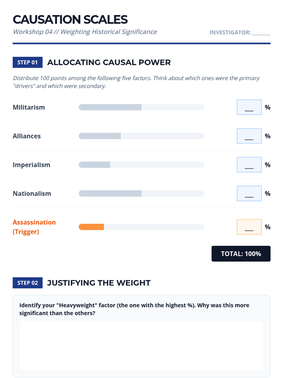 A 9th-grade Social Studies unit that teaches students to distinguish between long-term structural causes and immediate triggers in history, using World War I as the primary case study. Students learn to categorize, analyze, and weight various historical factors to construct complex causal diagrams.