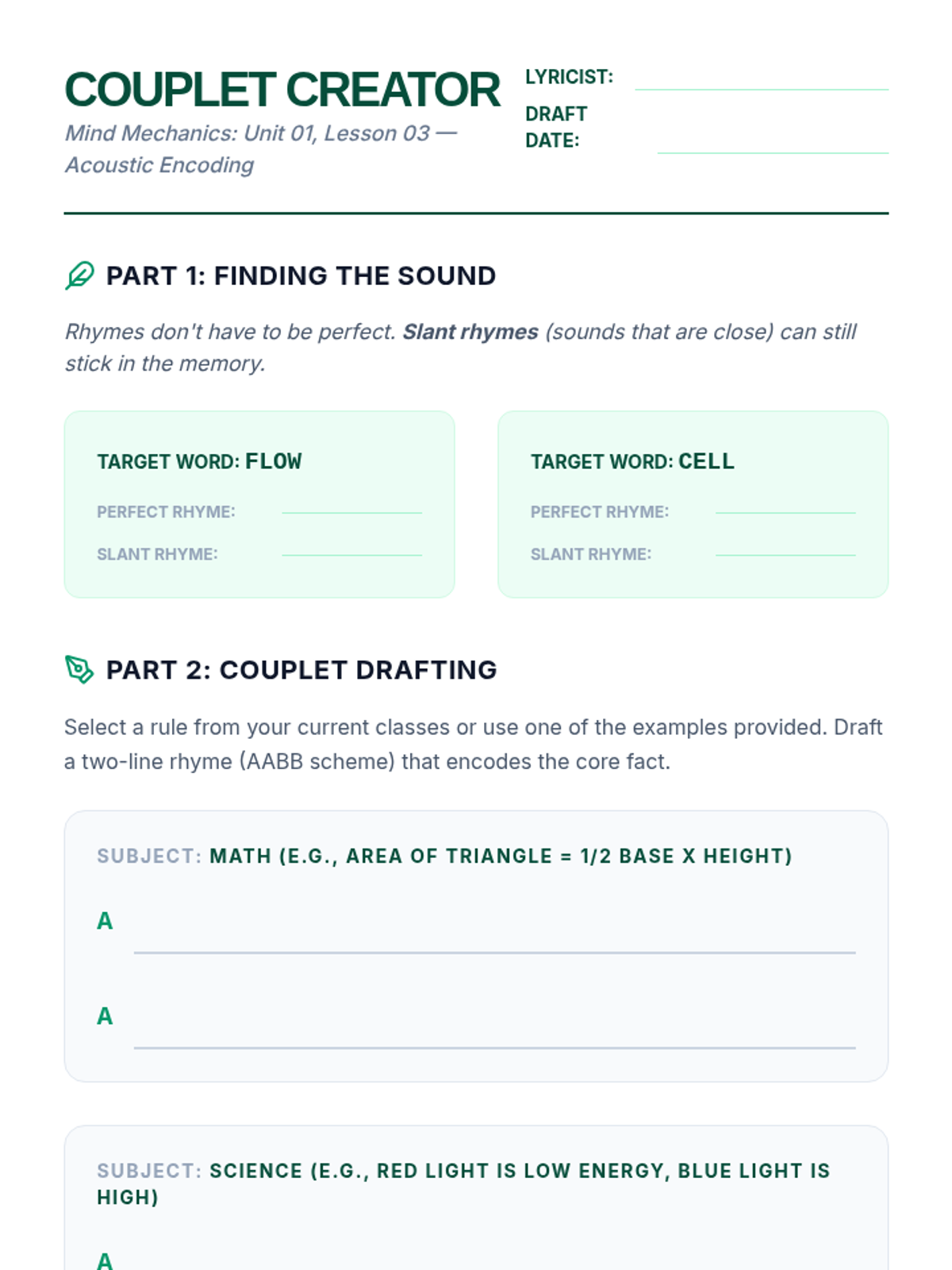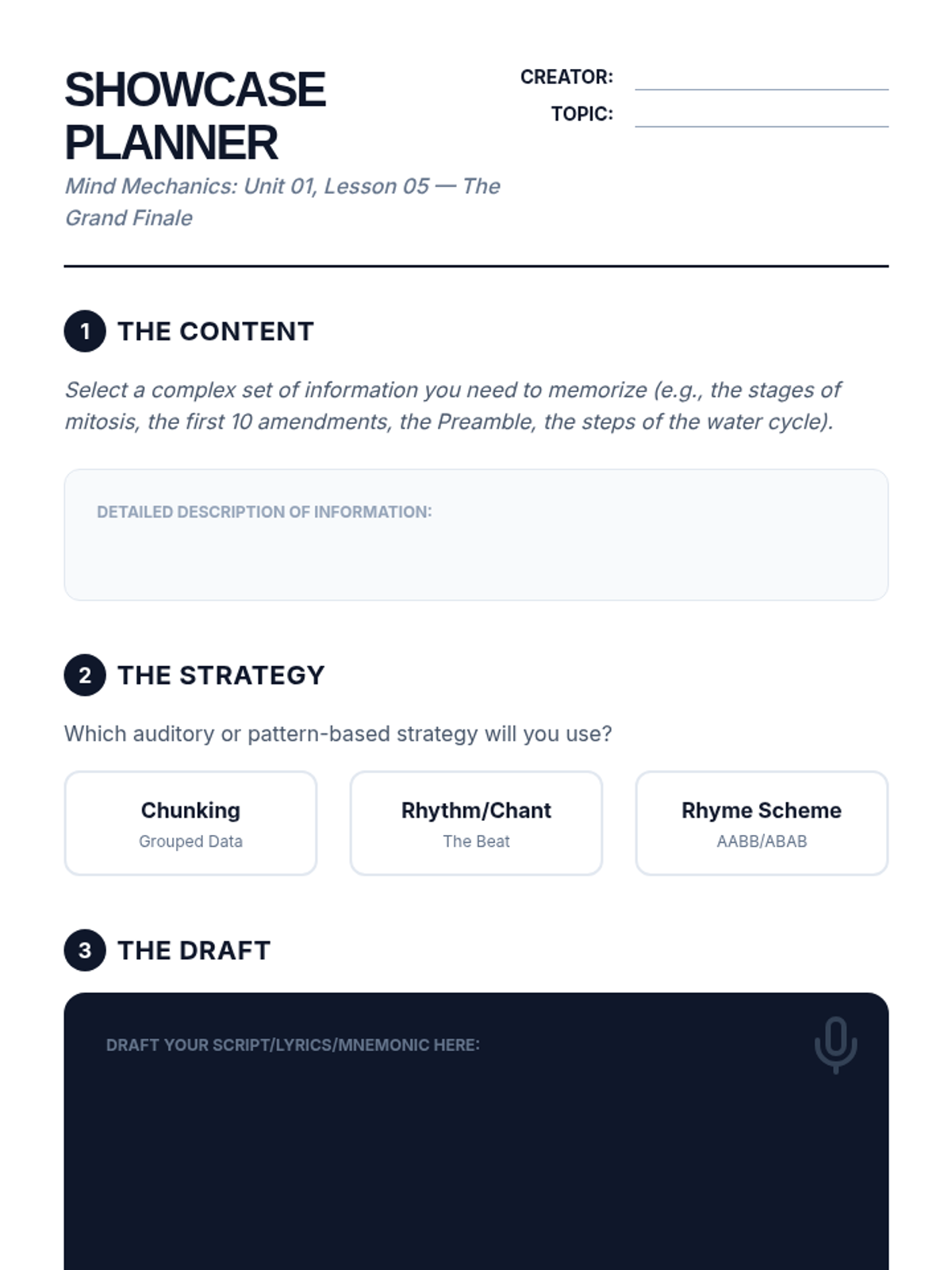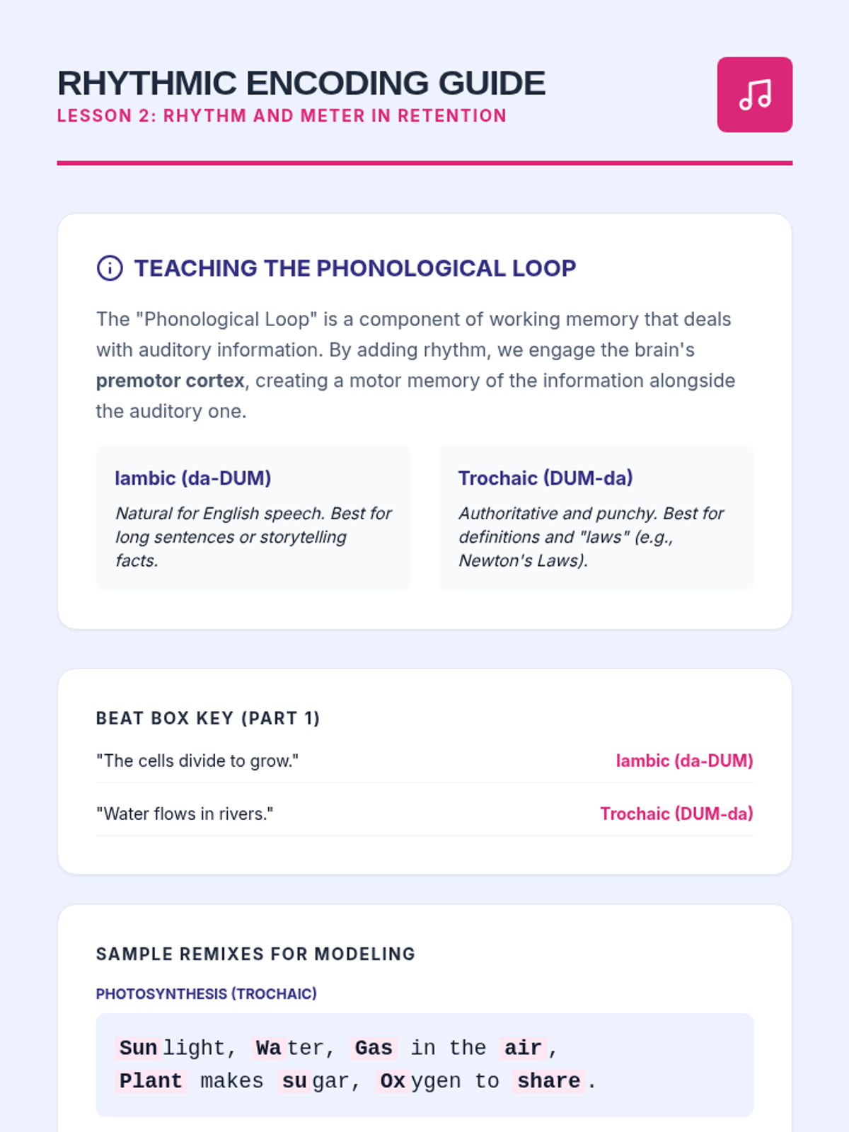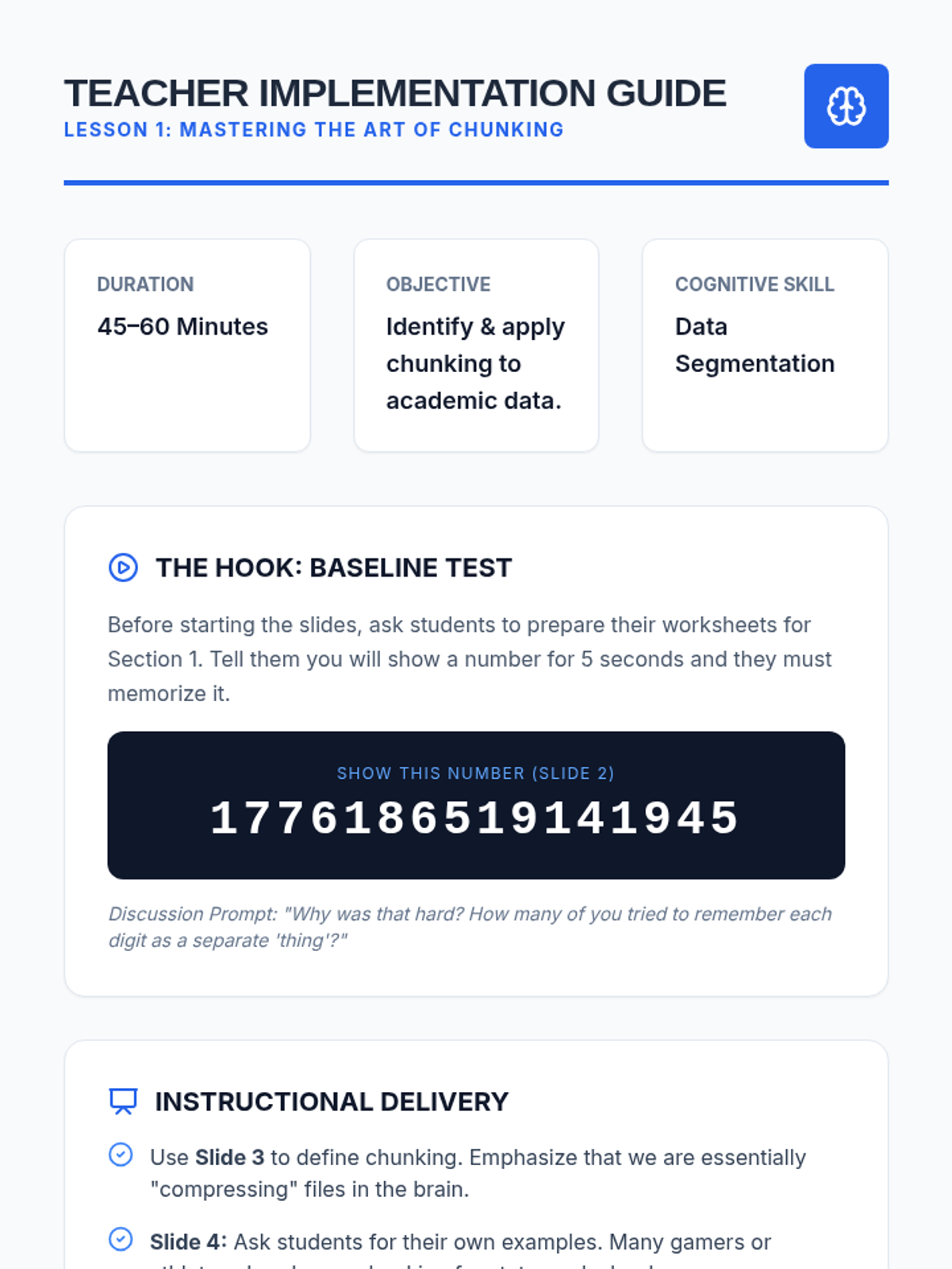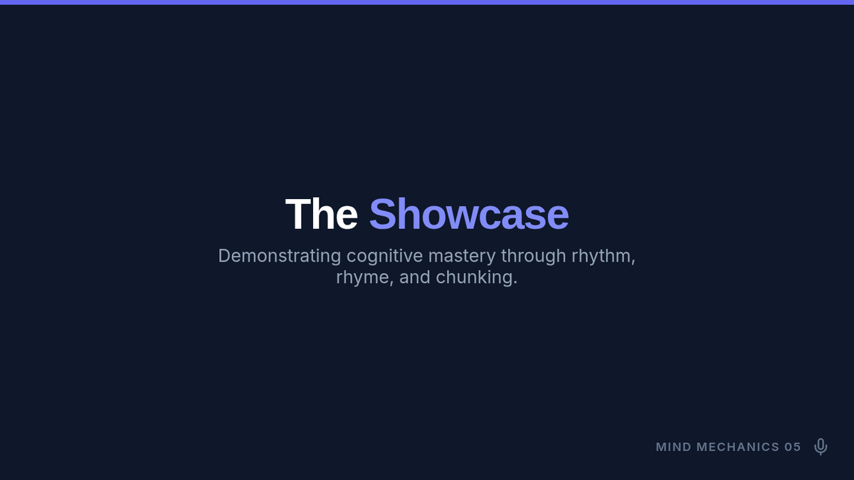 A specialized sequence for 10th-grade students focusing on utilizing chunking and auditory strategies to overcome working memory limitations. Students learn to apply sophisticated cognitive tools like data segmentation and rhythmic encoding to academic content.