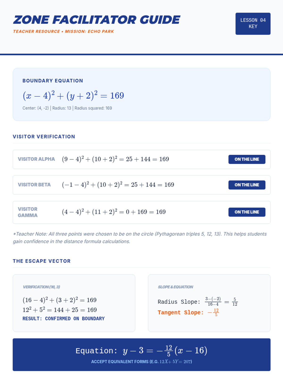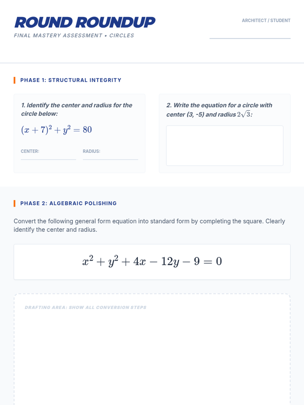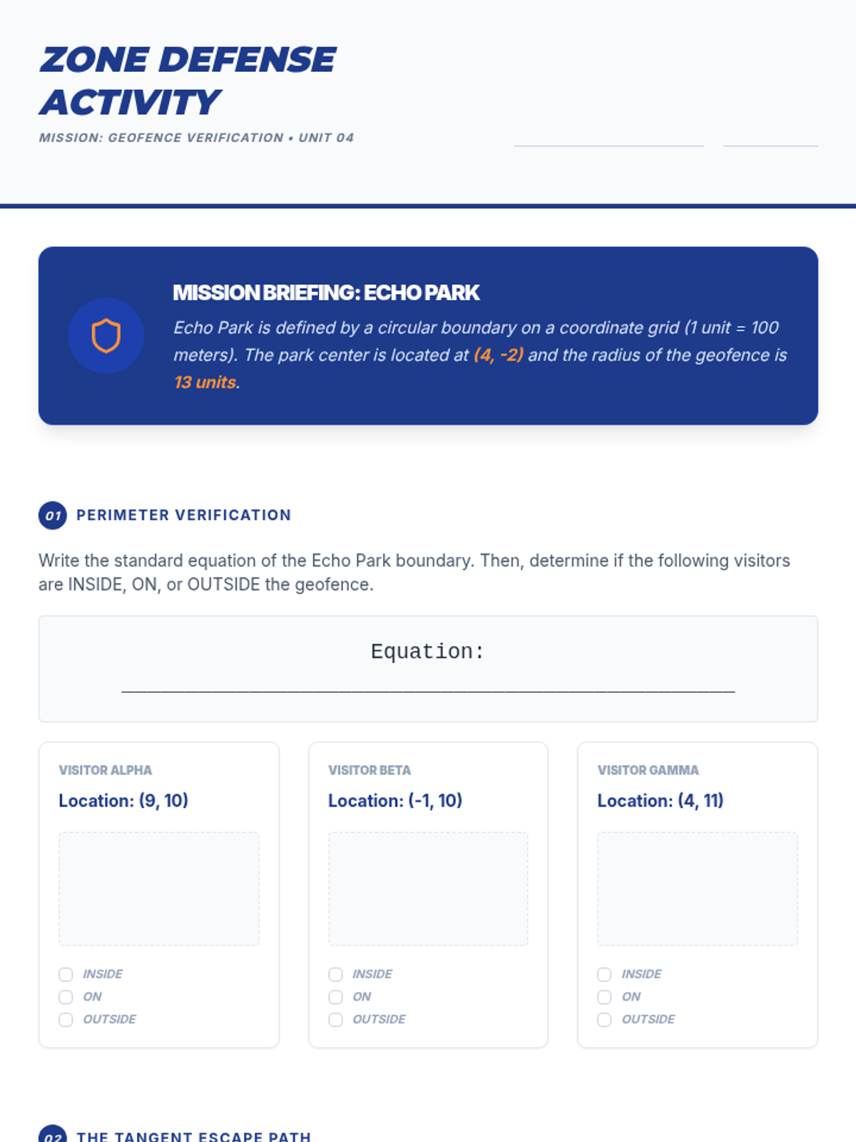 This sequence explores the geometric and algebraic properties of circles. Students progress from defining a circle as a locus of points to deriving its standard equation, converting between forms by completing the square, and solving complex coordinate geometry problems involving tangents and geofencing.