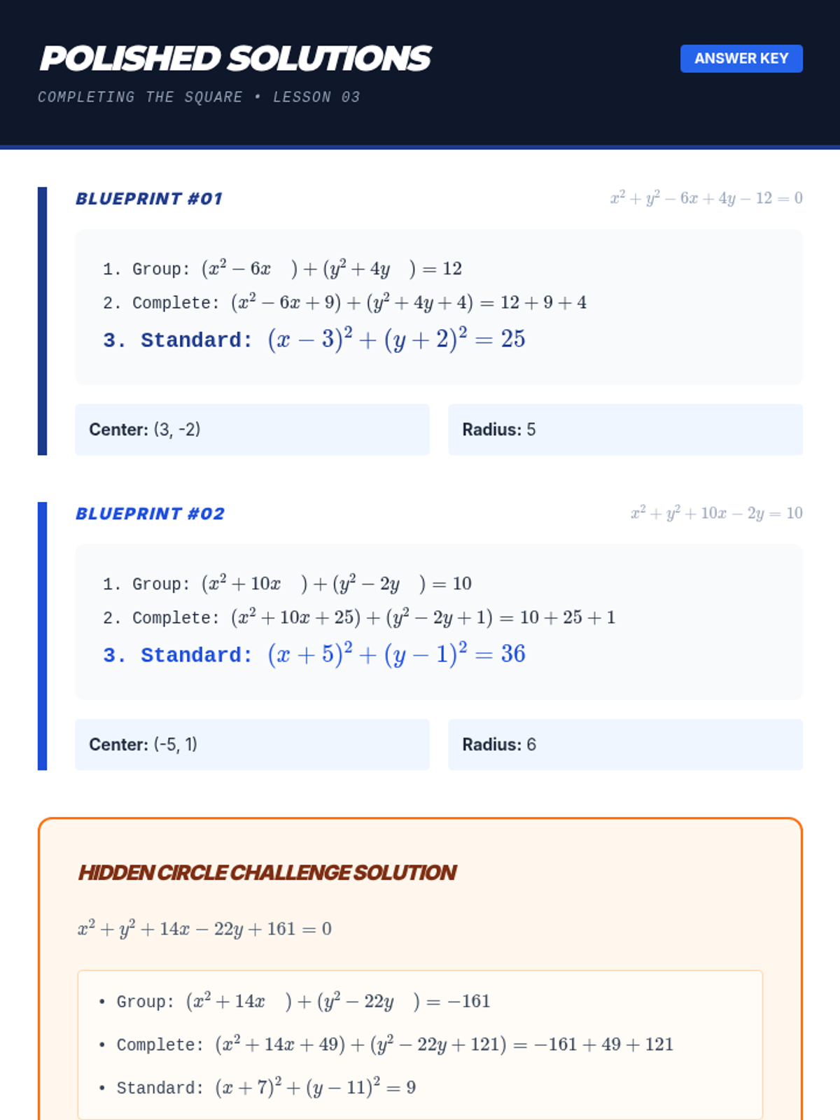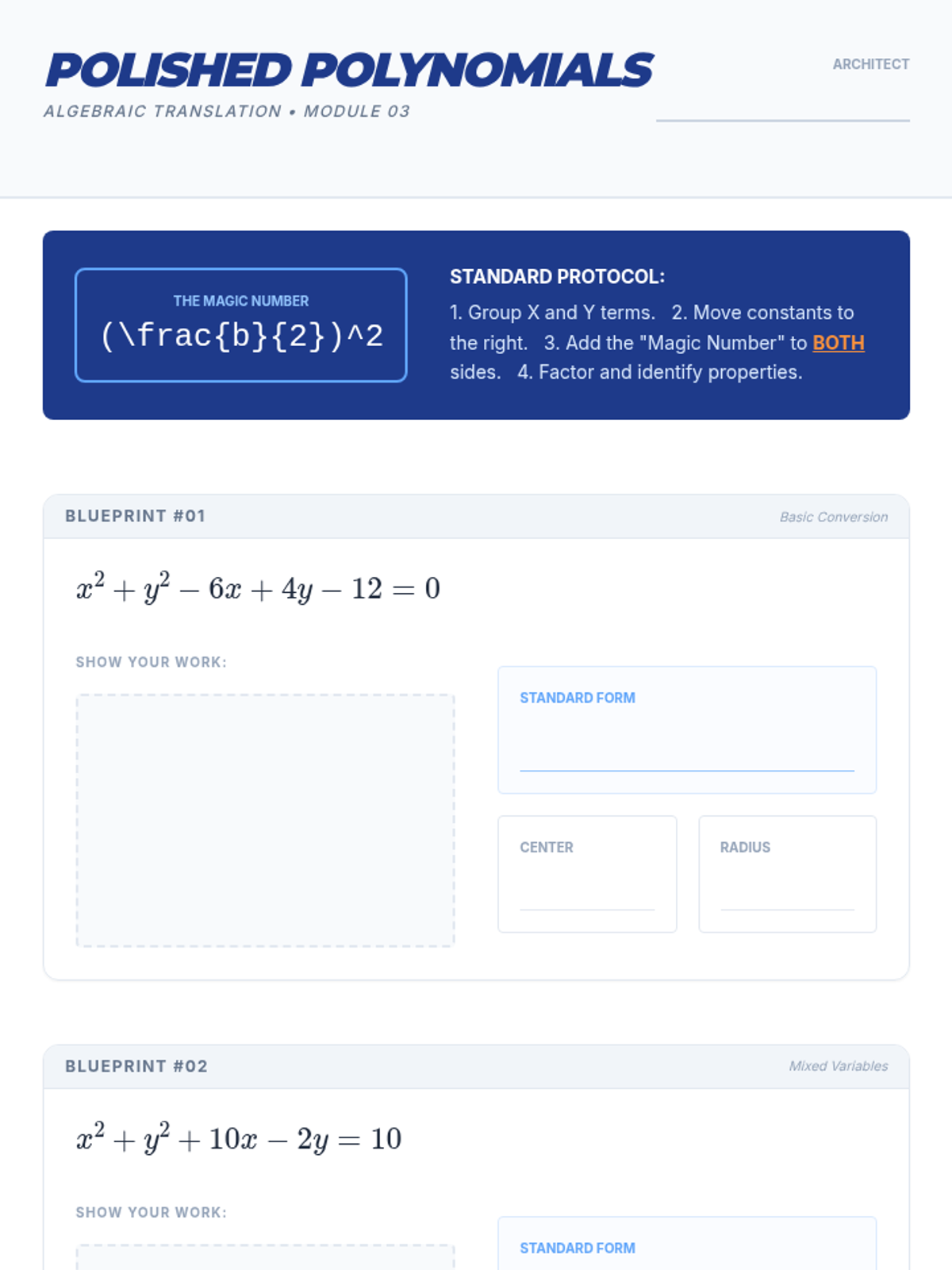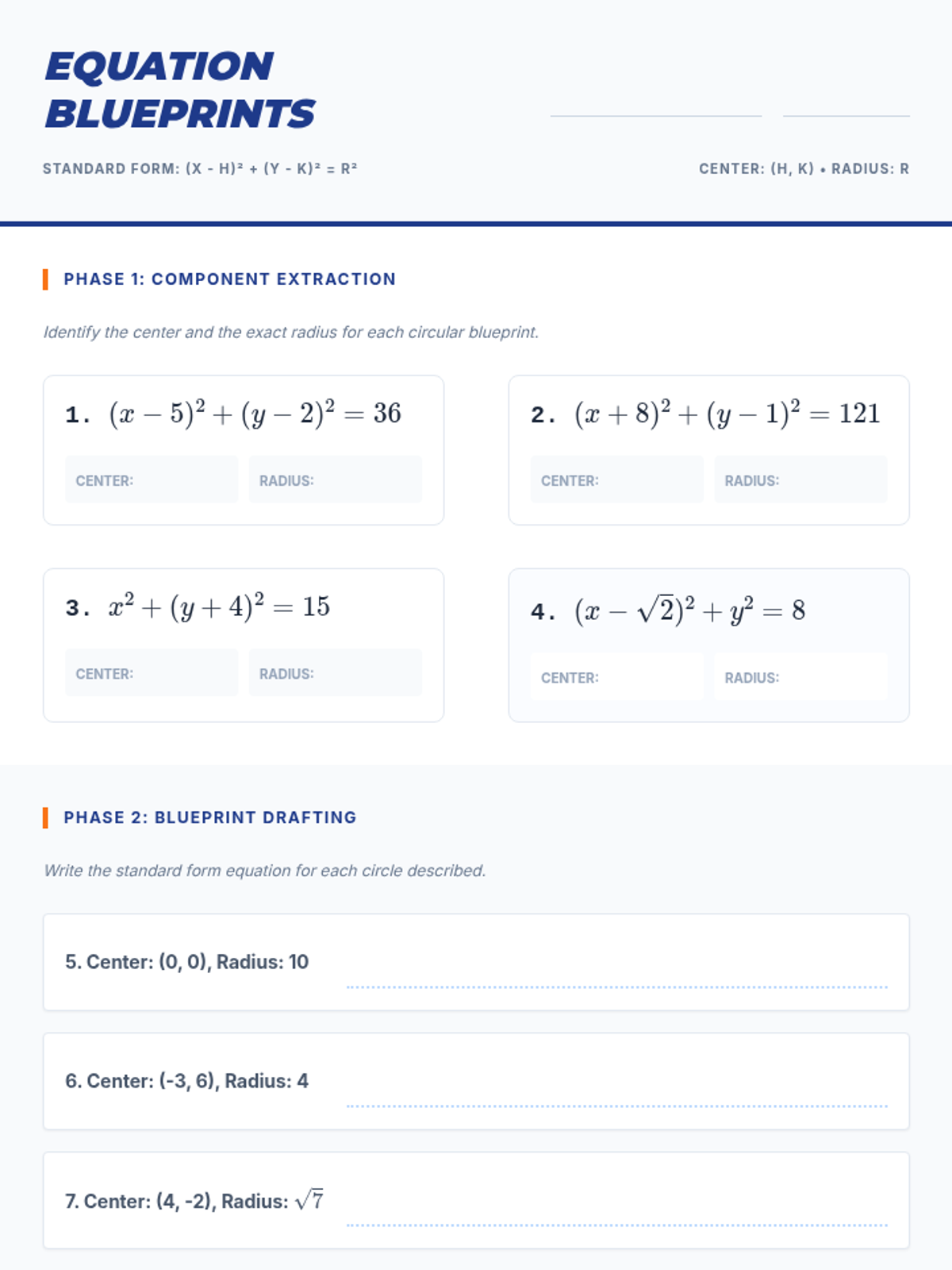 This sequence explores the geometric and algebraic properties of circles. Students progress from defining a circle as a locus of points to deriving its standard equation, converting between forms by completing the square, and solving complex coordinate geometry problems involving tangents and geofencing.
