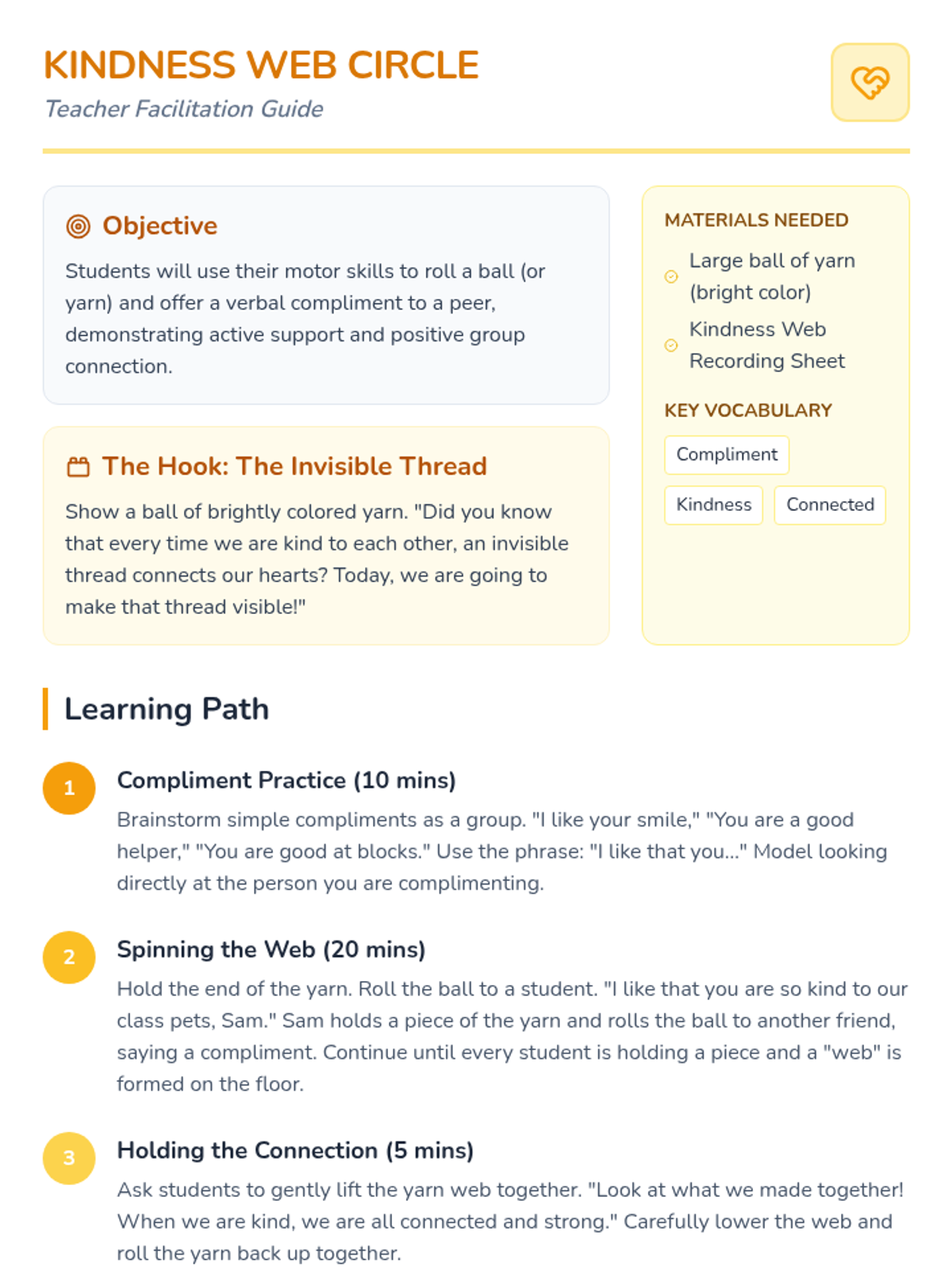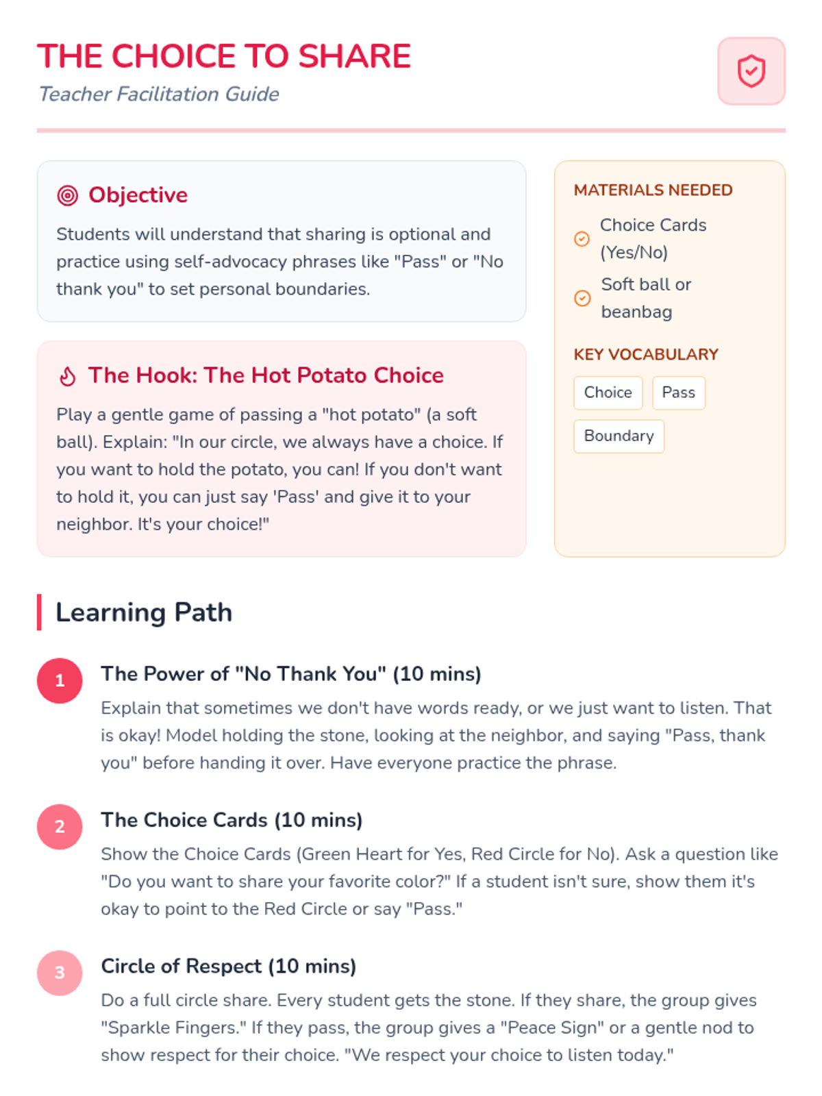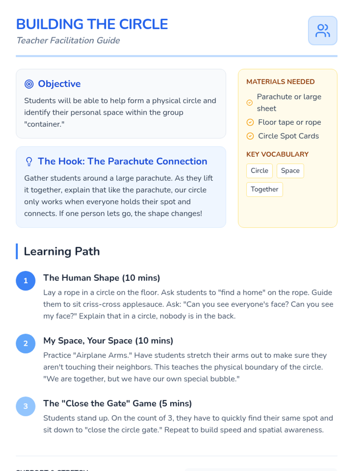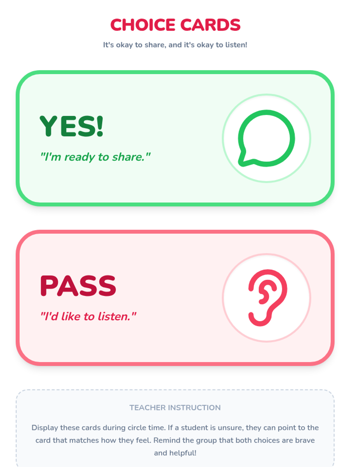 A Pre-K sequence designed to establish circle time rituals and teach turn-taking, active listening, and non-verbal support in a group setting. students learn the physical and social mechanics of a supportive sharing environment.