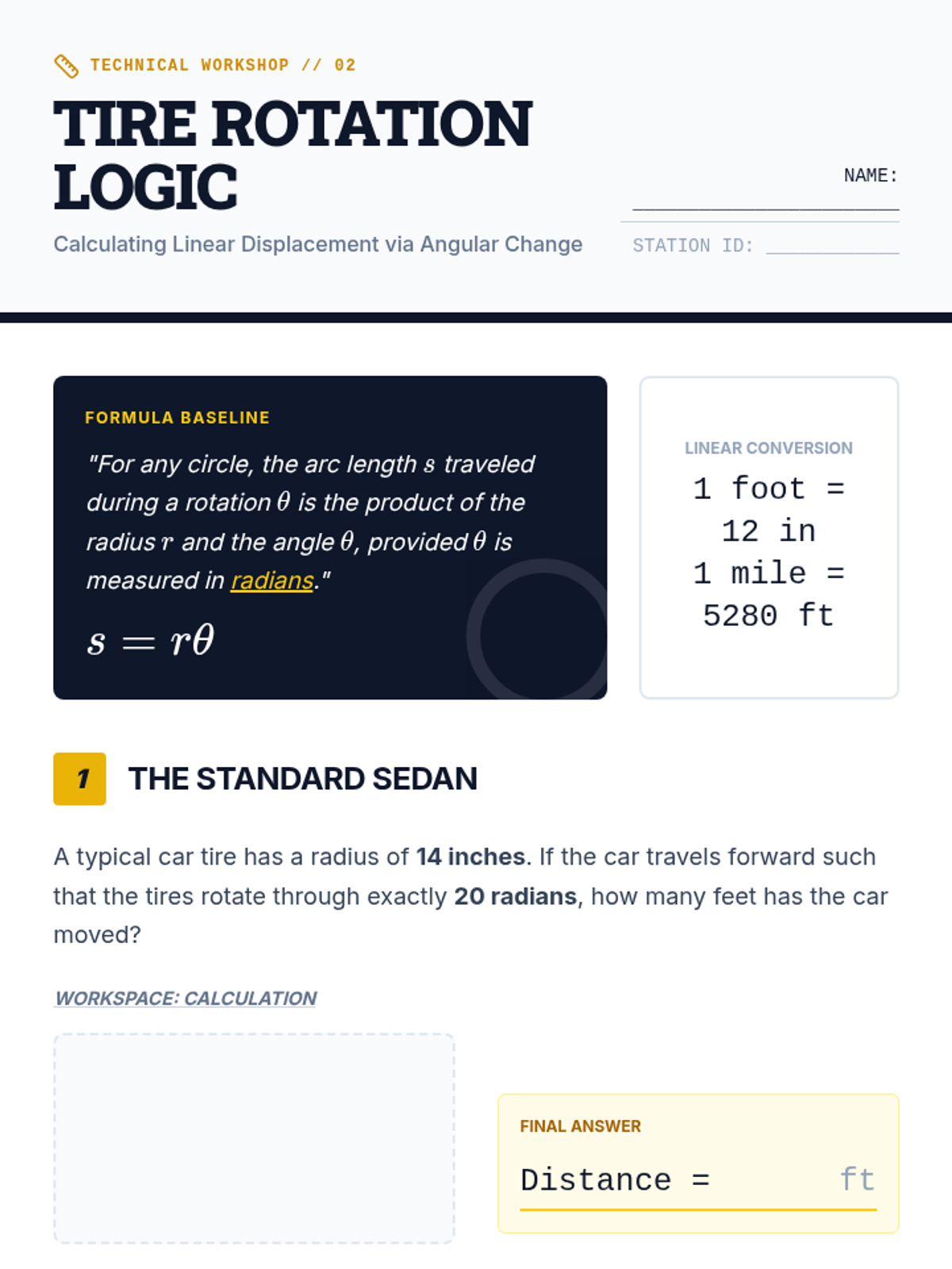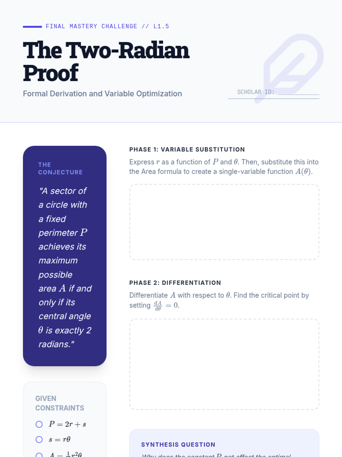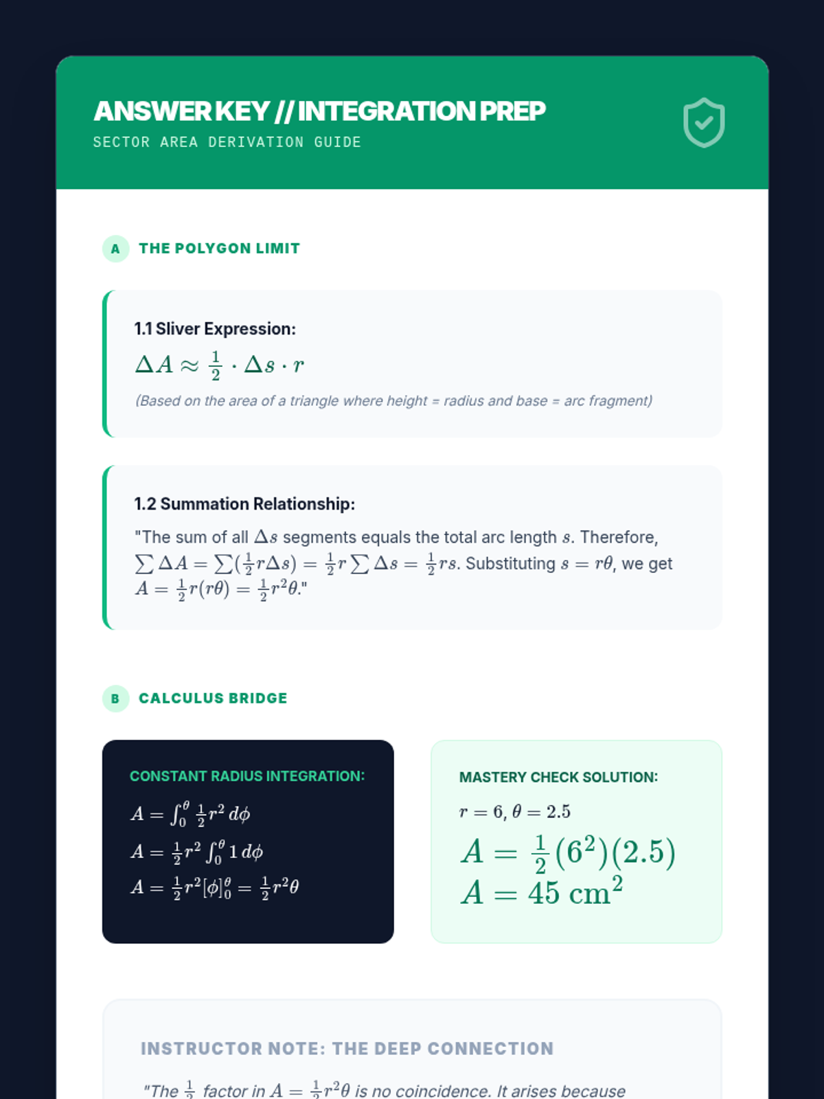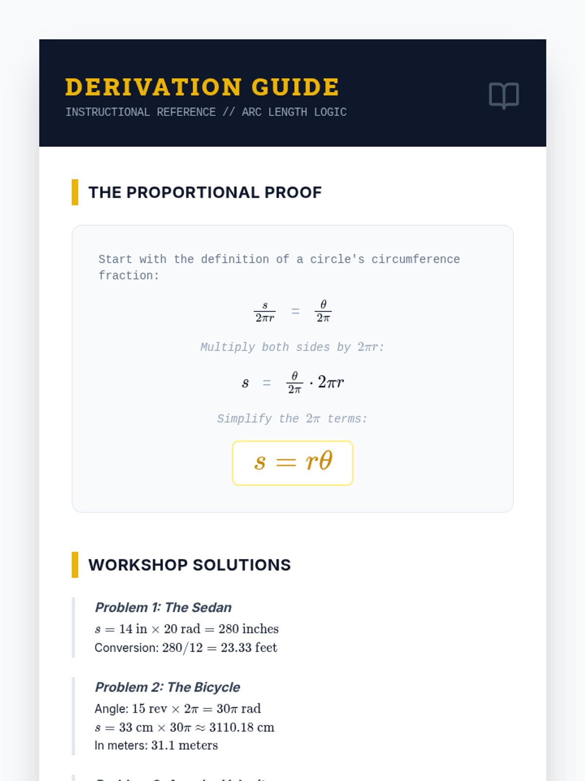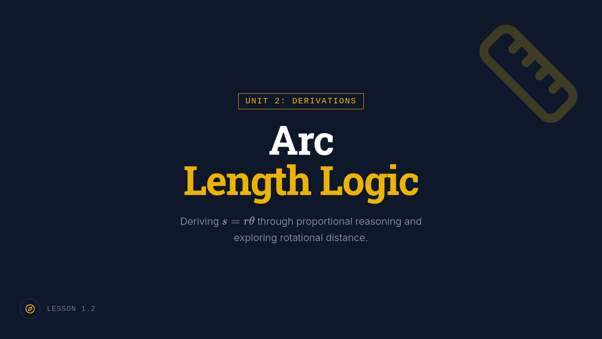 This undergraduate sequence explores the transition from degree-based geometry to the more 'natural' radian measure, focusing on the derivation of arc length and sector area formulas through proportional reasoning. Students will connect these geometric concepts to calculus preparation, analyze engineering errors, and perform formal abstract proofs.